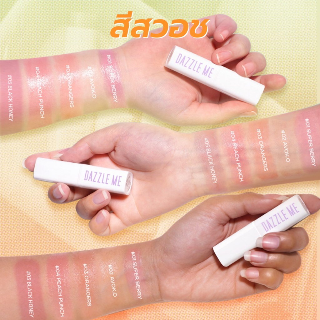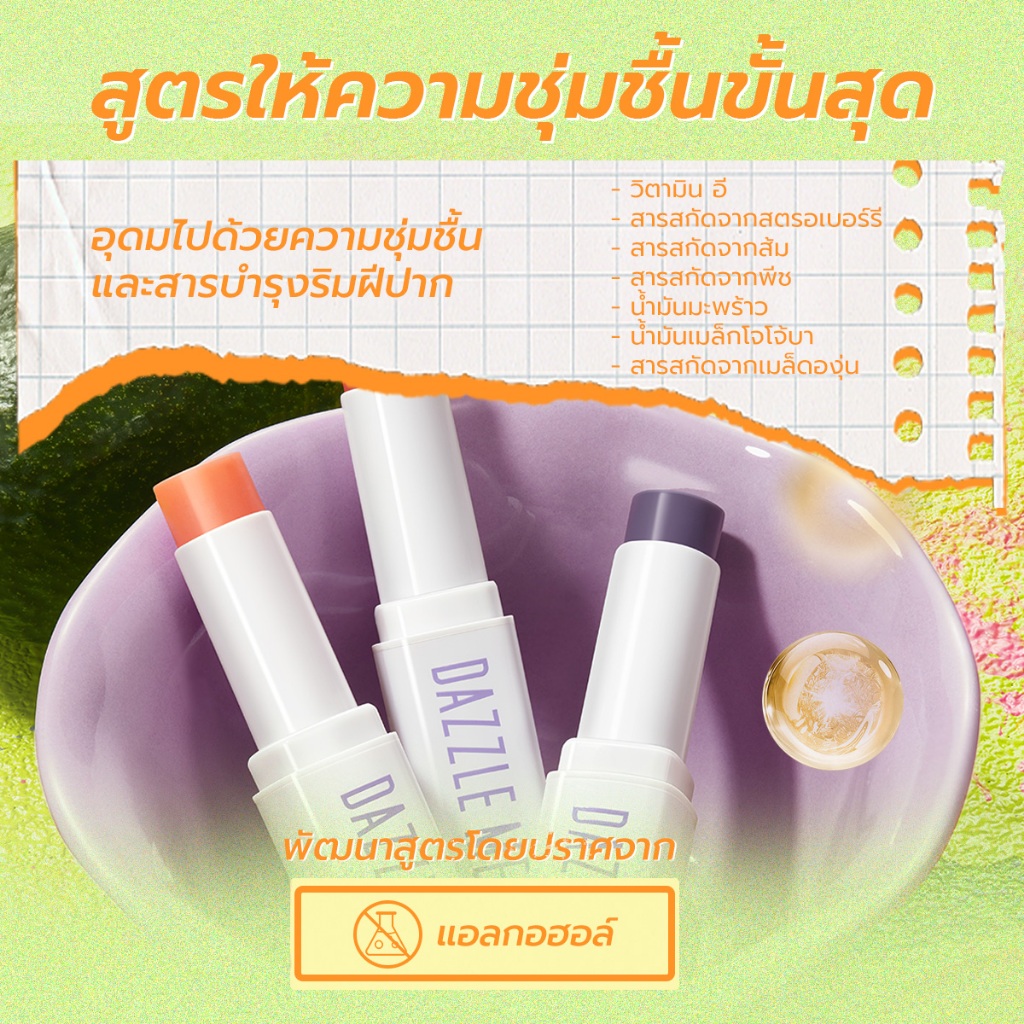 ... ว ทาบางๆเพื่อมอบความชุ่มชื้นให้กับริมฝีปาก หรือทาให้หนาขึ้นเพื่อการบำรุงที่ล้ำลึก และมีเทคโนโลยีช่วยปรับสีริมฝีปากเพื่อริมฝีปากที่สวยสดใสแลดูเป็นธรรมชาติ 🍑สารสกัดจากผลไม้ธรรมชาติ ประกอบด้วยวิตามินอีซึ่งเป็นส่วนผสมที่ให้ความชุ่มชื้นและลดความหมองคล้ำของริมฝีปาก และสารสกัดจากผลไม้ธรรมชาตินานาชนิดมอบความชุ่มชื้นอย่างล้ำลึก เพื่อริมฝีปากที่นุ่มและอวบอิ่มตลอดวัน 👄คืนความชุ่มชื้นให้กับริมฝีปากอย่างอ่อนโยน ด้วยสารสกัดจากผลไม้ธรรมชาตินานาชนิดและสารสกัดจากน้ำผึ้ง ช่วยให้ริมฝีปากชุ่มชื้นสดใส พร้อมคืนความชุ่มชื้นให้กับริมฝีปากที่แห้งลอกเป็นขุยเพื่อริมฝีปากที่แลดูสวยสุขภาพดีในชั่วข้ามคืน สามารถใช้เป็นลิปไพรเมอร์ก่อนแต่งหน้าได้ 🍓🍊🍑วิตามินอีธรรมชาติและสารสกัดจากสตรอว์เบอร์รี่ ส้มและพีช อุดมด้วยคุณค่าทางสารอาหารที่ช่วยบำรุงริมฝีปากที่หมองคล้ำให้กลับมาชุ่มชื้นสดใส 🥥น้ำมันมะพร้าวและน้ำมันเมล็ดโจโจ้บา เติมเต็มร่องริมฝีปากและเติมความชุ่มชื้นให้กับริมฝีปากที่แห้งแตกลอกเป็นขุย เพื่อการบำรุงอย่างล้ำลึก 0% พาราเบน, 0% แอลกอฮอล์, 0% น้ำมันแร่ หรือ สารที่ได้จากการกลั่นน้ำมันปิโตรเลียม 💫วิธีใช้ 1. สามารถใช้ทาเป็นลิปไพรเมอร์ก่อนการทาลิปสติกเพื่อเตรียมริมฝีปากให้พร้อมสำหรับการแต่งหน้า 2. สามารถพอกให้หนาขึ้นในเวลากลางคืนเพื่อการบำรุงริมฝีปากอย่างล้ำลึก 3. เทคโนโลยีการปรับสีตามค่า pH ของร่างกาย เพื่อริมฝีปากที่ดูสดใสเป็นธรรมชาติและสุขภาพดี ❗❗ข้อควรระวัง❗❗ สำหรับใช้ภายนอกเท่านั้น หยุดใช้ทันทีหากเกิดการระคายเคือง เก็บผลิตภัณฑ์ให้พ้นจากแสงแดดและบริเวณที่มี อุณหภูมิสูง และเก็บให้พ้นมือเด็ก #dazzlemelipbalm #ลิปบาล์ม #บํารุงริมฝีปาก #ปรับสีตามค่า PH #ธรรมชาติ #วิตามินอี #บํารุงริมฝีปาก #DMlipbalm #แดซเซิลมี