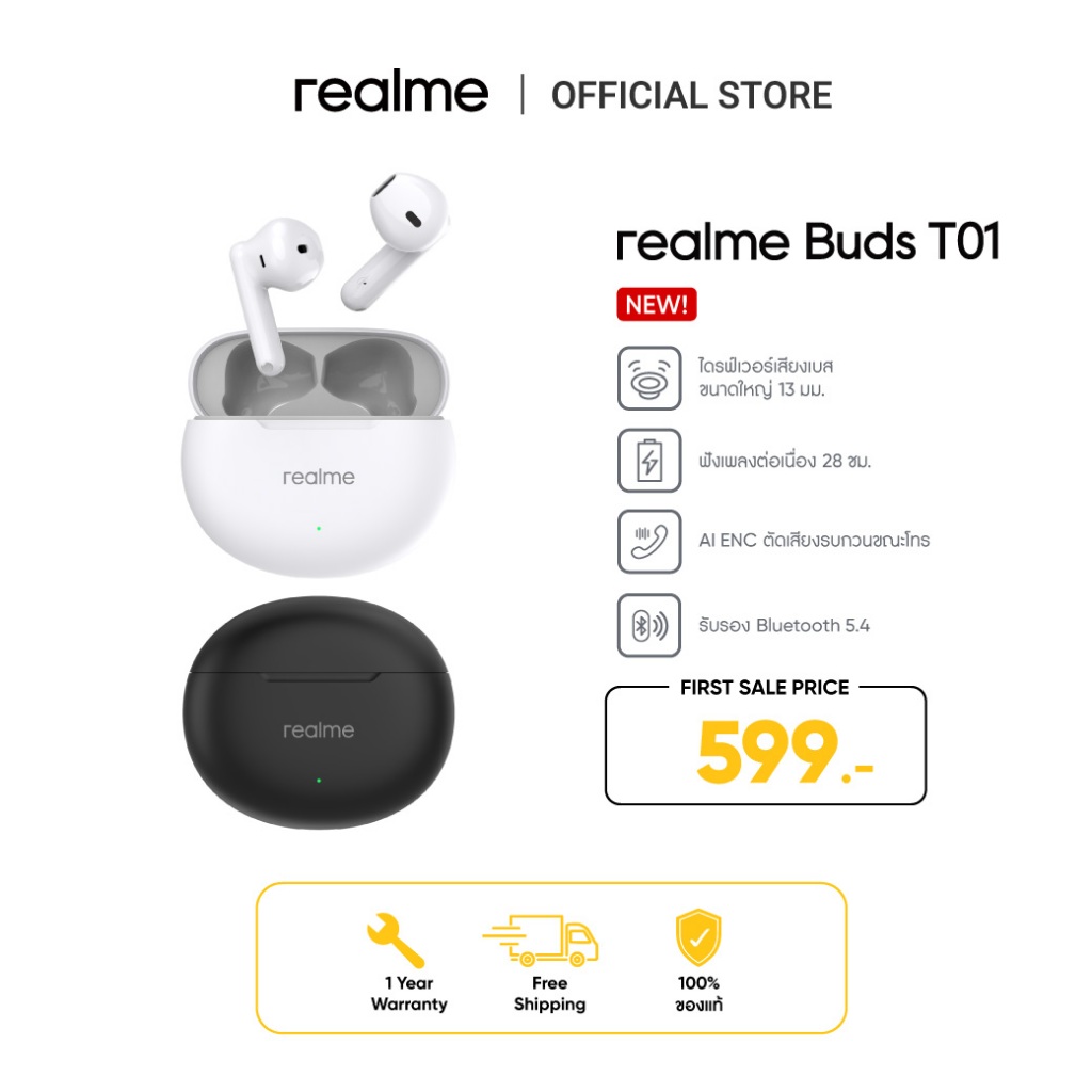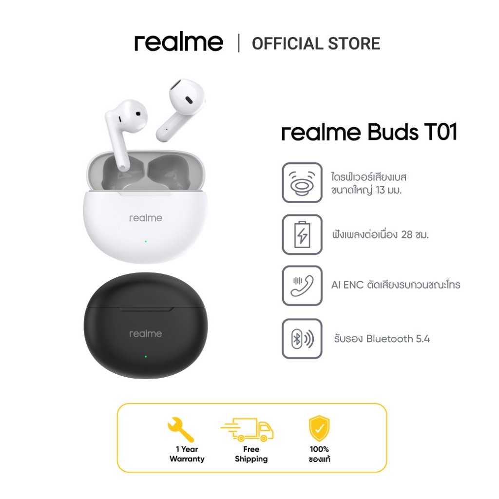 [New] realme Buds T01 | AI ENC ไดร์ฟเวอร์ขนาดใหญ่ 13 มม ใช่งานได้ยาว 28 ชม.