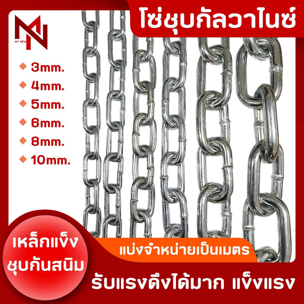 โซ่เหล็ก มีให้เลือกหลายขนาด - 3mm - 4mm - 5mm - 6mm - 8mm - 10mm แบ่งจำหน่ายเป็นเมตร เช่น หากลูกค้าสั่งซื้อ 5ชิ้นใน1คำสั่งซื้อ ทางร้านจะตัด1ชิ้น ยาว 5เมตร คุณสมบัติพิเศษ - ชุบกัลวาไนซ์(ชุบร้อน) ทนสนิมได้ดี ใช้งานได้ยาวนาน - ทุกห่วงเชื่อมแน่นไม่ขาดหลุดง่าย - ใช้ล่ามสิ่งของได้อย่างแน