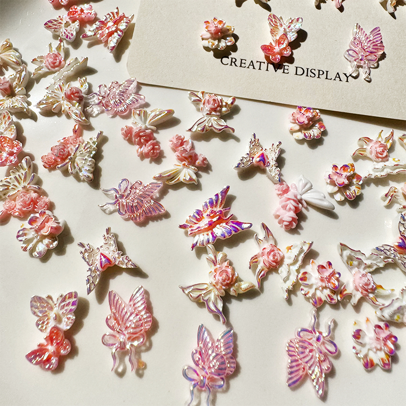 Rou Bao อุปกรณ์ตกแต่งเล็บเรซิ่น ลายการ์ตูนผีเสื้อ เอลฟ์ โบว์ สีชมพู สีขาว DIY 50 ชิ้น