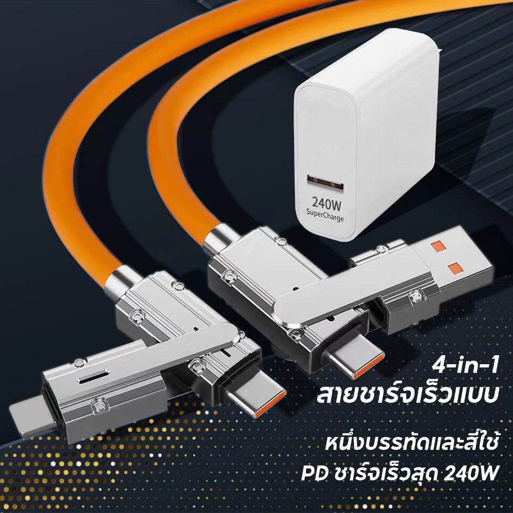 สายเคเบิลความเร็วสูงพิเศษ 4-in-1 240W | การชาร์จที่รวดเร็วเป็นพิเศษ 4-in-1, 240W 1. สายเคเบิล USB-A เป็น IP* 2. USB-C เป็น USB-A เพื่อพิมพ์ C 3. สาย USB-C ถึง USB-C 4. สาย USB-C คือ ip* อินเทอร์เฟซโลหะผสม [วัสดุคุณภาพสูง] ทนทานสูง ช่วยป้องกันไม่ให้เคลือบสังกะสีหลุด