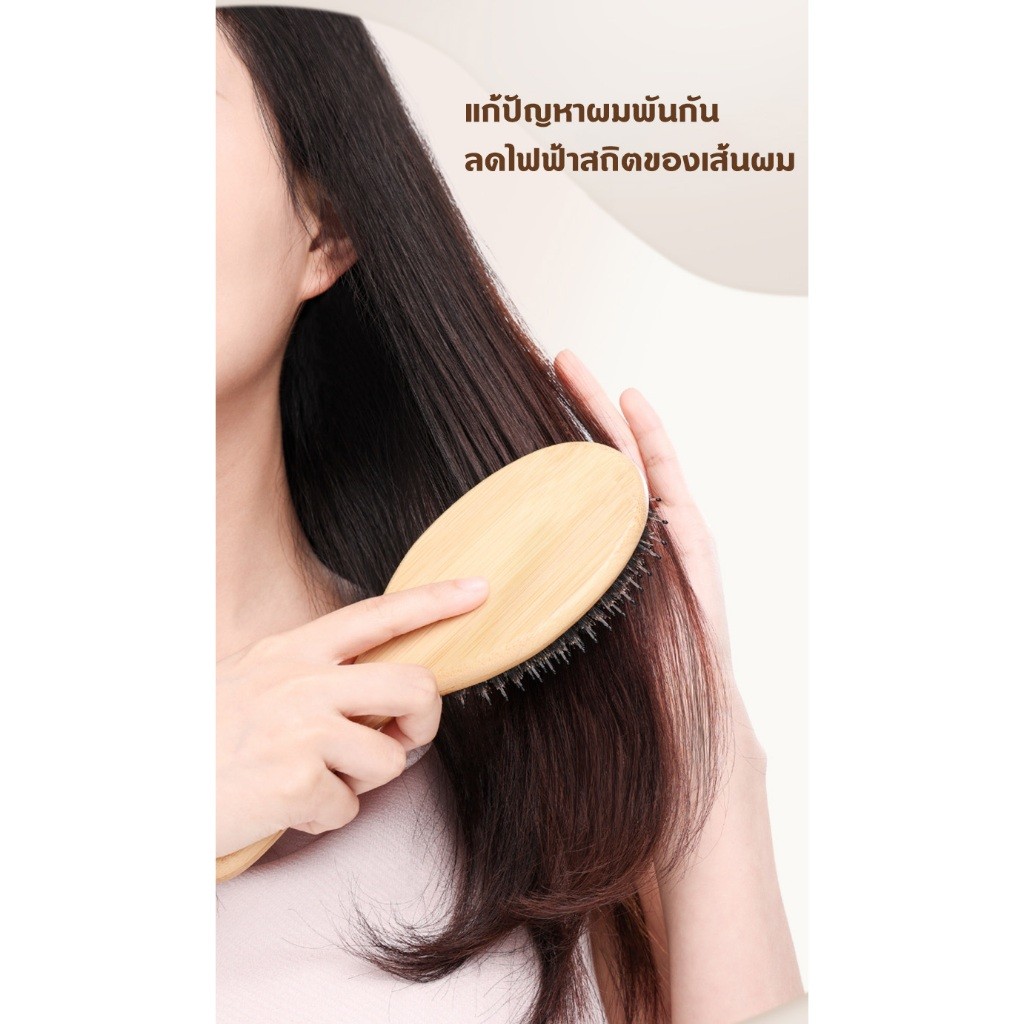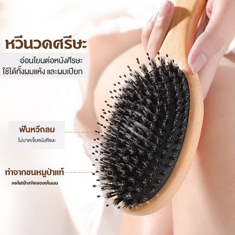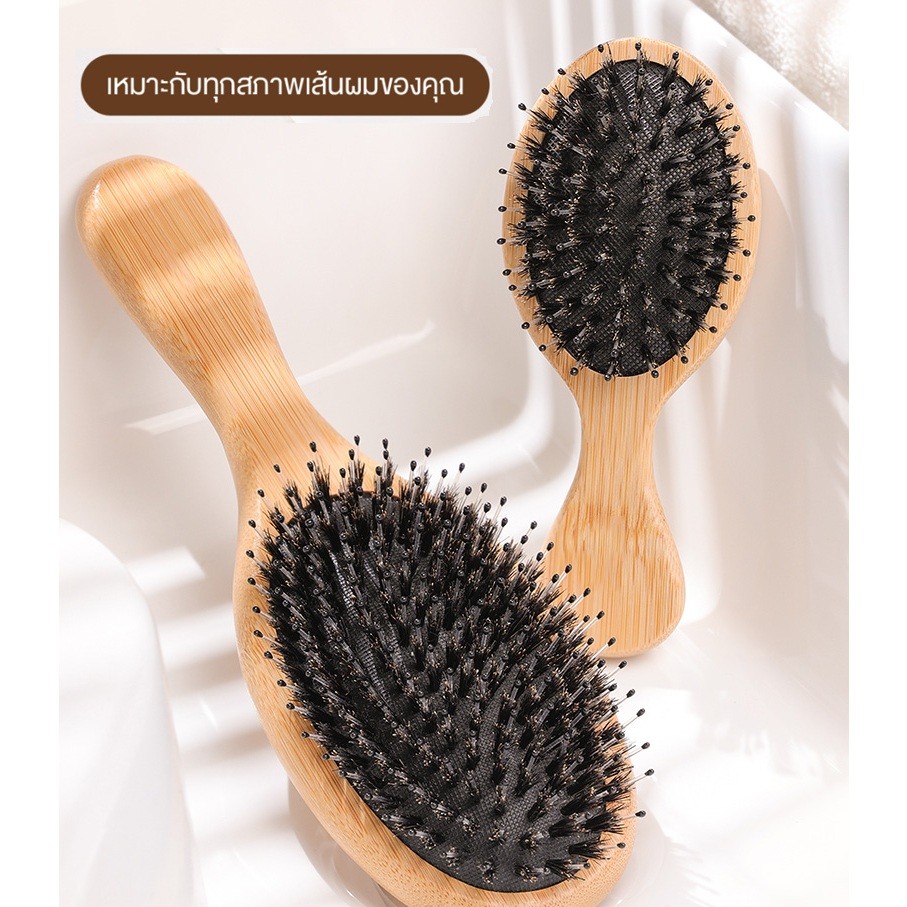 Hairbrush หวีขนหมูป่าแท้ ขนหมูอัดแน่น หวีลดผมร่วง ช่วยให้ผมเงางาม แก้ผมพันกัน นวดหนังศีรษะ หวีผม หวีไม้ ไม่ติดผม