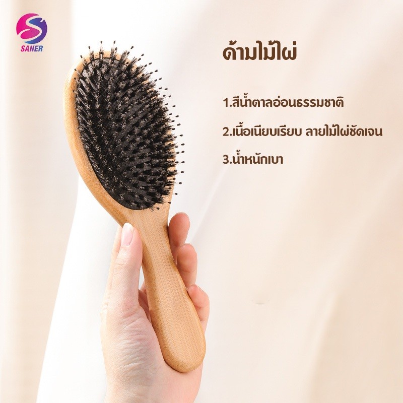 Hairbrush แปรงหวีไม้ขนหมูเเท้  หวีนวดศรีษะ ด้ามแปรงทำจากไม้บีช ขนแปรงอัดแน่นด้วยขนหมูแท้ช่วยหวีผมให้เงางาม เรียงเส้นสวย คุณภาพดี  และช่วยลดผมร่วง แก้ปัญหาผมพันกัน ลดไฟฟ้าสถิตของเส้นผม    คุณสมบัติ  • หวีขนหมูป่าแนะนำหวีตอนผมแห้ง  • หวีนวดศีรษะ มีรูระบายอากาศ  • ช่วยลดผมขาดหลุด