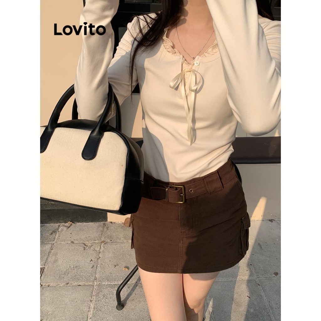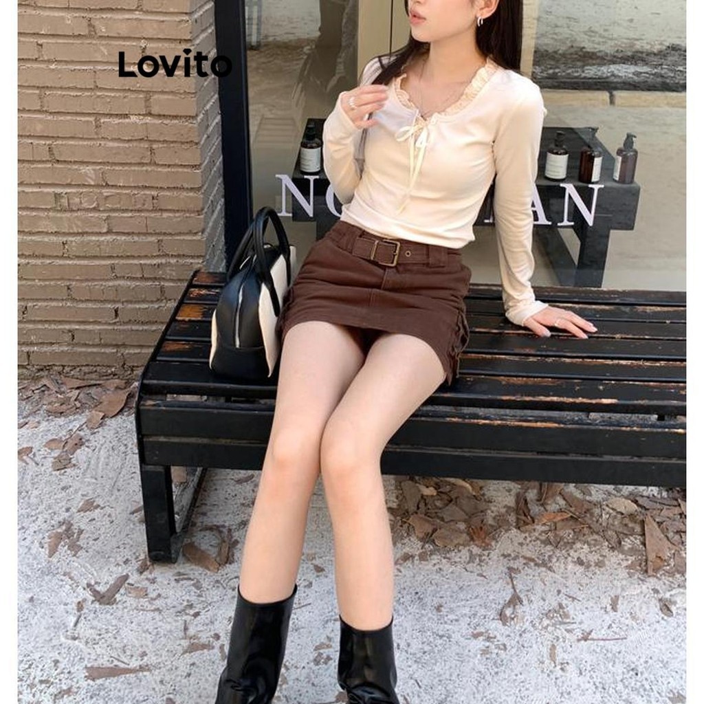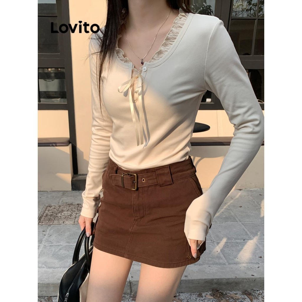 Lovito เสื้อยืดผู้หญิง ขอบหยัก ผูกเชือก สีพื้น สไตล์ลำลอง LNA43321