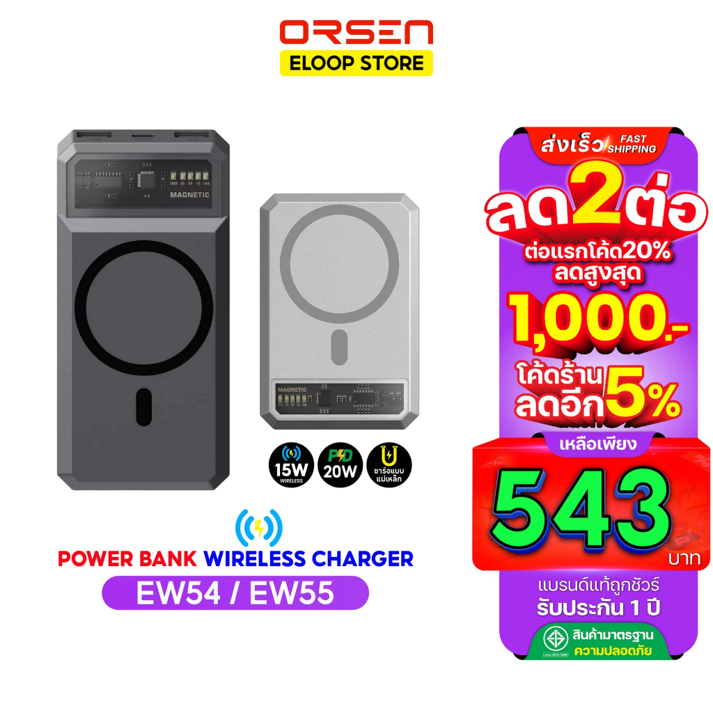 [543บ. โค้ดคุ้ม] Orsen Eloop EW54 EW55 ชาร์จแบบแม่เหล็ก แบตสำรองไร้สาย Magnetic Power bank แบตสำรอง