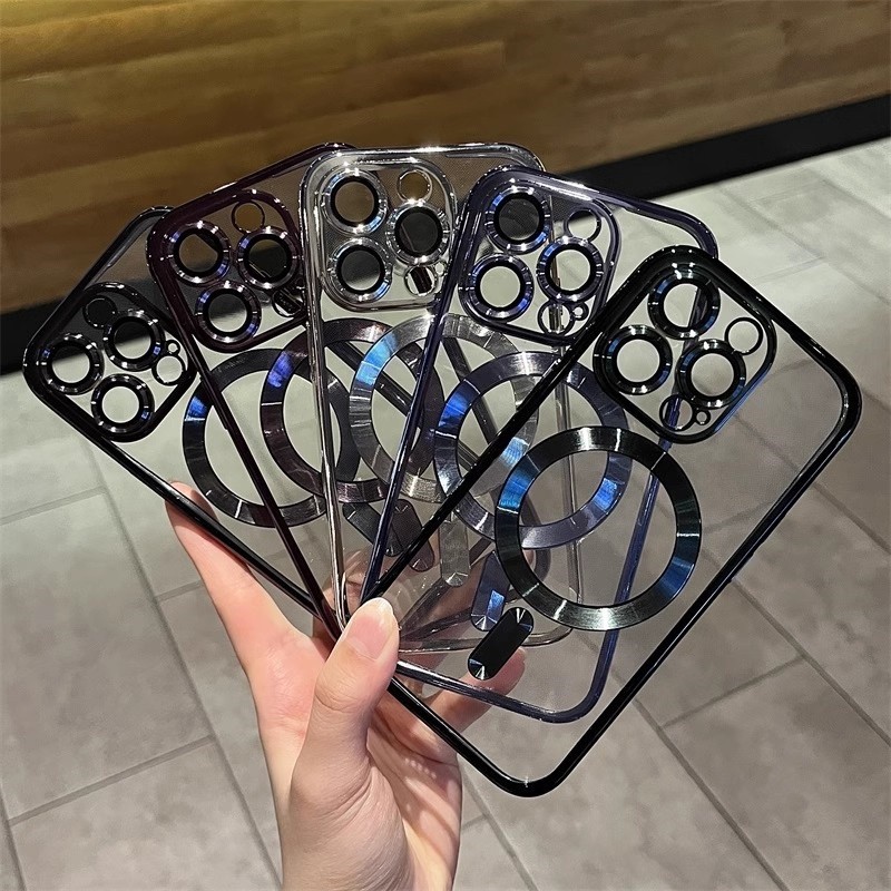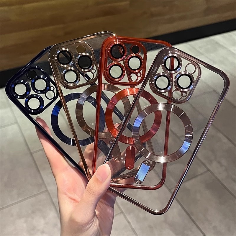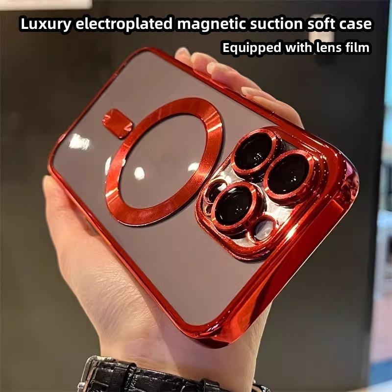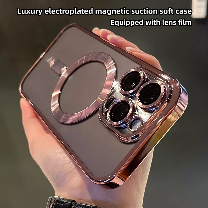 เหมาะสําหรับเคสโทรศัพท์ iPhone 16 Pro Max 16plus 14 15 13 Pro Max 11, เคสป้องกันโปร่งใสด้วยไฟฟ้าหรูหรา, พร้อมฟิล์มเลนส์, เปลือกนิ่มแม่เหล็ก