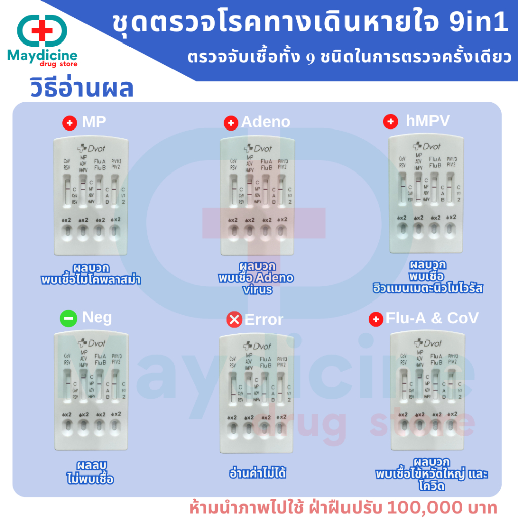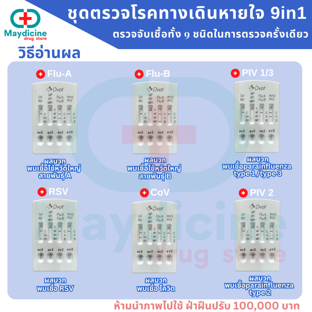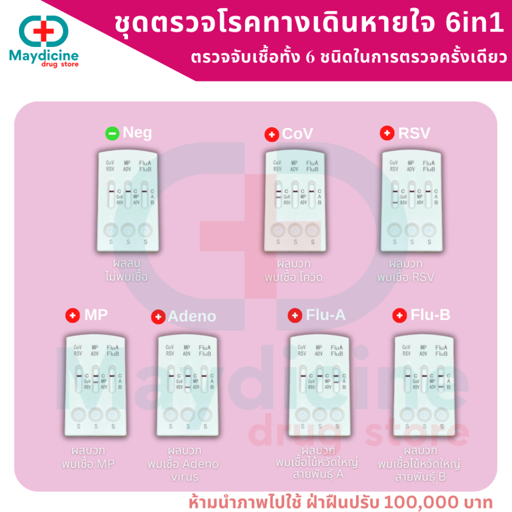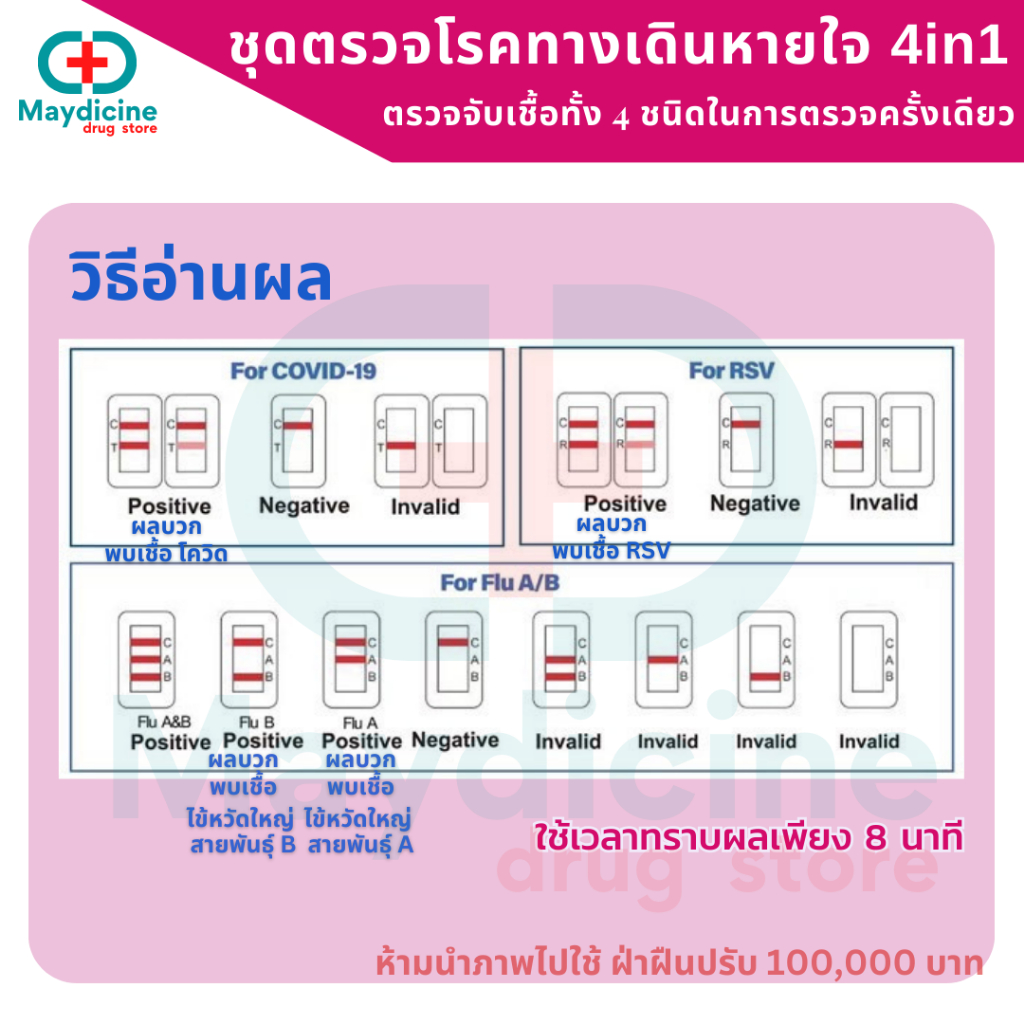 ชุดตรวจไข้หวัดใหญ่ Influ A/ Influ B/ RSV/ Covid-19/Adeno /MP ตรวจจับเชื้อไวรัส ทั้ง 4 ชนิดได้ในการตรวจครั้งเดียว อุปกรณ์ชุดทดสอบ 1 กล่อง ประกอบด้วย - แถบทดสอบ 1 แผ่นTest Strips มี 4 ช่องแสดงผล - น้ำยาสกัด ตรวจเชื้อไวรัส Covid-19, RSV และไข้หวัดใหญ่ A และ B Buffer 1 หลอด - ก้านสวอป ก้านสั้น เร