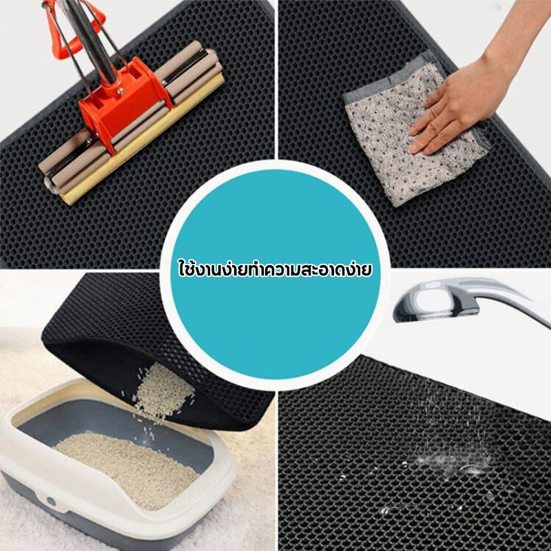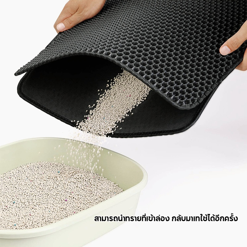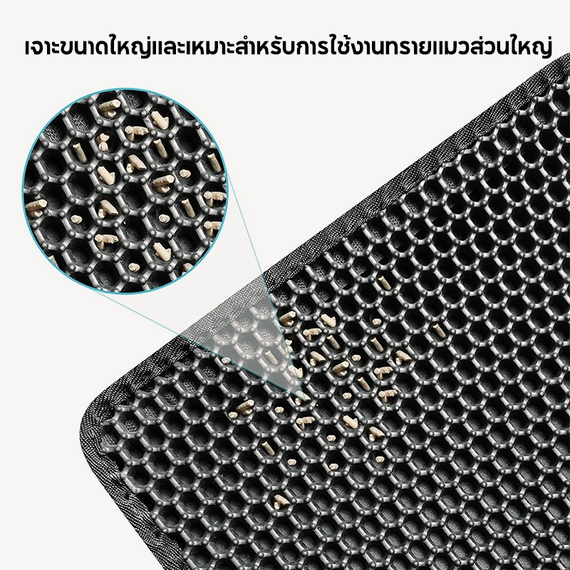 ... งแมวและแมวของคุณจะชอบความรู้สึกที่ได้เหยียบมัน โครงสร้างสองชั้น: การออกแบบเสื่อดักขยะรังผึ้งสองชั้นช่วยให้คุณรวบรวมขยะ คุณเพียงแค่ต้องหยิบแผ่นรองกระบะทรายขึ้นมา แล้วขยะทั้งหมดก็ตกลงไป แล้วทิ้งลงถังขยะเพื่อนำกลับมาใช้ใหม่ แผ่นรองกล่องสำหรับแมวกันน้ำและปัสสาวะ: ชั้นล่างกันน้ำและกันลื่นซึ่งจะไม่อนุญาตให้ของเหลวผ่านเข้าไปและเคลื่อนย้ายได้ง่าย ปกป้องพื้นไม้เนื้อแข็งและพรมของคุณจากคราบปัสสาวะที่น่ารังเกียจ ป้องกันไม่ให้ปัสสาวะของแมวเล็ดลอดไปได้ทุกที่ ใช้งานง่าย: วางแผ่นรองขยะไว้ใต้กระบะทราย เมื่อแมวของคุณออกจากกระบะทราย ทรายที่ติดอุ้งเท้าจะถูกดักจับภายในรูรังผึ้งขนาดใหญ่ที่ชั้นบนสุดของแผ่นรอง เศษขยะจะตกลงตามรูและติดอยู่ในชั้นป้องกันการรั่วซึมด้านล่าง ทำความสะอาดง่าย: ทิ้งขยะลงในกระบะทราย แล้วล้างด้วยน้ำหรือใช้เครื่องดูดฝุ่นแล้วเป่าให้แห้ง ประหยัดเวลาและแข็งแรง! ใช้งานได้ดีกับกระบะทรายแมว กล่องแมว และทรายแมวส่วนใหญ่