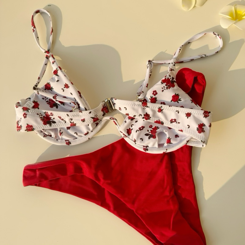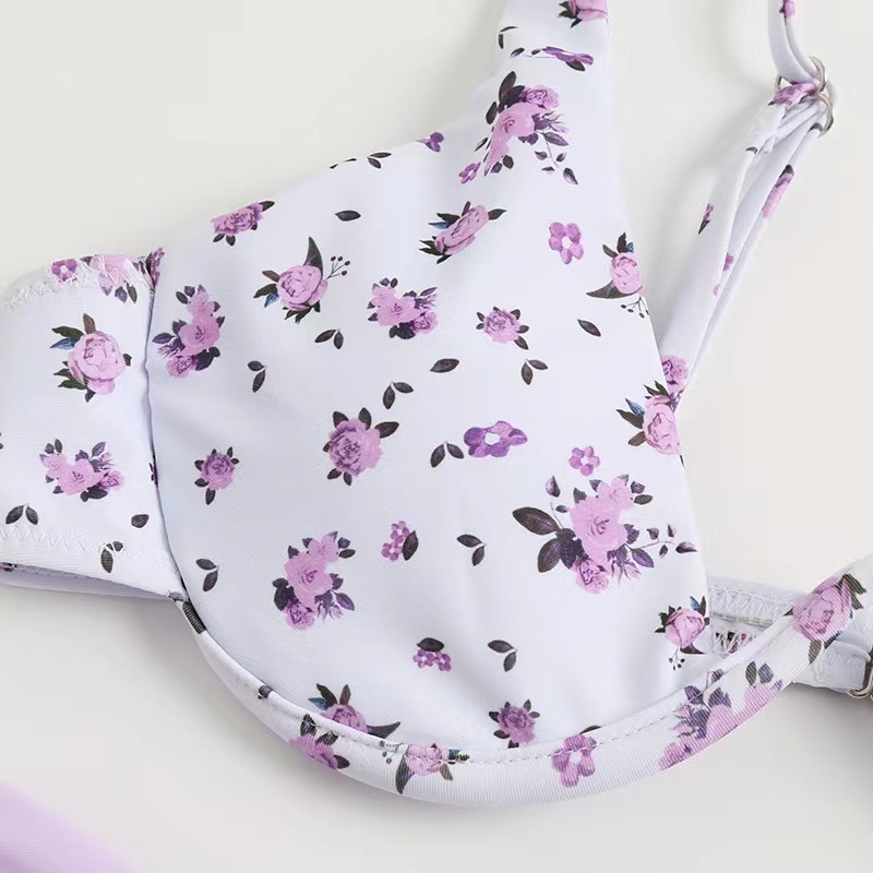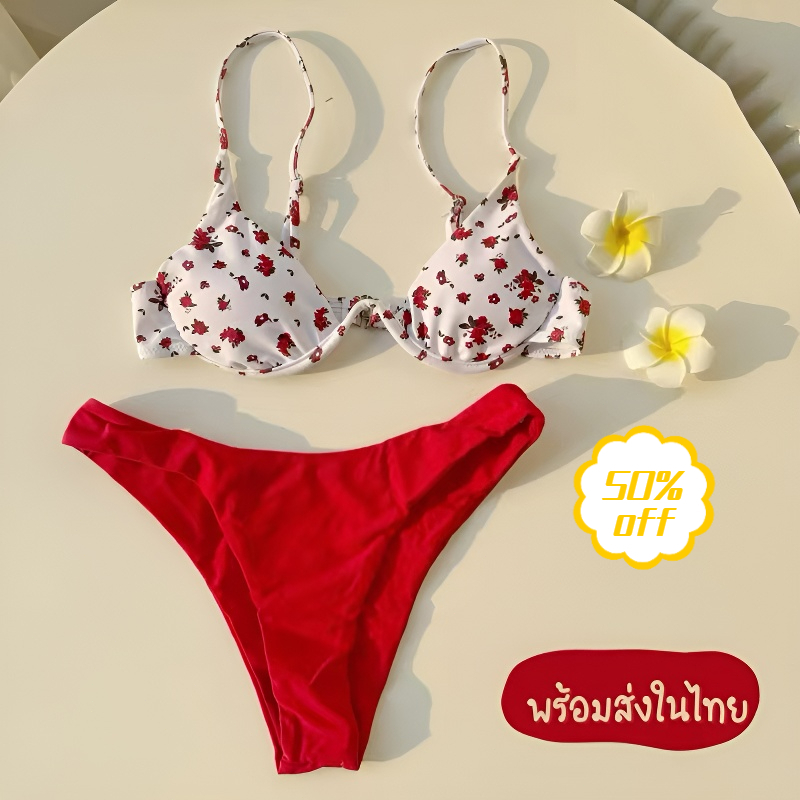 🌸Swift Bra🌸ชุดว่ายน้ำแฟชั่น ชุดว่ายน้ำสายฝอ เซ็ต2ชิ้น บิกินี่เซ็กซี่ มีโครง บราพิมพ์ลายดอกไม้ บิกินี่สองชิ้นน่ารักbikini