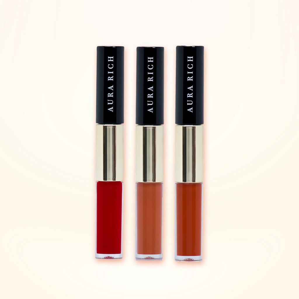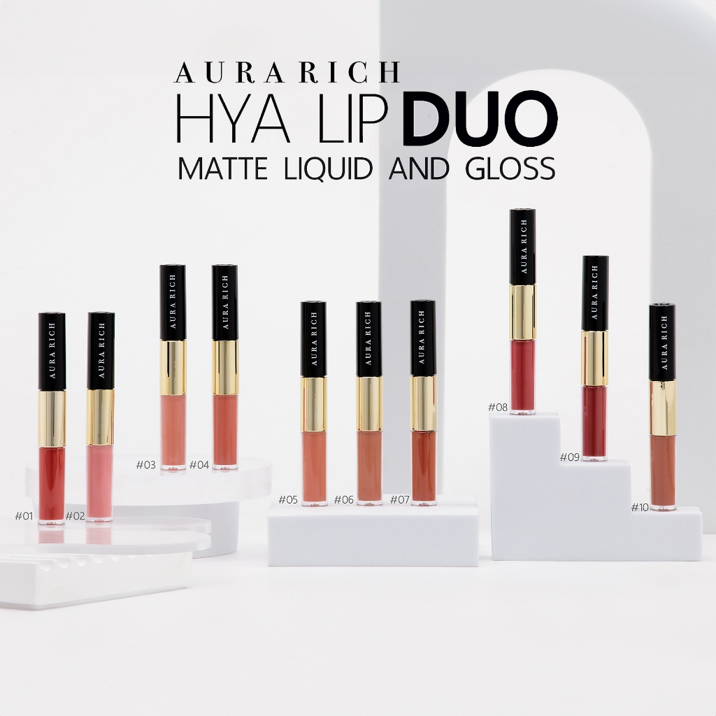 💄 ออร่า ริช ไฮยา ลิป ดูโอ ลิควิด แอนด์ กลอส 💋 AURA RICH HYA LIP DUO MATTE LIQUID AND GLOSS มิติใหม่ของการทาลิป เนรมิตริมฝีปากฉ่ำวาว ด้วยลิปดูโอแบบ 2 หัว ลิปแมท & ลิปกลอส ในแท่งเดียว ✨ 1.ด้านลิปแมท สัมผัสเนียนนุ่มแบบกำมะหยี่ เกลี่ยง่าย นุ่มลื่น เบาสบาย ไม่เหนอะหนะ เม็ดสีแน่น สีคมชัด กลบสีปาก