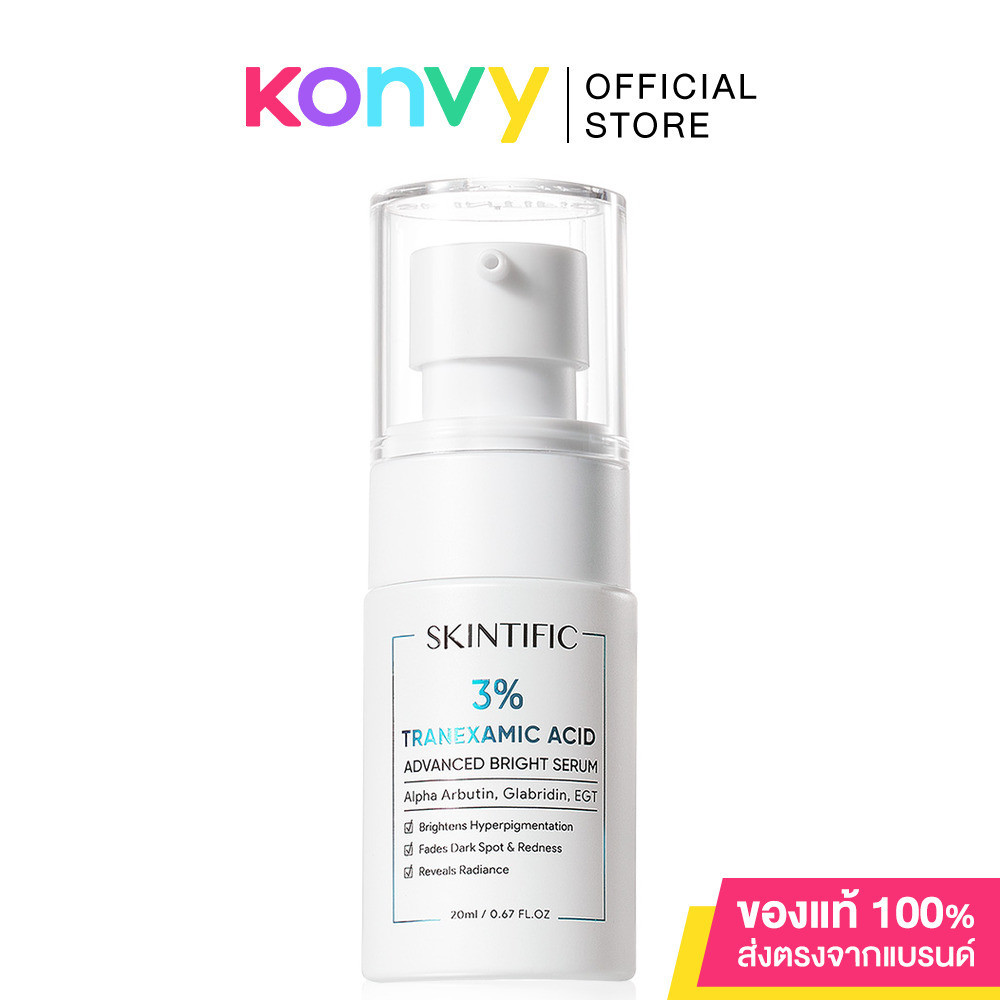 ... ทำความสะอาดใบหน้าของคุณ ใช้SKINTIFIC 10% Niacinamide Serumในปริมาณที่เพียงพอและเกลี่ยให้ทั่วใบหน้าและลำคอ •SKINTIFIC 2% Salicylic Acid Anti Acne Serum 20mlเซรั่มบำรุงผิวหน้า ช่วยปลอบประโลมและดูแลสิว ด้วย Salicylic Acid 2% ซึ่งเป็นความเข้มข้นที่มีประสิทธิภาพในการช่วยดูแลผิวที่เป็นสิว ผสานไนอะซินาไมด์ ช่วยลดโอกาสที่แผลเป็นจากสิวจะปรากฏขึ้น อีกทั้งมีเซราไมด์ ช่วยบำรุงและคงสุขภาพของเกราะป้องกันผิว เลขที่จดแจ้ง 10-2-6600021477 ล้างหน้าให้สะอาดโดยเฉพาะบริเวณที่เป็นสิว ใช้ผลิตภัณฑ์ในปริมาณที่พอเหมาะทาให้ทั่วใบหน้า/บริเวณที่มีสิว ตามด้วยขั้นตอนการดูแลผิวถัดไป •SKINTIFIC 5X Ceramide Barrier Serum 20mlเซรั่มบำรุงผิวหน้า มีส่วนผสมของเซราไมด์ 5 ชนิด เพื่อปกป้องและดูแลเกราะป้องกันผิว มอบความชุ่มชื้น ผสานโพรไบโอติก BFL ช่วยลดรอยแดงและสิว อีกทั้งมี Centella Asiatica พร้อมปลอบประโลมผิว เลขที่จดแจ้ง 10-2-6600028904 ใช้บนใบหน้าที่สะอาด หยด 2-3 หยดลงบนมือ ทาให้ทั่วใบหน้า ลูบไล้ให้ทั่วลำคอ ให้เซรั่มซึมเข้าสู่ผิวได้ดีที่สุด สามารถใช้เซรั่มได้ทั้งกลางวันและกลางคืน •SKINTIFIC 3% Tranexamic Acid Advanced Bright Serum 20mlเซรั่มมี Tranexamic Acid 3% ที่ใช้ Liposomal ห่อหุ้ม กักเก็บสารอาหารไว้ในเปลือกนาโน และทำให้ผิวหนังดูดซึมได้ง่าย เพื่อลดเลือนจุดด่างดำบนใบหน้า ทำงานเหมือนบูสเตอร์บนผิว ปรับสีผิวให้สม่ำเสมอกัน พร้อมด้วย Arbutin, Glabridin บริสุทธิ์ และ EGT ซึ่งเพิ่มหน้าป้องกันไม่ให้เกิดการสร้างเม็ดสีใหม่ เนื้ออิมัลชั่นสูตรน้ำ บางเบา ไม่เหนียวเหนอะหนะ อ่อนโยนต่อผิว สูตรสำหรับทุกสภาพผิวโดยเฉพาะ สำหรับผู้ที่มีปัญหาสีผิวไม่สม่ำเสมอและผิวแพ้ง่ายสามารถใช้ได้ เลขที่จดแจ้ง 10-2-6600032166 ใช้ผลิตภัณฑ์ในปริมาณที่พอเหมาะ 2-3 หยดทาให้ทั่วใบหน้าและลำคอ ก่อนใช้มอยส์เจอร์ไรเซอร์ ใช้ตอนเช้าและกลางคืนเพื่อผลลัพธ์สูงสุด ใช้ตอนเช้า ต่อด้วยครีมกันแดด •SKINTIFIC 10% Vitamin C Brightening Glow Serum 20mlเซรั่มบำรุงผิวหน้า ด้วยวิตามินซีที่มีกรดแอล-แอสคอร์บิก 10% ช่วยเพิ่มความกระจ่างใส ลดเลือนจุดด่างดำและรอยสิว ทำให้ผิวดูเปล่งปลั่งสุขภาพดี อีกทั้งมีสารแอนตี้ออกซิแดนท์ 3 ชนิด ช่วยป้องกันผิวหมองคล้ำ เลขที่จดแจ้ง 10-2-6600034322 ปั๊มผลิตภัณฑ์ในปริมาณที่เหมาะสมลงบนใบหน้าของคุณ เกลี่ยให้เรียบเนียนสม่ำเสมอโดยเฉพาะบริเวณจุดด่างดำ ใช้ทั้งกลางวันและกลางคืนเพื่อผลลัพธ์ที่ดีที่สุด และตามด้วยครีมกันแดดในตอนเช้า •SKINTIFIC 3% Tranexamic Acid Advanced Bright Serum 20mlเซรั่มมี Tranexamic Acid 3% ที่ใช้ Liposomal ห่อหุ้ม กักเก็บสารอาหารไว้ในเปลือกนาโน และทำให้ผิวหนังดูดซึมได้ง่าย เพื่อลดเลือนจุดด่างดำบนใบหน้า ทำงานเหมือนบูสเตอร์บนผิว ปรับสีผิวให้สม่ำเสมอกัน พร้อมด้วย Arbutin, Glabridin บริสุทธิ์ และ EGT ซึ่งเ