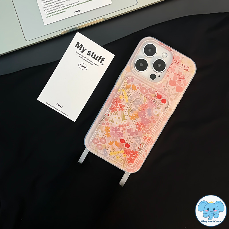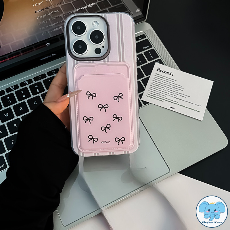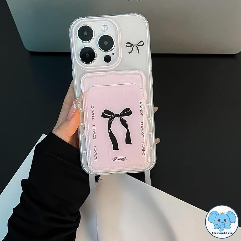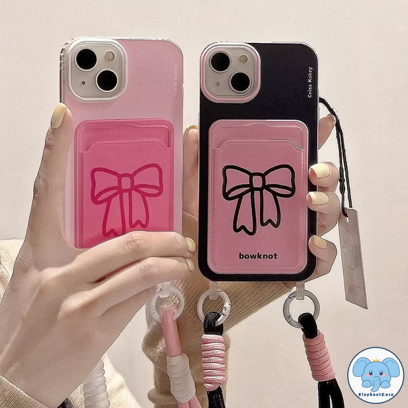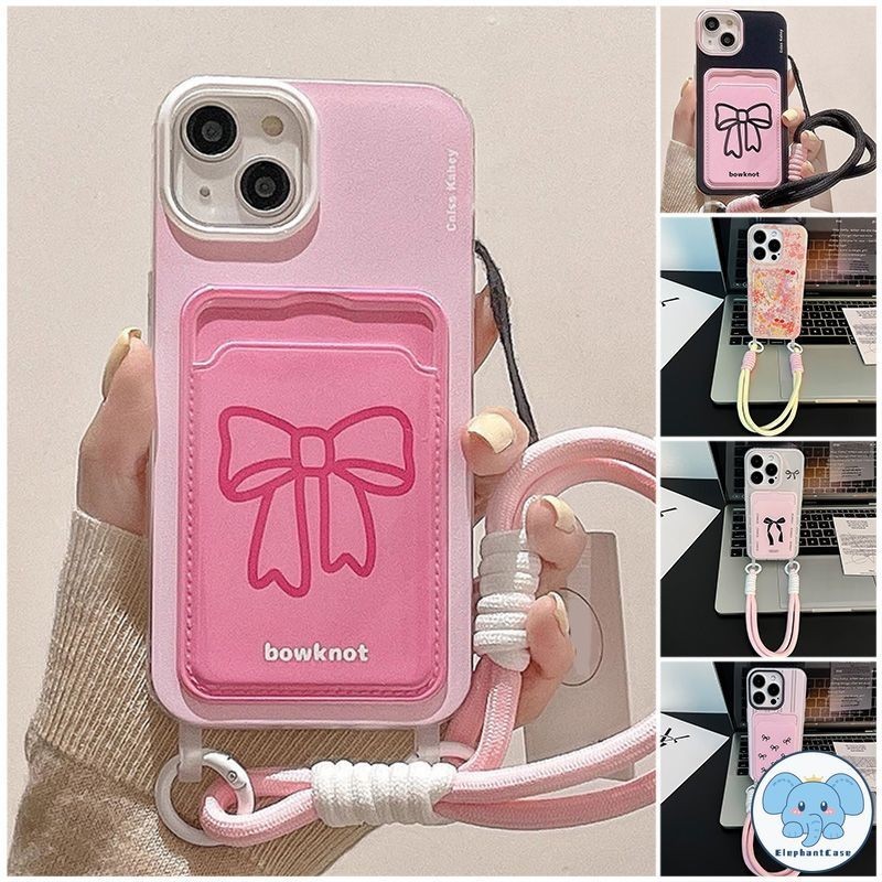 โบว์สีชมพูโบว์สีดำดอกไม้สีสันสองสายคล้องกระเป๋ากระเป๋าใส่บัตร IPhone 16 15 11 14 13 12 Pro Max X XR XS Max 16 15 7 8Plus