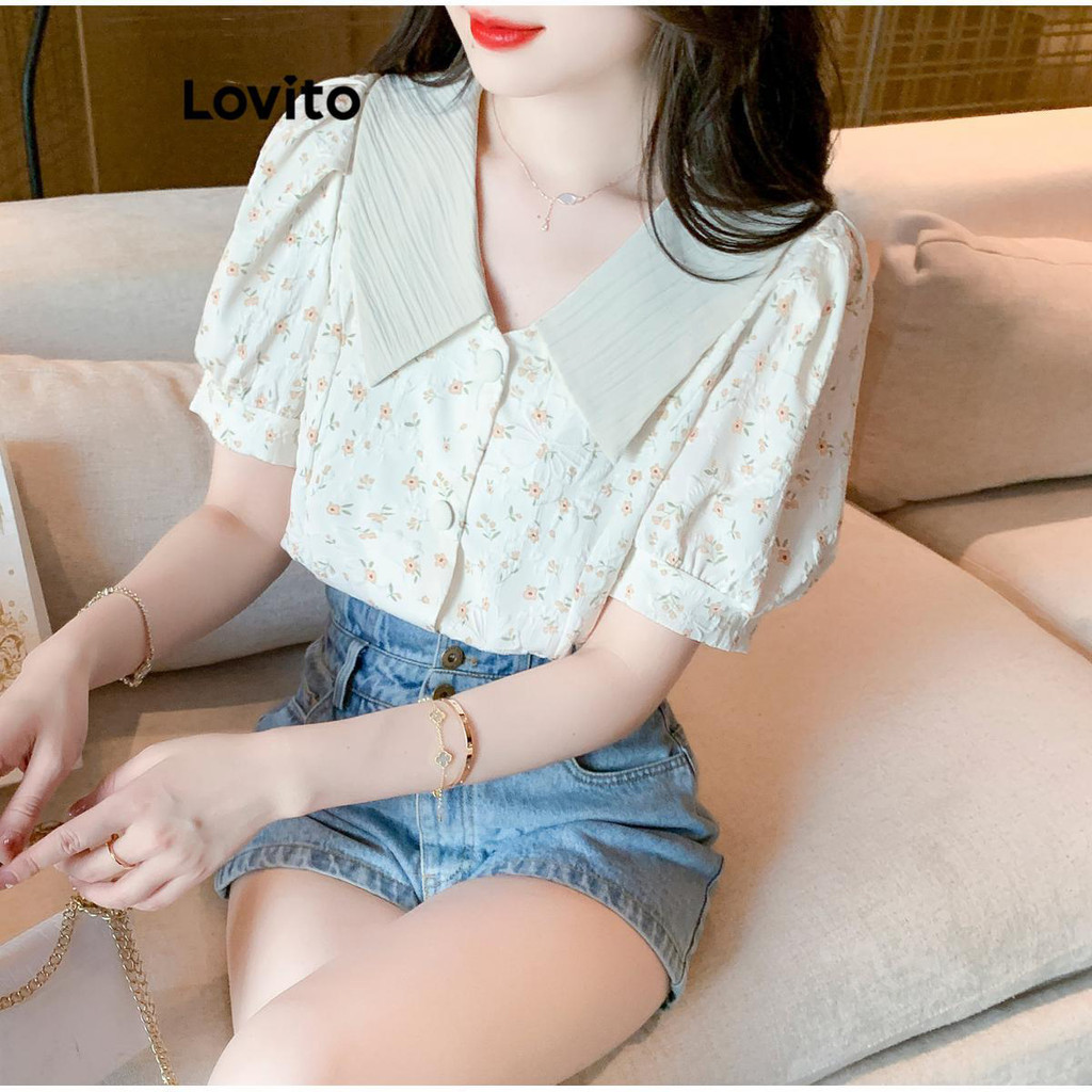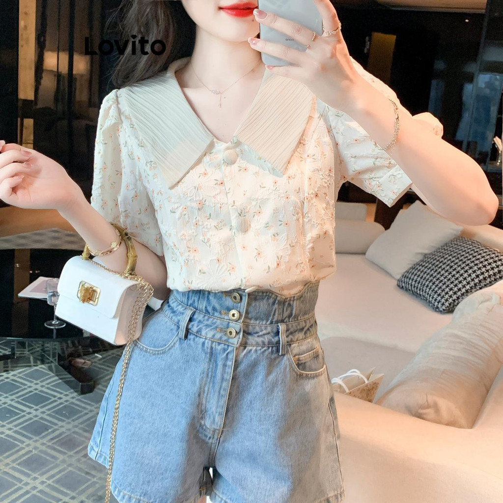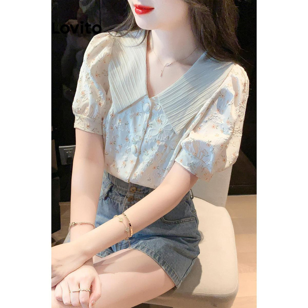 Lovito เสื้อเบลาส์ผู้หญิง ปกสีตัดกัน ลายดอกไม้ สไตล์ลำลอง LNE49138