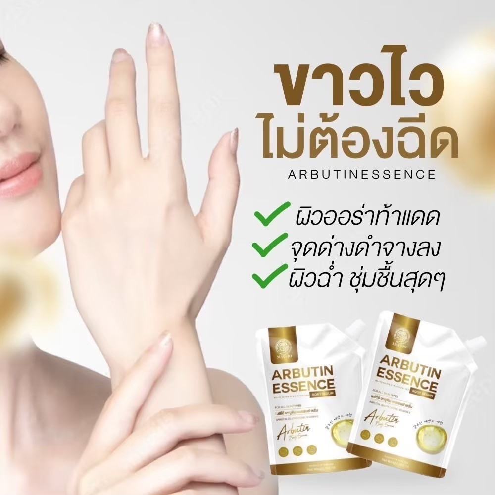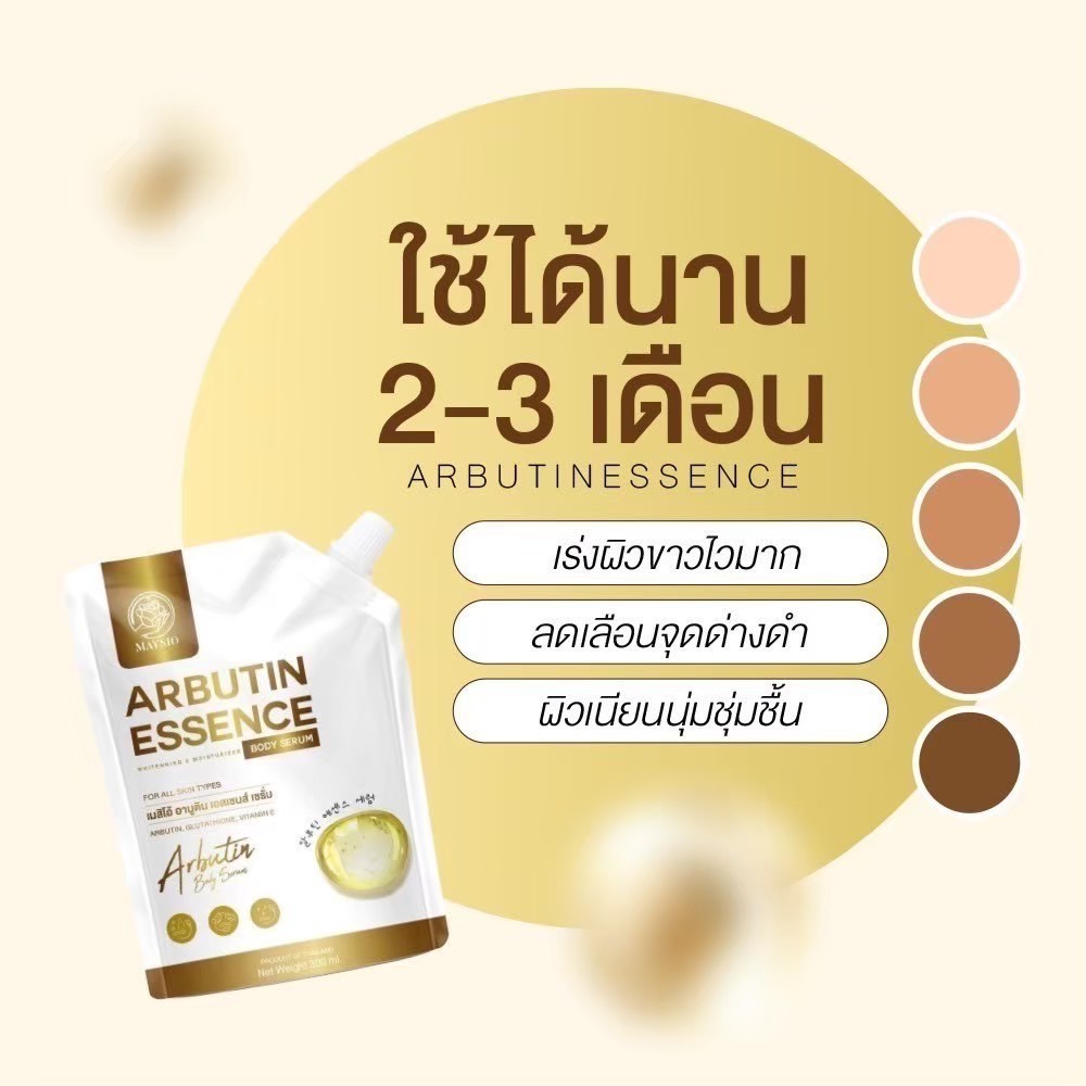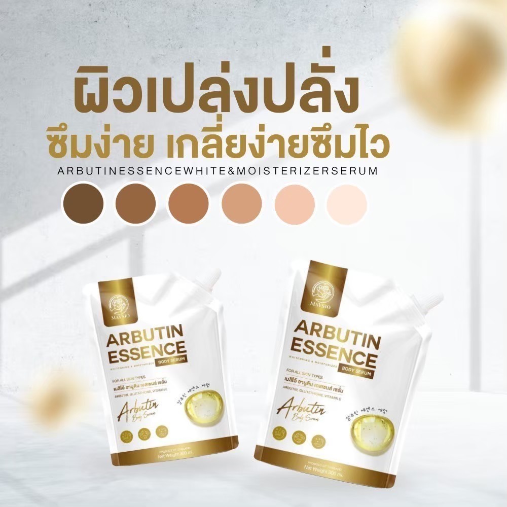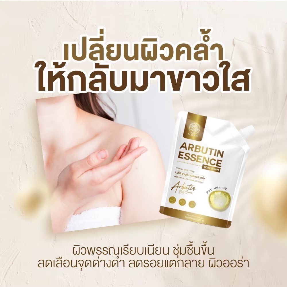 ... ัทเก็บรักษาสินค้าโดยเฉพาะ เพื่อคงประสิทธิภาพสินค้า 8.ห่อพัสดุอย่างดี เพื่อไม่ให้สินค้าเสียหาย 9.มีโค้ดมากมาย แจกส่วนลดเพื่อคุณลูกค้า 10.มีทีมบริการหลังการขาย ติดต่อได้รวดเร็ว ❤️ ร้านเราจำหน่ายแต่สินค้า ดี มีคุณภาพ ถูกต้อง และปลอดภัยทุกประการ ❤️ เพื่อบริการที่มีประสิทธิภาพ เราพยายามให้ดีที่สุดเพื่อคุณลูกค้าทุกท่าน 🌟 Maysio เมย์สิโอ้ Arbutin Essence อาบูติน เอสเซนส์ 🌟 เอสเซนส์ เซรั่มบำรุงผิวกาย 📍เพิ่มผิวขาว ถุงใหญ่จุใจ - ช่วยเร่งผิวขาว กระจ่างใส - ช่วยลดเลือนจุดด่างดำ - บำรุงผิวเนียนนุ่ม ชุ่มชื้น 📍ปริมาณ : 300 ml 📍วิธีใช้ : ทาบำรุงผิวกายเป็นประจำเช้า-เย็น 📍เลขที่จดแจ้ง : 70-1-6300052791