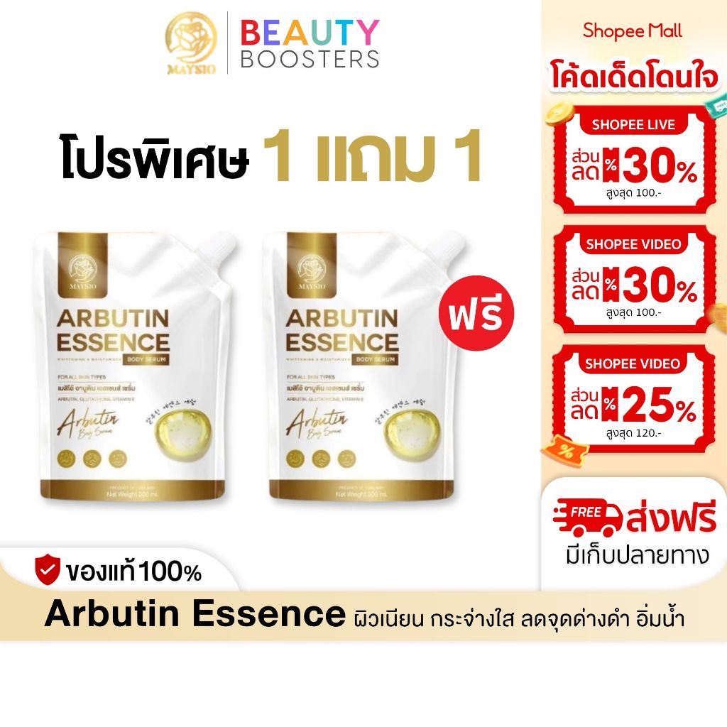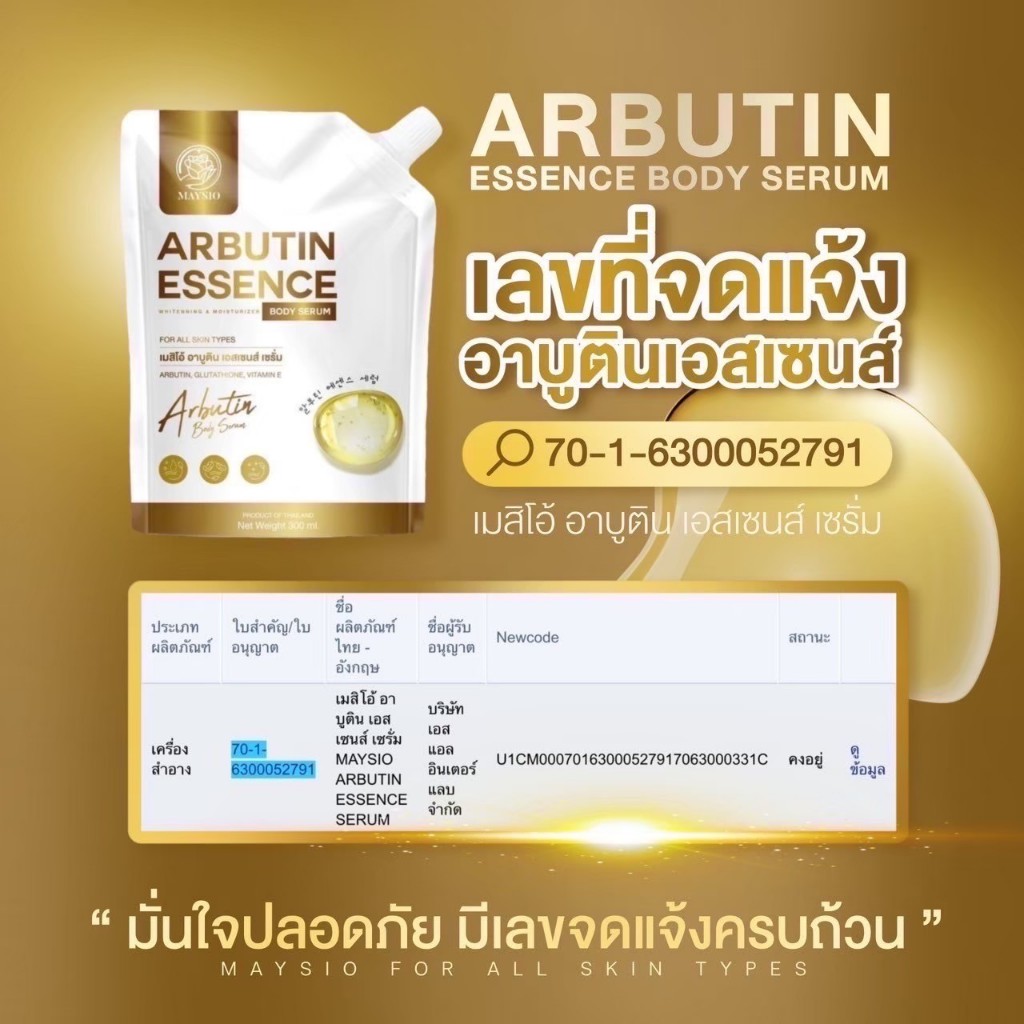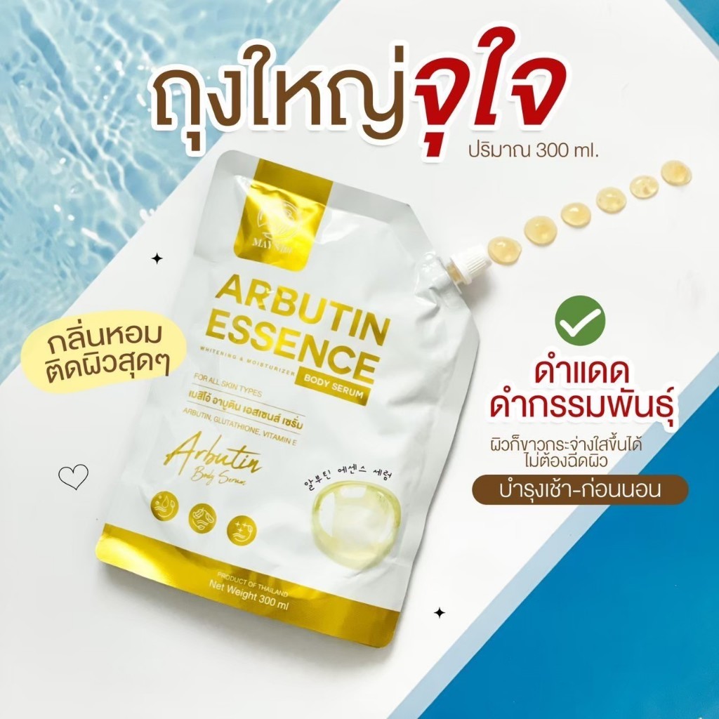 ... ัทเก็บรักษาสินค้าโดยเฉพาะ เพื่อคงประสิทธิภาพสินค้า 8.ห่อพัสดุอย่างดี เพื่อไม่ให้สินค้าเสียหาย 9.มีโค้ดมากมาย แจกส่วนลดเพื่อคุณลูกค้า 10.มีทีมบริการหลังการขาย ติดต่อได้รวดเร็ว ❤️ ร้านเราจำหน่ายแต่สินค้า ดี มีคุณภาพ ถูกต้อง และปลอดภัยทุกประการ ❤️ เพื่อบริการที่มีประสิทธิภาพ เราพยายามให้ดีที่สุดเพื่อคุณลูกค้าทุกท่าน 🌟 Maysio เมย์สิโอ้ Arbutin Essence อาบูติน เอสเซนส์ 🌟 เอสเซนส์ เซรั่มบำรุงผิวกาย 📍เพิ่มผิวขาว ถุงใหญ่จุใจ - ช่วยเร่งผิวขาว กระจ่างใส - ช่วยลดเลือนจุดด่างดำ - บำรุงผิวเนียนนุ่ม ชุ่มชื้น 📍ปริมาณ : 300 ml 📍วิธีใช้ : ทาบำรุงผิวกายเป็นประจำเช้า-เย็น 📍เลขที่จดแจ้ง : 70-1-6300052791