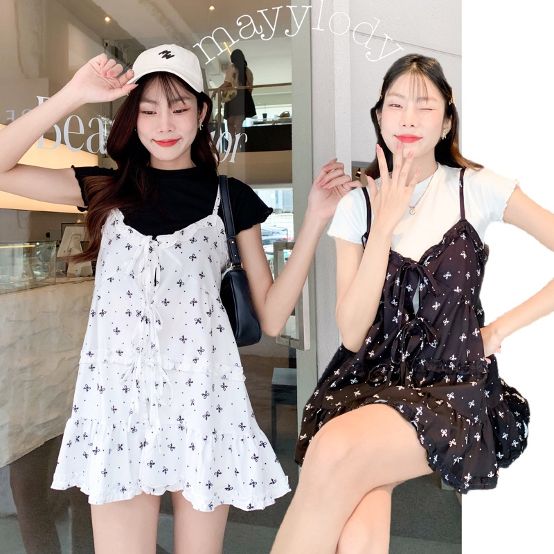 🎀mayylody🎀 มินิเดรส สายเดี่ยว ผ้าพิมพ์ลายโบว์เกาหลี สุดฮิต ใส่เป็นเลเยอร์ตัวนอกน่ารักสุดๆ ผ้านุ่มฟู (เสื้อโคเรีย)