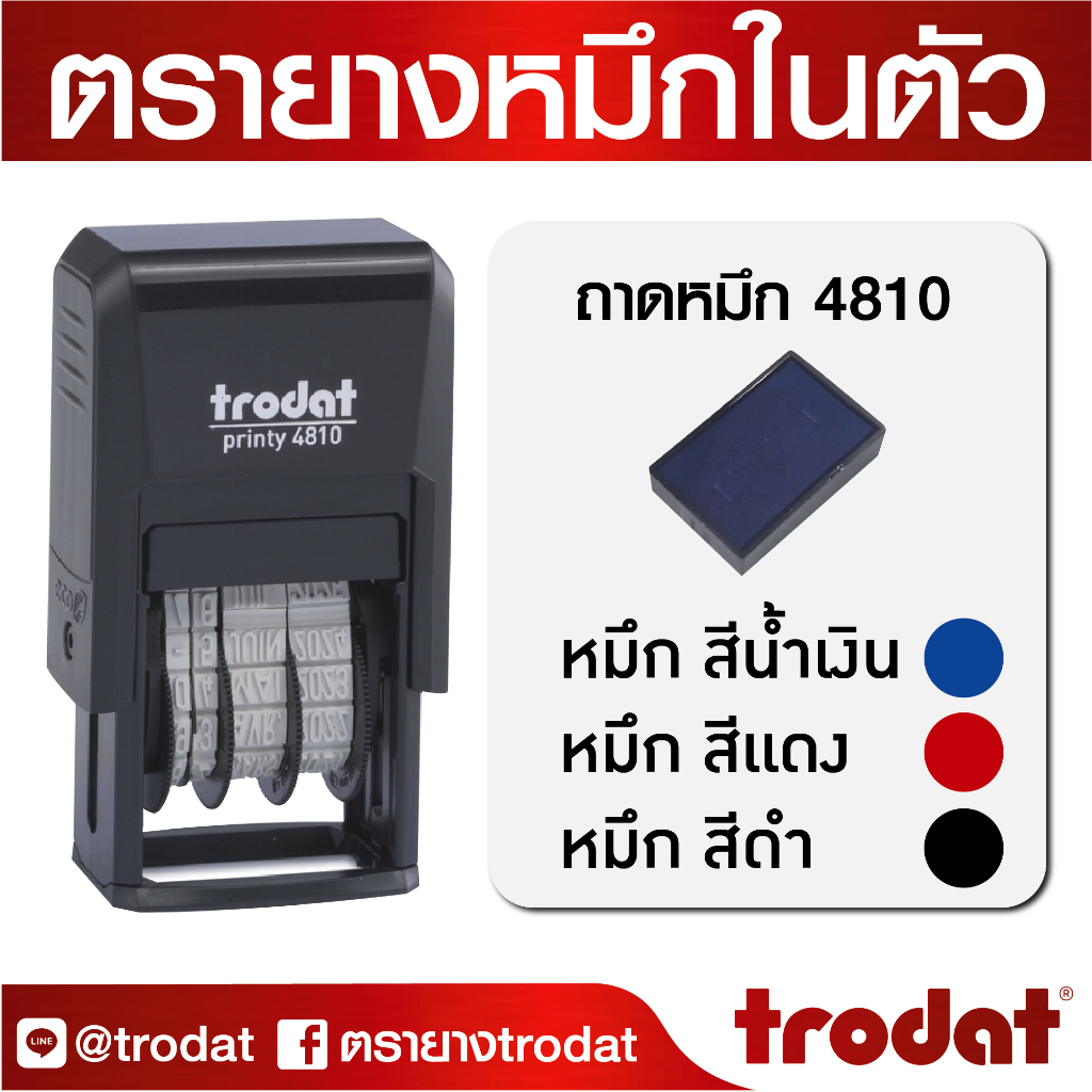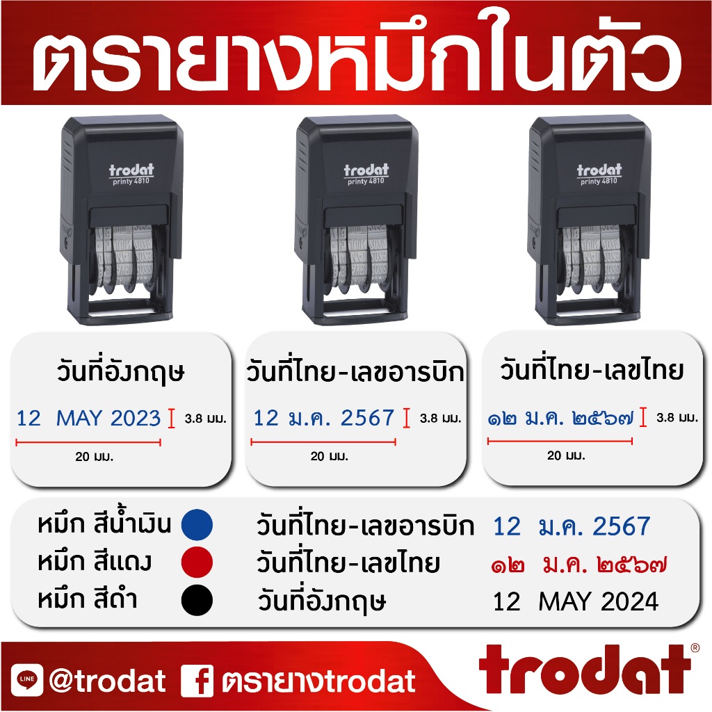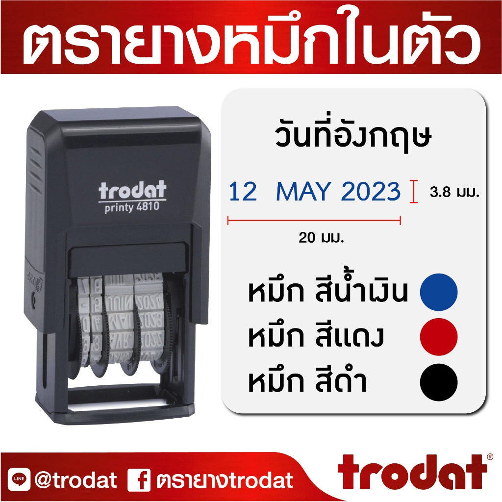 ตรายางแบรนด์ Trodat ✔ ตรายางวันที่หมึกในตัว รุ่น - TR4810 ✔ วันที่ไทย,วันที่เลขไทย,วันที่อังกฤษ ✔ วันที่เริ่มต้นปี 2565-2576 และ 2022-2033 ✔ ตัวอักษรมีความสูง 3.8 มม. ✔ ตรายางทุกตัวใช้หน้ายางพารา รับประกันอายุการใช้งานนาน 5 ปี ✔ มีหมึกเติม และถาดหมึกเปลี่ยนทุกรุ่น ✔ มีหมึก 3 สีให้เลื
