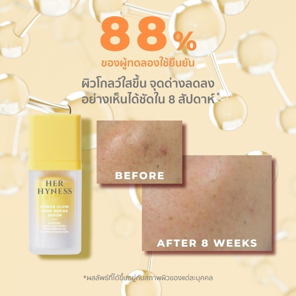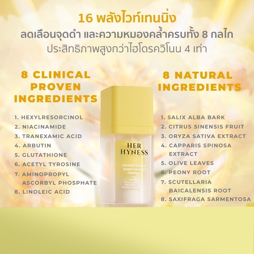 HER HYNESS POWER GLOW PORE REFINE SERUM 15 ML เฮอ ไฮเนส พาวเวอร์โกลว์ พอร์ รีฟายน์ เซรั่ม เพื่อผิวขาวกระจ่างใส 15 มล. เซรั่มเพื่อผิวกระจ่างใส รู้สึกได้ใน 1 สัปดาห์ พร้อมกระชับรูขุมขน สำหรับผิวมัน ผิวผสม ผิวแพ้ง่าย และผู้มีปัญหาสิวโดยเฉพาะ ด้วย 16 พลังไวท์เทนนิ่งจากธรรมชาติ ตรงเข้าจัดการ