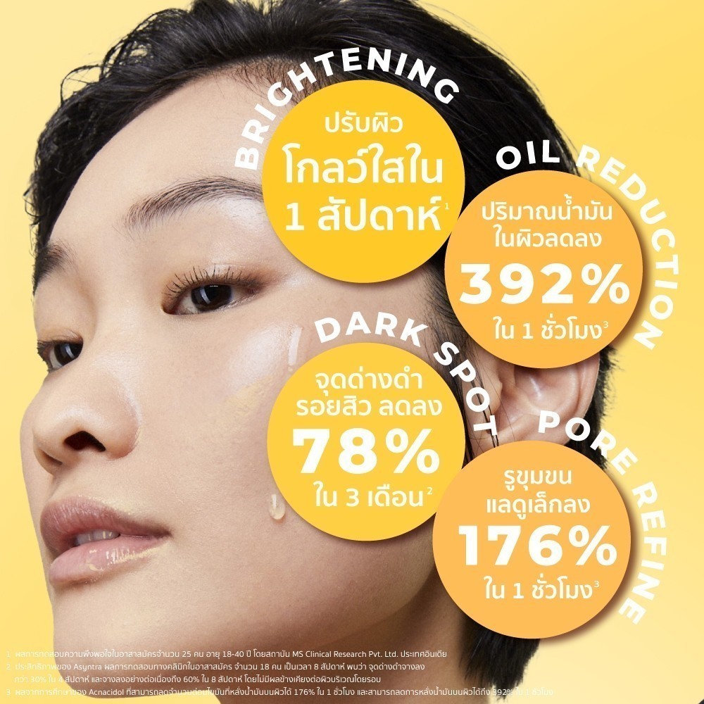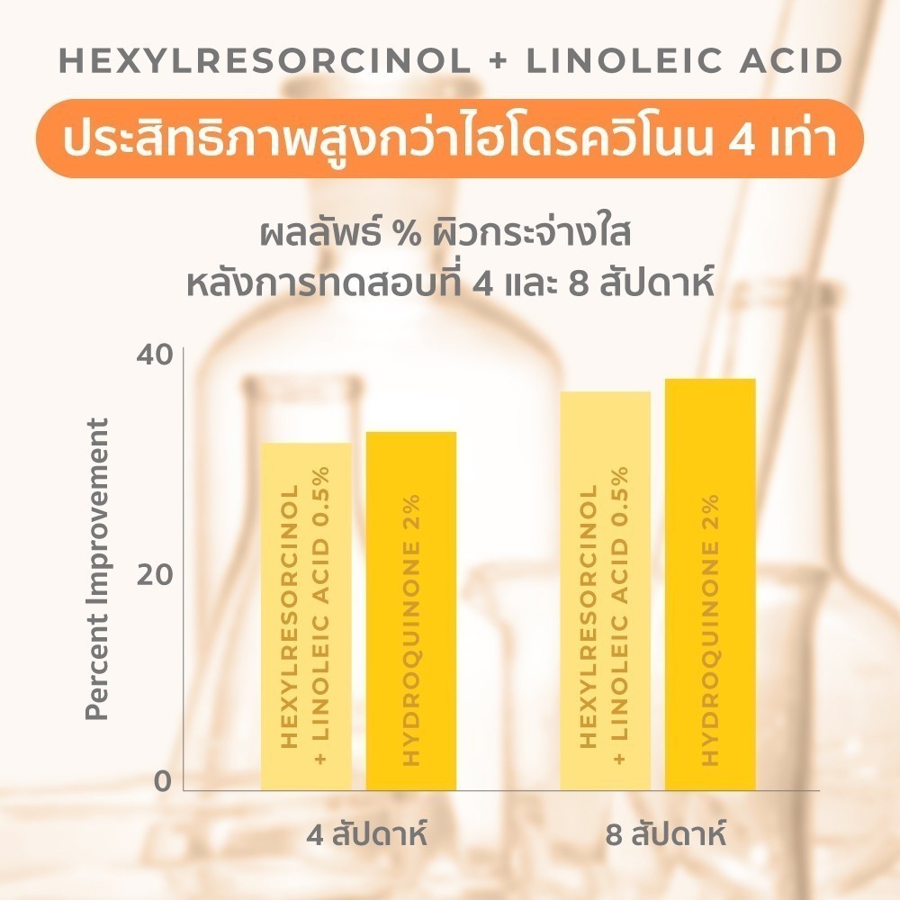 ... จุดด่างดำ ความหมองคล้ำถึงต้นตอ ด้วยประสิทธิภาพที่เหนือกว่าไฮโดรควิโนน 4 เท่า ปลดล็อคผิวโกลว์ใส เปล่งประกาย 4 มิติ โดยไม่ทำให้ผิวบาง ไวต่อการเกิดฝ้ากระ - โทนผิวสว่างขึ้น - ช่วยลดเลือนรอยสิว ฝ้ากระ - สีผิวสม่ำเสมอ - ลดโทนผิวเหลือง 1. ปลดล็อคผิวโกลว์ใสทั้ง 4 มิติ ป้องกันผิวที่โดนทำร้าย จากแสงแดด จนถึงกระบวนการ Recovery สีผิวให้กลับมากระจ่างใสขึ้น - Whitening ทำให้โทนสีผิวดูกระจ่างใสขึ้น - Reduce Dark Spot ลดเลือนจุดด่างดำ รอยสิว ฝ้ากระ - Even Skin Tone ทำให้สีผิวแลดูสม่ำเสมอขึ้น - Anti-Glycation ลดโทนผิวเหลือง ผิวหมองคล้ำ 2. Anti-Oxidant - ปกป้องผิวจากแสงแดดและมลภาวะ - ลดการระคายผิวจากการถูกทำร้ายจากแสงแดดและมลภาวะ 3. ผสาน 4 กลไกเพื่อผิวเนียน ละเอียด ไร้สิว - กระชับรูขุมขน ลดความม - คุมความมันส่วนเกิน โดยไม่ทำให้ผิวแห้งเกินไป - ลดสิว ยับยั้งแบคทีเรียก่อสิว C.Acnes ได้ถึง 72% - ปลอบประโลมผิว ลดการระคาย อ่อนโยน สำหรับผิวบอบบาง แพ้ง่าย หรือเป็นสิวง่าย ปราศจากสารเคมีที่ระคายเคืองผิวกว่า 18 ชนิด เช่น แอลกอฮอล์ น้ำหอม ซิลิโคน มิเนอรัลออย สี พาราเบน สเตียรอยด์ ฯลฯ ผ่านการทดสอบการระคายเคืองต่อผิวโดยแพทย์ผิวหนัง (Dermatologically-Tested) ไม่ทดลองกับสัตว์ ไม่ก่อให้เกิดการอุดตันของสิว เหมาะสำหรับ (สภาพผิว): ผิวผสม-ผิวมัน รูขุมขนกว้าง เป็นสิว วิธีใช้: ทาเซรั่มทั่วใบหน้าเป็นประจำทุกวันทั้งเช้าและเย็น ส่วนประกอบ: AQUA, NIACINAMIDE, BETAINE, GLYCERIN, BUTYLENE GLYCOL, SALIX ALBA BARK EXTRACT, CITRUS SINENSIS FRUIT WATER, ORYZA SATIVA EXTRACT, CAPPARIS SPINOSA FRUIT EXTRACT, OLEA EUROPAEA LEAF EXTRACT, MALTODEXTRIN, CAPRYLIC/CAPRIC TRIGLYCERIDE, HEXYLRESORCINOL, ETHYL LINOLEATE, TRANEXAMIC ACID, 10-HYDROXYDECANOIC ACID, SEBACIC ACID, 1,10-DECANEDIOL, ARBUTIN, ACETYL TYROSINE, SAXIFRAGA SARMENTOSA EXTRACT, PAEONIA SUFFRUTICOSA ROOT EXTRACT, AMINOPROPYL ASCORBYL PHOSPHATE, SCUTELLARIA BAICALENSIS ROOT EXTRACT, GLUTATHIONE, GLYCOGEN, ALLANTOIN, ACACIA SENEGAL GUM, XANTHAN GUM, PPG-26-BUTETH-26, PEG-40 HYDROGENATED CASTOR OIL, HYDROXYACETOPHENONE, CAPRYLYL GLYCOL, DIPROPYLENE GLYCOL, DIPOTASSIUM GLYCYRRHIZINATE, LECITHIN, ROYAL JELLY เลขที่จดแจ้ง: 74-1-6500008192