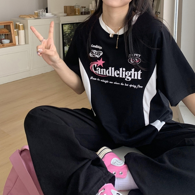 Betty House🧁เสื้อยืดสีตัดกันแบบอเมริกัน💥2024 สีย้อนยุคใหม่จับคู่แขนสั้นหลวมหวานและเท่ที่สาว ๆ ต้องมี