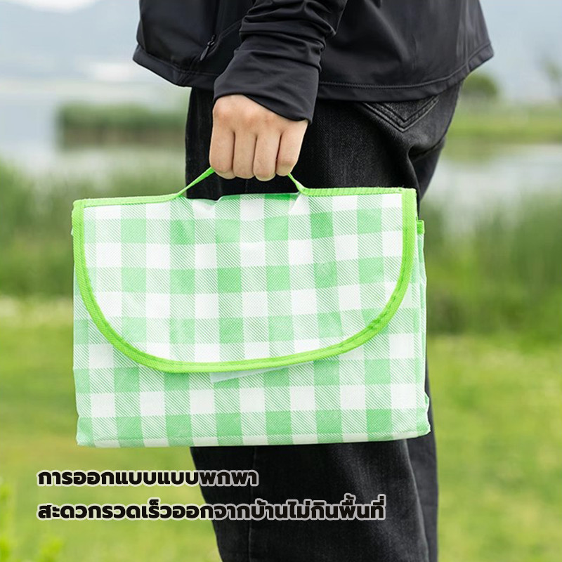 ... ่อ กันคราบ เช็ดทำความสะอาดได้ พื้นผ้าไม่ทอกันน้ำและกันความชื้น หญ้าไม่เปียกง่าย ป้องกันการซึมของน้ำ และไม่ดูดซับน้ำ เช็ดทำความสะอาดง่าย ทำความสะอาดง่าย แข็งแรงทนทานไม่เสียรูปง่าย เนื้อเรียบเนียนและสามารถม้วนเก็บได้สะดวก มาพร้อมสายสะพายเพื่อการพกพาที่สะดวก ขอบเขตการใช้งาน เหมาะสำหรับการปิกนิกกลางแจ้ง พกพาสะดวก ลูกค้าสามารถพับเก็บใส่กระเป๋าถือได้ การเดินทางที่มีความสุขเริ่มต้นด้วยการวางเสื่อปิกนิก เหมาะสำหรับการปิกนิก