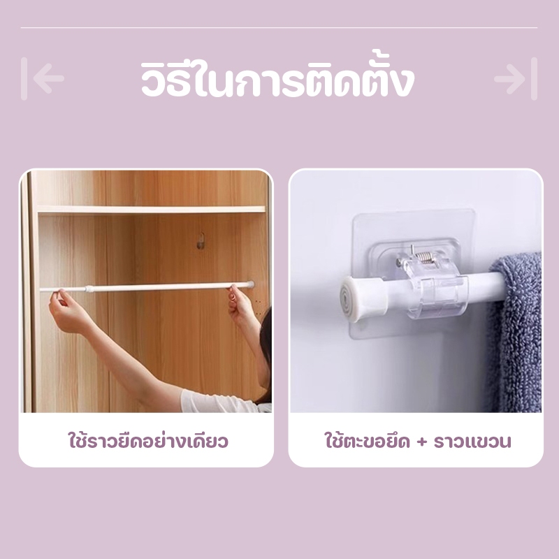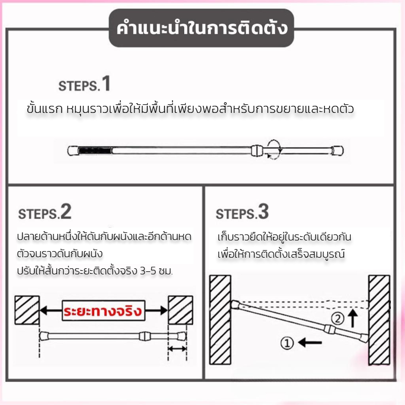 ... 40-70 ซม. 55-90 ซม. 60-110 ซม. 70-120 ซม. 80-150 ซม. วัสดุ: เป็นเหล็ก สี : ขาว ขนาด: ยาว40-70ซม. เหมาะสำหรับ42~60cm(เส้นผ่านศูนย์กลาง1.3ซม.) ยาว55-90ซม. เหมาะสำหรับ57~80cm(เส้นผ่านศูนย์กลาง1.3ซม.) ยาว60-110ซม. เหมาะสำหรับ65~100cm(เส้นผ่านศูนย์กลาง1.3ซม.) ยาว70-120ซม. เหมาะสำหรับ72~105cm(เส้นผ่านศูนย์กลาง1.3ซม.) ยาว80-150ซม. เหมาะสำหรับ85~130cm(เส้นผ่านศูนย์กลาง1.6ซม.) ⚡⚡ราว: ราวรับน้ำหนักได้ไม่เกิน 1~2 กิโลกรัม ⚡⚡ ✅วิธีใช้ ✅ 1. หมุนราวเพื่อให้มีพื้นที่เพียงพอสำหรับการขยายและหดตัว และปรับให้สั้นกว่าขนาดการติดตั้งจริง 3-5 ซม. 2. ปลายด้านหนึ่งของราวดันกับผนัง และปลายอีกด้านยืดและหดตัวด้วยมือจนราวดันเข้ากับผนัง 3. เก็บราวยืดไสลด์ให้อยู่ในระดับเดียวกันเพื่อให้การติดตั้งเสร็จสมบูรณ์ ✅คุณสมบัติ ✅ ● ง่ายต่อการเคลื่อนย้ายไปอพาร์ทเมนต์ใหม่ หรือ ย้ายสถานที่ ไม่ต้องเจาะ ● ไม่ต้องเจาะรูเข้าไปในผนังให้ยุ่งยากสามารถล็อคได้เลย ใช้ได้กับทุกห้อง เช่น ห้องครัว ห้องนอน ห้องน้ำ 1.ใช้ใต้อ่างล้างจานเพื่อเก็บน้ำยาทำความสะอาดได้ 2.ใช้แขวนกระเป๋าและเสื้อผ้าในตู้เสื้อผ้าได้ 3.ใช้จัดเก็บลิ้นชักราวตากผ้าได้ 4.ใช้ยึดม้วนกระดาษชำระ มวนห่อพลาสติกในครัว ฯลฯ การใช้งานต่างๆ 5.ราวติดคู่สามารถเปลี่ยนเป็นบอร์ดการเก็บรักษาได้ 6.ใช้ราวหลายอันเป็นชั้นแยกสำหรับชั้นวางรองเท้าได้ หมายเหตุ ✅ร้านเรามีของพร้อมส่งจากกรุงเทพฯ หน้าร้านอยู่เขตดินแดง ✅ถ้าคุณกรอกข้อมูลที่อยู่ เบอร์โทรผิดรบกวนติดต่อแม่ค้าทันที ✅ถ้าสินค้าที่ได้รับไม่ตรงตามที่สั่ง เช่นผิดจำนวน ไซส์ ลาย หรือว่ามีปัญหาคุณภาพ คุณลูกค้าส่งวิดีโอและรูปทางแชทให้แม่ค้า ร้านเรารับผิดชอบจะรีบช่วยแก้ไข ✅แต่ละรูปภาพของร้านเราถ่ายจากสินค้าแท้จริง แต่เนื่องจากหน้าจอและแสงไม่เหมือนกัน สีของสินค้าที่ได้รับอาจมีความแตกต่างเล็กน้อย ซึ่งเป็นเรื่องปกติ ✅ขออภัยหากตอบช้า อาจจะอยู่เวลานอกเวลาทำงานแม่ค้าเห็นแล้วจะรีบตอบคำถาม ⏰เวลาจัดส่งสินค้า ✅ทางร้านจัดส่งสินค้าทุกวันจันทร์ถึงวันศุกร์ (เสาร์อาทิตย์หยุดค่ะ วันศุกร์รับส่งของจนถึงบ่าย 3โมงค่ะ) ✅ออเดอร์ที่เข้าก่อน12:00 สามารถส่งออกได้ภายในวันนั้น ไม่งั้นรอส่งวันถัดไปค่ะ 📢หากต้องการส่งด่วน สามารถคอมเฟิร์มกับแม่ค้าทางแชทได้ค่ะ