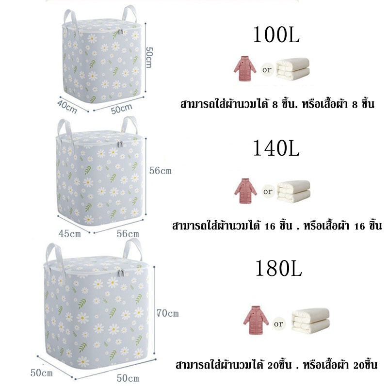 ชื่อผลิตภัณฑ์:กระเป๋าเก็บของ ข้อมูลจำเพาะ:56*45*56ซม/50*50*70ซม ความจุ: 100L/140L/180L วัสดุ: ผ้าไม่ทอ คุณสมบัติหลักของสินค้า: 1.เสริมซิป จัดเก็บแบบปิดสนิท ช่วยป้องกันฝุ่น กันเปื้อน กันแมลง ช่วยจัดเก็บให้เป็นระเบียบเรียบร้อย 2.ความจุขนาดใหญ่พิเศษ บรรจุของได้จำนวนมาก ไม่ว่าจะเป็นผ้าห่ม ผ้าน