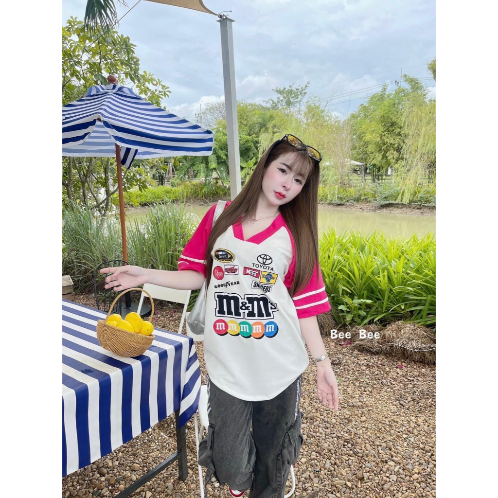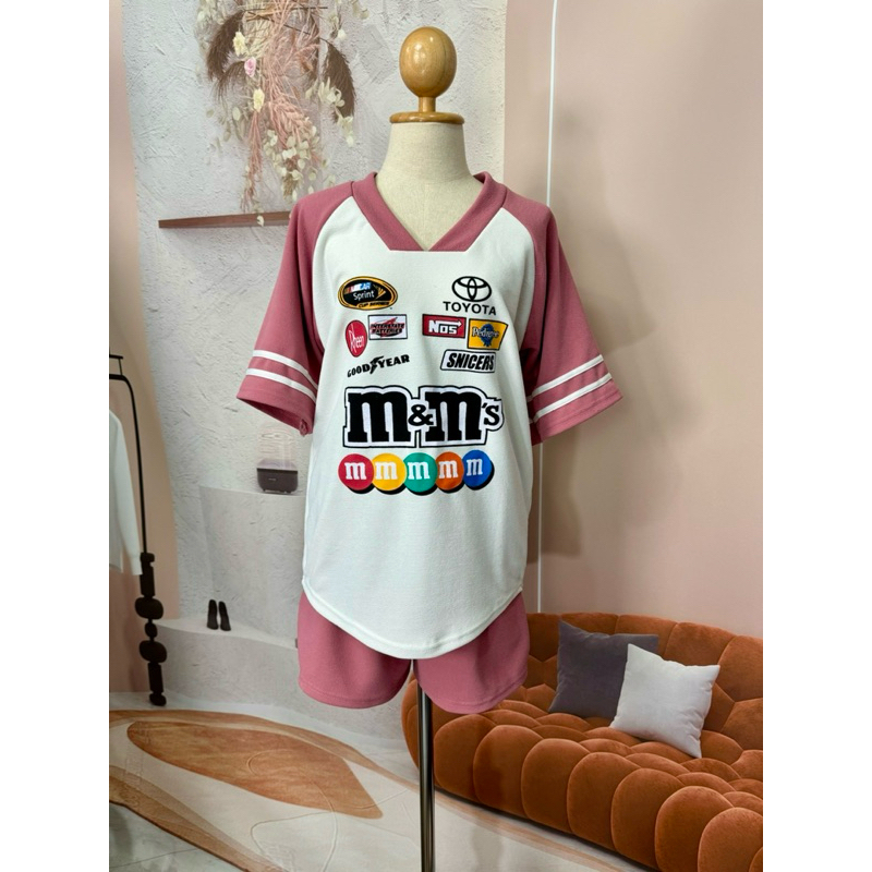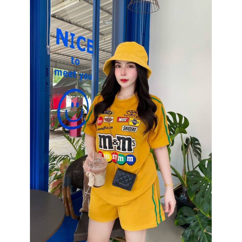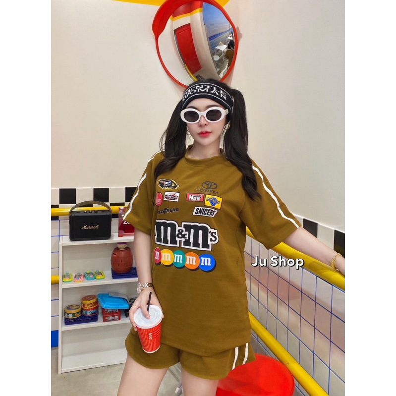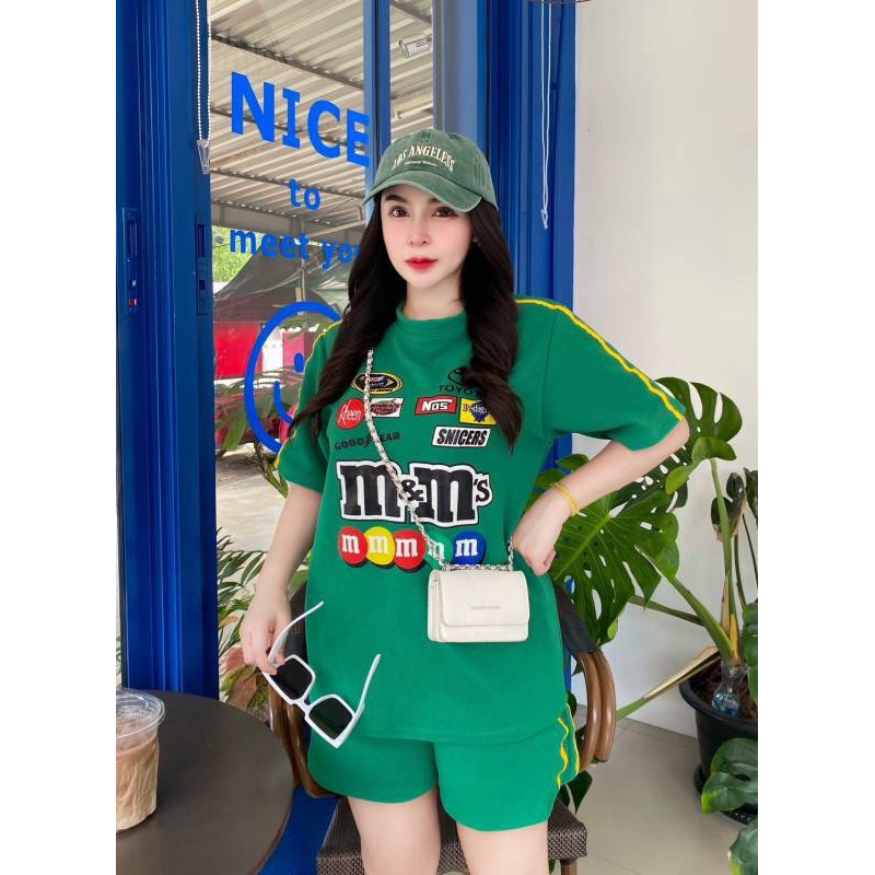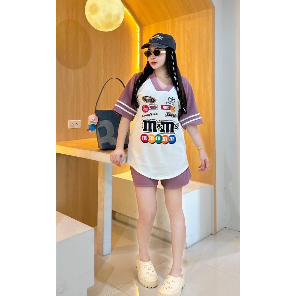 BB Set 2 ชิ้น M&M สุดฮิต เสื้อคอวีโอเวอร์ไซส์ + กางเกงขาสั้นมีกระเป๋าข้าง สวยมากฮิตสุดๆ