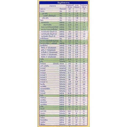... ันดอกทานตะวันที่มีกรดโอลีอิกสูง 4.07%, น้ำมันมะพร้าว 3.94%, น้ำมันดอกคำฝอย 0.001%), นมผงขาดมันเนย 30.46%, ใยอาหารชนิดโอลิโกฟรุคโตส 4.02%, เวย์โปรตีนเข้มข้น 3.44%, เวย์โปรตีนเข้มข้นที่มีแอลฟา-แล็คตัลบูมิน 3.22%, เกลือแร่รวม 1.0333%, วิตามินรวม 0.2799%, น้ำมันที่ให้เออาร์เอ 0.1484%, น้ำมันที่ให้ดีเอชเอ 0.1484%, ทอรีน 0.0387%, เอทธิลวานิลลิน 0.0351%, นิวคลีโอไทด์รวม 0.0203%, ลูทีน 0.0003%, อิมัลซิไฟเออร์ (INS322(i),INS471), สารควบคุมความเป็นกรด (INS330), สารป้องกันการเกิดออกซิเดชั่น (INS304, INS307b) แต่งกลิ่นสังเคราะห์ ข้อมูลสำหรับผู้แพ้อาหาร: มีนม และผลิตภัณฑ์จากถั่วเหลือง วิธีเตรียมผลิตภัณฑ์ คำเตือน : การผสมน้ำที่ไม่ได้ต้มสุก ใช้ขวดนมหรือถ้วยที่ไม่ได้ผ่านการต้ม หรือผสมในอัตราส่วนที่ไม่ถูกต้อง มีผลทำให้ทารกและเด็กเล็กเกิดการเจ็บป่วยได้ การเตรียมและการเก็บรักษาไม่ถูกวิธี อาจส่งผลต่อสุขภาพของบุตรท่าน 1 ล้างมือ ก่อนเตรียมผลิตภัณฑ์สำหรับทารก และเด็กเล็ก 2 ล้างขวดนมหรือถ้วย หัวนมยาง และฝาปิดขวดนมให้ทั่วถึง ไม่ให้มีน้ำนมเหลือติดค้างอยู่ 3 ต้มขวดนมหรือถ้วย หัวนมยาง และฝาปิดขวดนม ให้เดือดนาน 10 นาที ปิดฝาไว้จนกว่าจะใช้ 4 ต้มน้ำดื่มให้เดือดนาน 10 นาที แล้วทิ้งให้น้ำอุ่น 5 เทน้ำอุ่น ลงในขวดนมหรือ ถ้วยที่ต้มแล้ว ตามตาราง การให้ผลิตภัณฑ์ 6 ใช้ช้อนตวงที่ให้มาในกล่อง เท่านั้นตวงผลิตภัณฑ์ให้มี ปริมาณที่ถูกต้อง ปาดผลิตภัณฑ์ ให้เรียบเสมอขอบช้อนตวง 7 เทผลิตภัณฑ์ ลงในขวดนม หรือถ้วย ตามตารางการให้ผลิตภัณฑ์ 8 ปิดฝาและเขย่าขวดนมหรือใช้ช้อนคนในถ้วยให้ผลิตภัณฑ์ละลายจนหมด 9 พับปากซองให้ปิดสนิทหลังการใช้ทุกครั้ง และเก็บไว้ในที่แห้งและเย็น ควรใช้ให้หมดภายใน 4 สัปดาห์หลังจากเปิดซองแล้ว การเก็บรักษา ทุกครั้งหลังการใช้ พับปากซองให้ปิดสนิท ใส่ในภาชนะที่มีฝาปิดสนิท และเก็บไว้ที่แห้งและเย็น หลีกเลี่ยงการเก็บในที่อุณหภูมิร้อนจัด หรือเย็นจัดเป็นระยะเวลานาน สิ่งสำคัญที่ควรทราบ ไม่ควรเติมน้ำตาล น้ำผึ้ง หรือ วัตถุให้ความหวานใด ๆ อีก เพราะอาจทำ ให้ทารกและเด็กเล็ก ฟันผุและเป็นโรคอ้วนได้ •นมแม่เป็นอาหารที่ดีที่สุดสำหรับทารก เพราะมีคุณค่าทางโภชนาการครบถ้วน •ควรใช้ตามคำแนะนำของแพทย์ พยาบาล หรือนักโภชนาการ •การเตรียมหรือใช้ส่วนผสมไม่ถูกต้องจะเป็นอันตรายต่อทารก •ผลิตภัณฑ์นี้ ได้ผ่านกรรมวิธีการเตรียมเป็นอย่างดี ให้คุณค่าทางอาหารตามความต้องการของร่างกายเด็กที่กำลังเจริญเติบโต สินค้ามีอายุ 24 เดือน TFDA NO. 10-3-10937-5-0207 ผลิตโดย บริษัท ไวเอท นิวทริชั่นแนล สิงคโปร์ 1 ธาวส์ เซาท์ อเวนิว 4 สิงคโปร์ 637609 นำเข้าโดย บริษัท เนสท์เล่ (ไทย) จำก