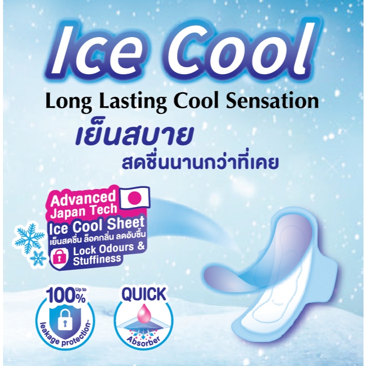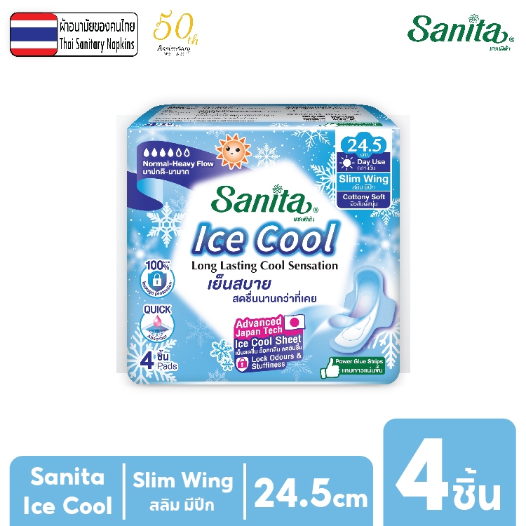 Sanita Ice Cool / แซนนิต้า ผ้าอนามัย ไอซ์ คูล ผิวสัมผัสนุ่ม กลางวัน มีปีก 24.5ซม. 4ชิ้น/ห่อ Japan Technology..!! ICE COOL sheet provides long lasting cool sensation, instantly locks odour and reduces stuffiness on surface for extra dry and fresh feeling.^ เทคโนโลยี แผ่นไอซ์คูล ให้ความเย็นสดชื่น