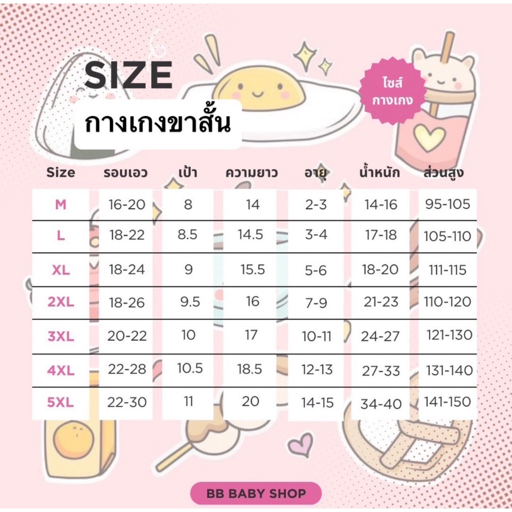 ... ) L - รอบเอว 18-22“ ความยาว 14.5” (เหมาะกับเด็ก อายุ 3-4ปี) XL - รอบเอว 18-24“ ความยาว 15”(เหมาะกับเด็ก อายุ 5-6ปี) 2XL- รอบเอว 18-26“ ความยาว 16”(เหมาะกับเด็ก อายุ 7-8ปี) 3XL- รอบเอว 20-27“ ความยาว 17”(เหมาะกับเด็ก อายุ 9-10ปี) 4XL- รอบเอว22-28“ความยาว18.5”(เหมาะกับเด็กอายุ 11-12ปี) 5XL- รอบเอว22-30“ความยาว20”(เหมาะกับเด็กอายุ 13-14ปี) **รายละเอียดไซส์โดยละเอียด ( M - 5XL ) 👉 ไซส์ 100 , M รอบเอว 16" ยืดสุด 20” ความยาว 14" ( 32 ซม.) น้ำหนัก 12-14 กก. ส่วนสูง 95-100 ซม. เหมาะกับเด็ก 2-3 ปี 👉 ไซส์ 110 , L รอบเอว 18" ยืดสุด 22” ความยาว 14.5" ( 34.5 ซม.) น้ำหนัก 15-16 กก. ส่วนสูง 100-105 ซม. เหมาะกับเด็ก 3-4 ปี 👉 ไซส์ 120 , XL รอบเอว 18” ยืดสุด 24” ความยาว 15" ( 37 ซม.) น้ำหนัก 17-20 กก. ส่วนสูง 105-110 ซม. เหมาะกับเด็ก 5-6 ปี 👉 ไซส์ 130 , 2XL รอบเอว 18” ยืดสุด 26” ความยาว 16" ( 38 ซม.) น้ำหนัก 21-25 กก. ส่วนสูง 110-115 ซม. เหมาะกับเด็ก 7-8 ปี 👉 ไซส์ 140 , 3XL รอบเอว 20” ยืดสุด 27” ความยาว 17" ( 43 ซม.) น้ำหนัก 26-28 กก. ส่วนสูง 115-125 ซม. เหมาะกับเด็ก 9-10 ปี 👉 ไซส์ 150 , 4XL รอบเอว 22” ยืดสุด 28” ความยาว 18.5" ( 47 ซม.) น้ำหนัก 35-38 กก. ส่วนสูง 141-145 ซม. เหมาะกับเด็ก 11-12 ปี 👉 ไซส์ 160 , 5XL รอบเอว 22” ยืดสุด 30” ความยาว 20" ( 49 ซม.) น้ำหนัก 39-45 กก. ส่วนสูง 146-155 ซม. เหมาะกับเด็ก 13-14 ปี ขนาดอาจจะคลาดเคลื่อนเล็กน้อย +/- 1-2 ซม. *** เนื้อผ้าของกางเกงแต่ละสี อาจจะมีเนื้อผ้าที่แตกต่างกัน เนื่องจากเทคนิคการฟอกสีของเนื้อผ้า ** สีและเนื้อผ้าบางสีในการผลิตจากโรงงานแต่ละล็อต อาจมีความแตกต่างกันเล็กน้อย แต่ยังคงคุณภาพที่ดีเท่าเดิม