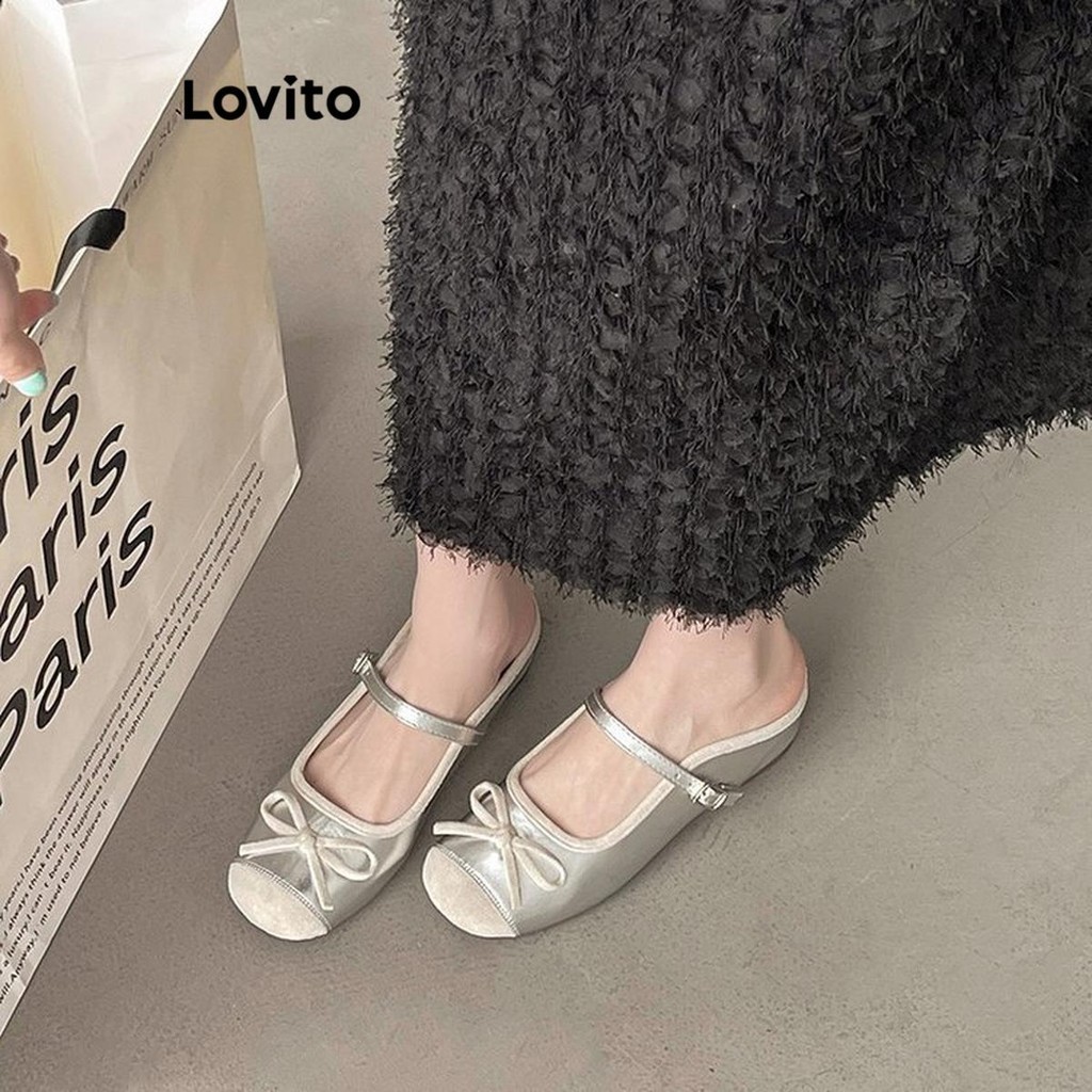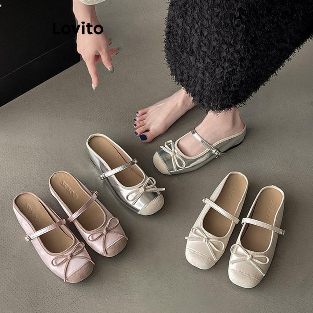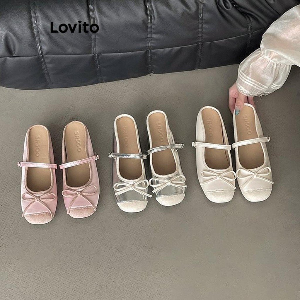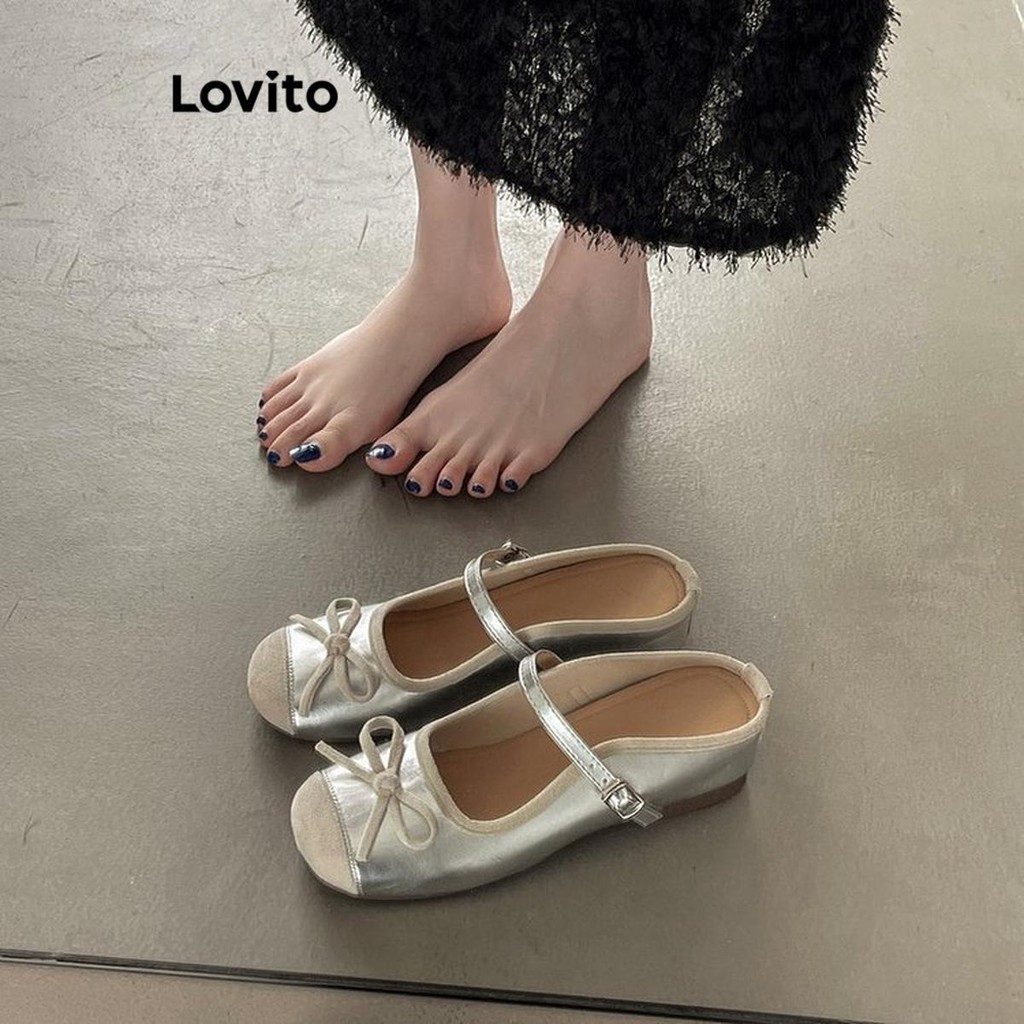 Lovito รองเท้าแมรี่เจนผู้หญิง รองเท้าทรงบัลเล่ต์ พื้นนิ่ม และสวมใส่สบาย แต่งโบว์ สีพื้น สไตล์ลำลอง LFA43097