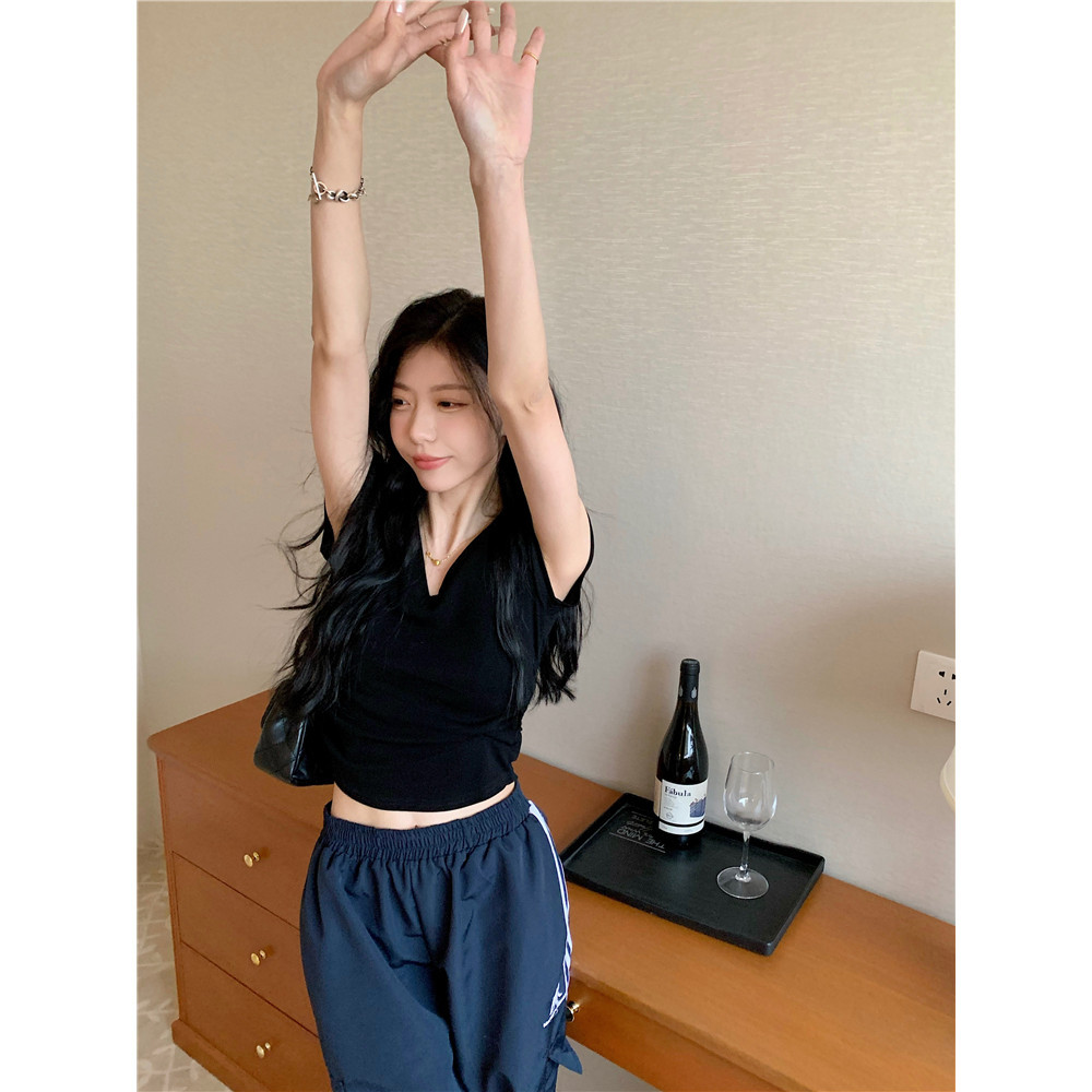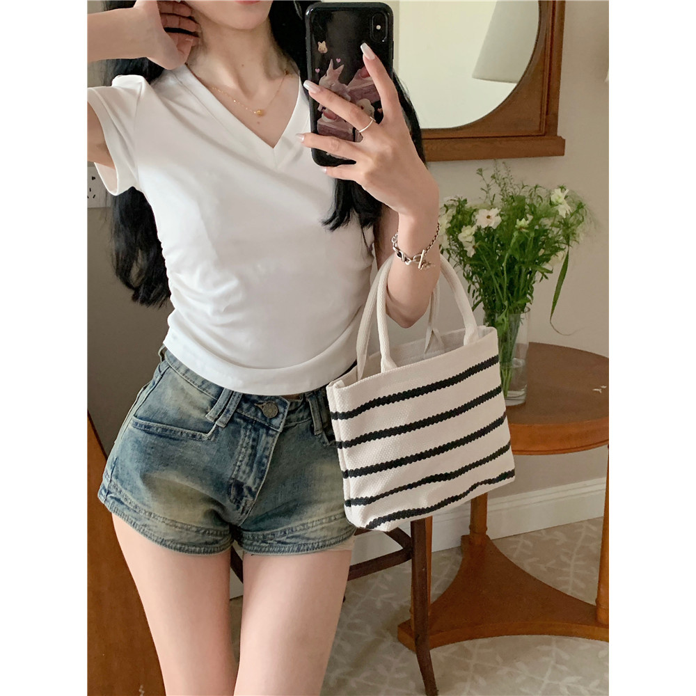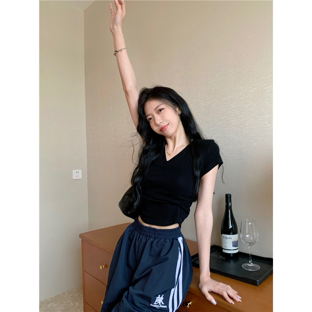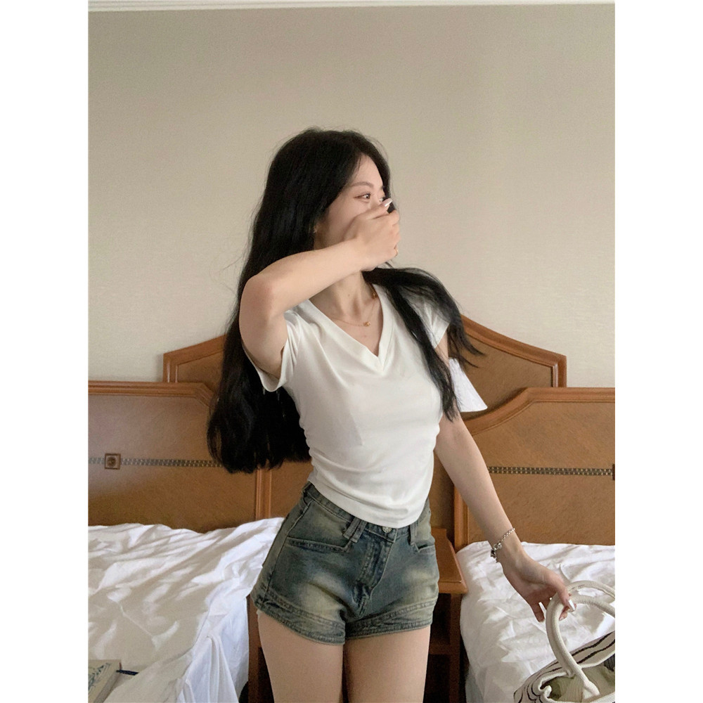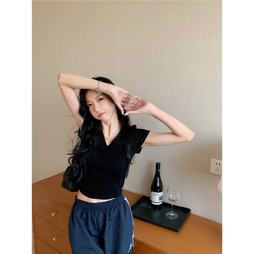 Bella Shop 🌻 ดีไซน์คอวีจีบเอวแคบเสื้อยืดเซ็กซี่สีขาวหวานผู้หญิงฤดูร้อน