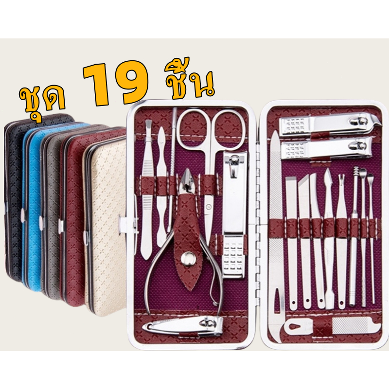 【Product introduction】介绍↓ เซตใหญ่ 19 ชิ้น สี:สีแดง สีทอง สีดำ & สีน้ำเงิน ภายในเซทประกอบด้วย 1.กรรไกรตัดเล็บทรงปากโค้ง (ขนาดเล็ก/กลาง/ ใหญ่) 2.กรรไกรตัดเล็บทรงปากเฉียง 3.ใบมีดสำหรับขูดผิวหนัง (แบบแบน/เฉียง/โค้ง) 4.ส้อมผิวตาย 5.กรรไกร 6.แหนบ 7.ที่ปั่นหู 8.ที่กดสิวอุปกรณ์ดูแลเล็บครบเ