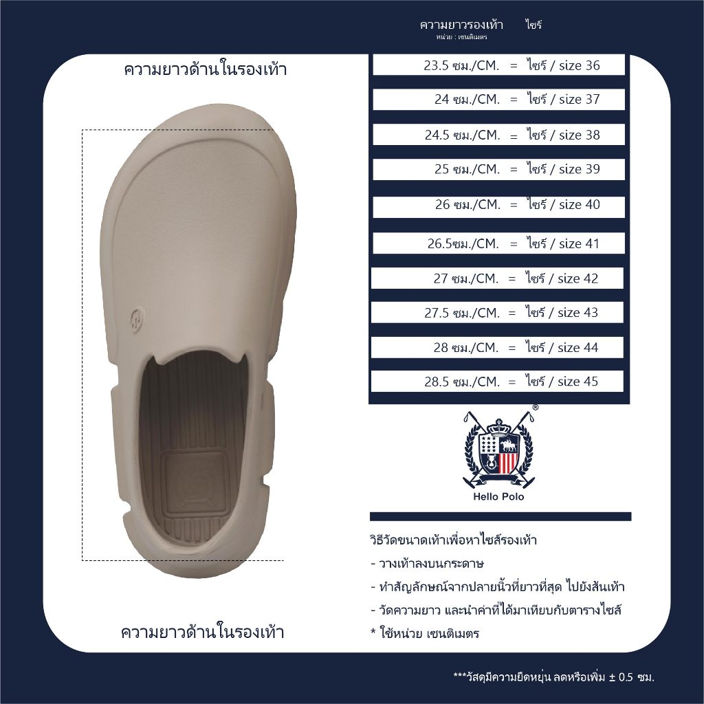... ่ถูกออกแบบให้เหมือนยางล้อรถยนต์และพื้นรองเท้าผลิตจากยาง EVA ช่วยในการยึดเกาะและสามารถสลัดโคลนได้ดี ทั้งทนทานและน้ำหนักเบา ให้ Off-road คู่นี้เป็นรองเท้าที่ใช่สำหรับคุณ !คุณสมบัติ - ทำจากวัสดุจากยาง EVA อย่างดี แข็งแรงทนทาน ใช้ได้ยาวนาน - ถนอมเท้า ยืดหยุ่นสูง รองรับแรงกระแทกได้ดี แม้ยืนและเดินนาน ๆ - น้ำหนักเบา ทำความสะอาดก็ง่าย ไม่อมน้ำ ข้อแนะนำในการใช้งานของสินค้า - ไม่ควรเก็บรองเท้าไว้ในที่มีความร้อนหรือแสงแดดจัด - ไม่ควรเก็บรองเท้าไว้ที่เปียกชื้น - ควรเก็บรองเท้าในอากาศที่มีการถ่ายเทได้ดี เงื่อนไขการเปลี่ยน/คืนสินค้า - สามารถเปลี่ยนสินค้าได้ภายใน 7 วันหลังจากลูกค้าได้รับสินค้า - สินค้าจะไม่ต้องถูกใช้งานหรือเกิดความเสียหาย - สามารถเปลี่ยนได้เฉพาะไซส์ของสินค้าเท่านั้น - ลูกค้าต้องออกค่าจัดส่งมาเปลี่ยนสินค้าเอง - เมื่อทางร้านได้รับสินค้าแล้ว จะทำการตรวจสอบและดำเนินการเปลี่ยนสินค้าให้ไม่เกินภายใน 7 วัน หมายเหตุ - คุณลูกค้าควรวัดความยาวเท้าแล้วเทียบกับตารางไซส์รองเท้าก่อนสั่งซื้อสินค้า - หากลูกค้าเท้าอูมควรเพิ่ม 1 ไซส์ หากไม่มั่นใจสามารถติดต่อสอบถามแอดมินได้เลยนะคะ
