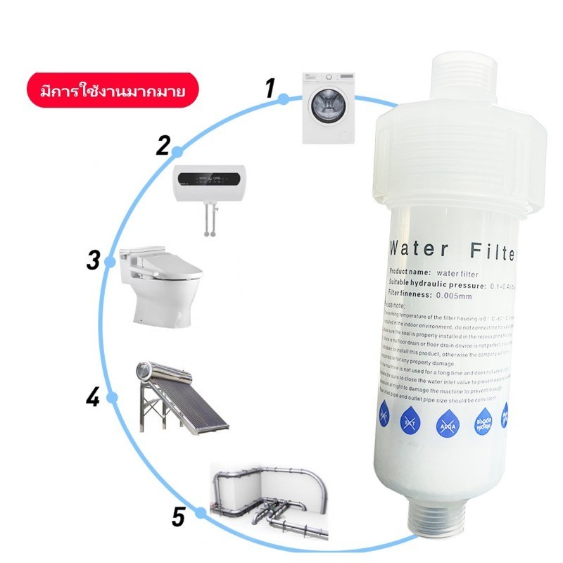 5 ไมครอน ฟิลเตอร์กรองน้ำ ถอดเปลี่ยนไส้กรองได้ กรองน้ำ กรอง ฝักบัว (CH-052) เครื่องกรองน้ำ ฟิลเตอร์กรองน้ำ สามารถใช้ต่อกับสายน้ำดี ฝักบัว อ่างล้างหน้า อ่างล้างจาน เครื่องซักผ้า กรองอนุภาคขนาดเล็กได้ถึงขนาด 5 ไมครอน กรองกรองอนุภาคได้เล็กมากเมื่อเทียบกับ เส้นผมที่มีขนาดถึง 50-70 ไมครอน หรือ เทียบก