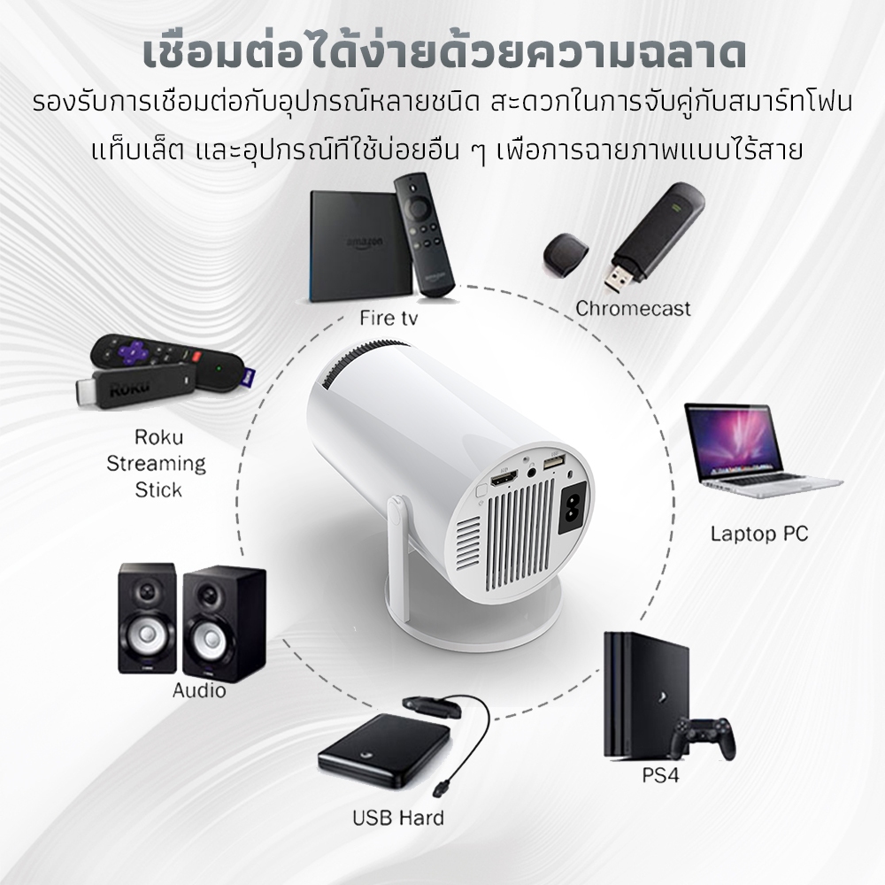 ... ยเทคโนโลยีโดยไม่ต้องเสียเงินเป็นจำนวนมาก 🔹โปรเจ็กเตอร์นี้มอบประสบการณ์การใช้งานที่เรียบง่ายในราคาสุดคุ้ม เพียงเชื่อมต่ออุปกรณ์ และฟังก์ชันการสะท้อนหน้าจอก็สามารถฉายหน้าจอโทรศัพท์มือถือ แท็บเล็ต หรือคอมพิวเตอร์ของคุณลงบนผนัง เปลี่ยนให้กลายเป็นโรงภาพยนตร์ส่วนตัวของคุณได้ในทันที . 😃ตอนนี้ คุณสามารถเริ่มต้นยุคจอใหญ่ของคุณได้อย่างง่ายดาย 🔹ไม่ว่าคุณจะแชร์ภาพยนตร์กับครอบครัวหรือเล่นเกมกับเพื่อน ๆ โปรเจ็กเตอร์นี้สามารถมอบประสบการณ์ที่น่าตกใจอย่างที่ไม่เคยมีมาก่อนให้กับคุณ มีน้ำหนักเบาและพกพาสะดวก เปลี่ยนห้องนั่งเล่นของคุณให้กลายเป็นศูนย์รวมความบันเทิงได้ทุกที่ทุกเวลา 🔹ดีไซน์สวยงาม น้ำหนักเบา พกพาสะดวก พร้อมขาตั้ง ปรับทิศทางการหมุนได้ถึง 180 องศา 🔹ดูการฉายภาพเหมือนอยู่ในโรงหนัง โดดเด่นด้วยความคมชัดระดับ Full HD และระบบแก้ไขความผิดเพี้ยนของภาพอัตโนมัติ 🔹ใช้โปรเจ็กเตอร์นี้เพื่อเริ่มต้นการเดินทางบนจอภาพยนตร์ของคุณ! ให้ทุกคืนเต็มไปด้วยงานฉลองภาพ! 🔹🔷HY300 รุ่นหน้าจอเดียวกันแบบมีสาย: 🔹ความละเอียดดั้งเดิม: HD 1920*1080 พิกเซล 🔹แรงดันไฟฟ้า (โวลต์): AC90-260V~50-60Hz 🔹กำลังไฟฟ้า: 60W 🔹ประเภทจอภาพ: เทคโนโลยี LCD เดี่ยวขนาด 2.7 นิ้ว 🔹ความสว่าง: 120 แอนซี่ ลูเมน 🔹อัตราส่วนคอนทราสต์: 2000:1 🔹อายุหลอดไฟ: 50,000 ชม 🔹ขนาดฉายภาพ : 30-100 นิ้ว 🔹อัตราส่วนภาพ: 4:3/16:9 เนทิฟ 🔹ระยะขว้าง: 1.2-2.5M 🔹ภาษา: หลายภาษา 🔹โฟกัส: โฟกัสแบบแมนนวล 🔹ความผิดเพี้ยนของภาพ: การบิดเบือนทางดิจิตอล ±50° 🔹อินเทอร์เฟซ (อินพุต): AV/USB/HDMI 🔹อินเทอร์เฟซ (เอาต์พุต): เสียง 3.5 มม 🔹ลำโพง: 4Ω3W*1 ลำโพง 🔹เสียงรบกวน: