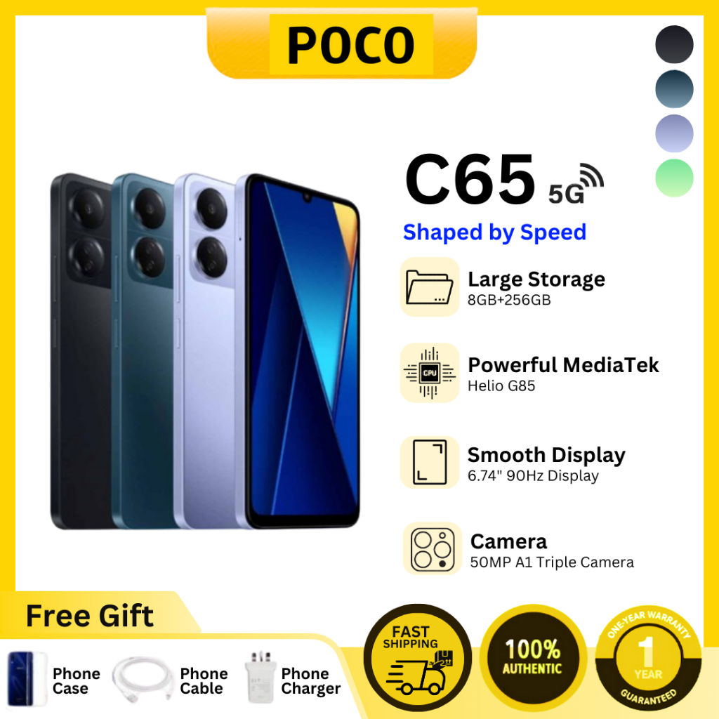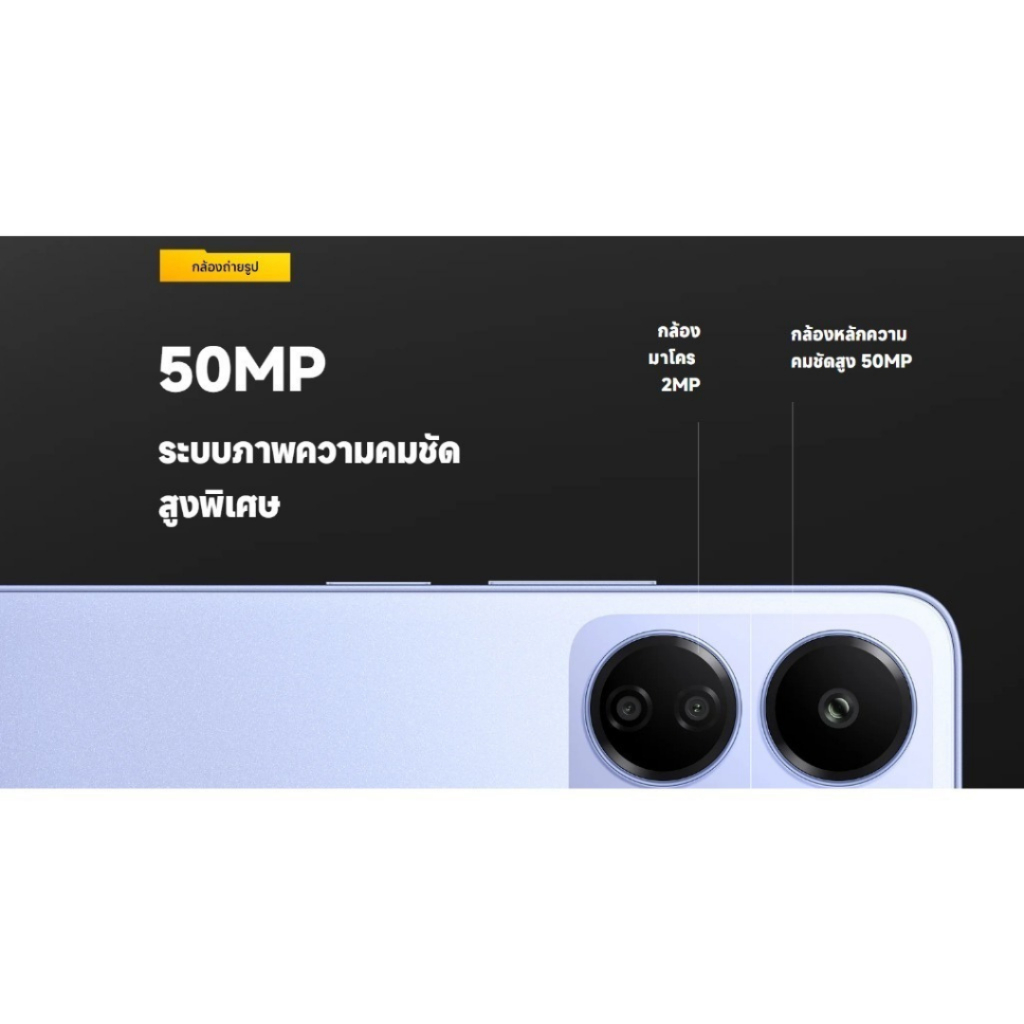 ... อรี่ความจุสูง 5000mAh (typ) สตรีมวิดีโอได้นานสูงสุด 23 ชั่วโมง รองรับการชาร์จเร็ว 18W* ชาร์จเพียง5นาที เล่นเพลงได้นาน5ชั่วโมง! หน้าจอ หน้าจอสุดสมจริง 6.74 นิ้ว ตื่นตายิ่งขึ้นบนหน้าจอขนาดใหญ่ มาพร้อมหน้าจอระดับ HD+ ขนาด 6.74 นิ้ว ที่หาได้ยากมากในโทรศัพท์ระดับเดียวกัน! ให้คุณได้สัมผัสประสบการณ์ภาพอันน่าทึ่งขณะใช้งาน รับชมวิดีโอหรือเล่นเกม หน้าจอกระจก Corning® Gorilla® Glass การปกป้องที่แข็งแกร่งขึ้น 90Hz อัตรารีเฟรชสูง เพลิดเพลินกับประสบการณ์ภาพสุดสมจริงอันลื่นไหลบนหน้าจอขนาดใหญ่ 6.74 นิ้ว พร้อมอัตรารีเฟรชสูงสุดถึง 90Hz ปกป้องดวงตาจากอาการเมื่อยล้าทางสายตา สัมผัสภาพที่สบายตา คุณจะได้เพลิดเพลินกับการรับชมบนโทรศัพท์โดยรู้สึกไม่ปวดตา ไม่ว่าจะเป็นกลางวันหรือกลางคืน เพราะมีทั้งใบรับรองแสงสีฟ้าต่ำจาก TÜV (โซลูชันซอฟต์แวร์) และใบรับรองความไร้ซึ่งแสงกะพริบจาก TÜV กล้องถ่ายรูป 50MP ระบบภาพความคมชัดสูงพิเศษ กล้องหลักความคมชัดสูง 50MP กล้องมาโคร 2MP กล้องหลักความคมชัดสูง 50MP โหมดภาพบุคคล ความเร็วในการถ่ายภาพบุคคลบนกล้องหลังเพิ่มขึ้น 79%* และความเร็วในการถ่ายภาพกลางคืนเพิ่มขึ้น 19.5%* มีโหมดมากขึ้น น่าตื่นเต้นมากยิ่งขึ้น วงไฟด้านหน้า ยกระดับภาพเซลฟี่ของคุณ กล้องหน้า 8MP มีวงไฟแสงนวลตาที่อัปเกรดใหม่เพื่อให้ภาพเซลฟี่ออกมาสวยงามแม้ในที่แสงน้อยเมื่อเปิดโหมดนี้ กล้องฟิล์ม กล้องถ่ายรูป เทรนด์แฟชั่นในสไตล์คุณ กล้องฟิล์ม C-50D ฟิล์มภาพยนตร์กลางวัน "เหมาะสำหรับการถ่ายภาพบุคคลแนวศิลป์ ในสภาพแวดล้อมที่มีแสงค่อนข้างสว่าง" โหมดมาโคร "ค้นพบความน่าอัศจรรย์มากมายจากรายละเอียด ที่คุณอาจไม่เคยสังเกตเห็นมาก่อน" ประสิทธิภาพการทำงาน โปรเซสเซอร์ Octa-Core ประสิทธิภาพขั้นสุดยอด "เพลิดเพลินกับประสบการณ์ที่ราบรื่น ไม่มีสะดุด จากโปรเซสเซอร์ Octa-Core สุดยอดชิปเซ็ตที่มีความสมดุลระหว่างประสิทธิภาพอันแข็งแกร่งและความประหยัดพลังงาน" สูงสุด 2.0GHz ความเร็ว CPU สูงสุด 16GB พร้อม RAM ที่ขยายเพิ่มได้อีก 8GB* POCO C65 มีให้เลือกในรุ่น 6GB และ 8GB โดยรุ่น 8GB สามารถขยาย RAM เพิ่มได้สูงสุดเป็น 16GB ด้วยเทคโนโลยีการขยายหน่วยความจำเพื่อให้มัลติทาสกิ้งและรันแอปพลิเคชันได้อย่างราบรื่น* การขยายพื้นที่จัดเก็บ 1TB เก็บบันทึกได้มากขึ้น คุณสามารถเก็บทุกภาพถ่าย ไฟล์ รวมถึงแอปและเกมโปรดทั้งหมดของคุณได้อย่างง่ายดาย เพราะสามารถขยายพื้นที่จัดเก็บได้ถึง 1TB ไม่ต้องกังวลเรื่องหน่วยความจำเต็มอีกต่อไป แบตเตอรี่ความจุสูง 5000mAh (typ) ชาร์จเร็ว PD Type-C 18W ดีไซน์ ลุคใหม่ทันสมัยขึ้น ดีไซน์ที่เป็นเอกลักษณ์ของ POCO กรอบกล้องขนาดใหญ่อันแสนโดดเด่น ดีไซน์