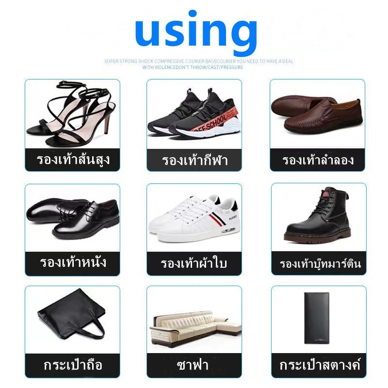 วิธีใช้: 1.ทำความสะอาดบริเวณที่ต้องการซ่อม เช็ดให้แห้งก่อนใส่กาว 2.หยอดกาวใส่บริเวณที่ต้องการซ่อม 3.จากนั้นใช้ไดร์เป่าผมลมร้อนเป่า5-10วินาที 4.แล้วใช้มือกดไว้ 2-3นาที 5.ใช้ของใส่เข้าไปในช่วงหัวรองเท้าให้เต็มแน่น 6.จากนั้นใช้หนังยางมัดทิ้งไว้ 24ชม. 7.ระวังกาวติดโดนบริเวณอื่น -อายุการเก็บ