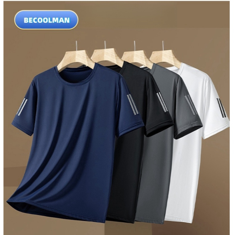 BECOOLMAN-คอกลม ผ้าไหมน้ำแข็ง เย็น แขนสั้น ชาย ฤดูร้อน แบบหลวม ใส่สบาย กีฬา เสื้อยืด