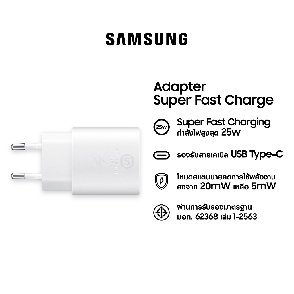 ... านได้สูงสุด 75% นอกจากนี้ยังผลิตจากส่วนผสมของวัสดุที่ไม่ทำลายสิ่งแวดล้อม เป็นอีกทางเลือกหนึ่งในการรักษ์โลก► ปลอดภัยสูงสุดเทียบเท่าความเร็ว ความปลอดภัยเป็นเรื่องสำคัญที่สุด คุณจะปลอดภัยจากกระแสไฟเกิน ไฟฟ้าลัดวงจรและอุณหภูมิสูงเกิน กระแสไฟรั่วต่ำ และภัยอื่นอีกมากมาย► ใช้ได้กับ Type-C โยนใส่กระเป๋าเดียวกับอุปกรณ์อื่นของคุณได้เลย หัวชาร์จรุ่นนี้ใช้ได้กับการชาร์จสูงสุดที่ 25W สำหรับโต๊ะทำงานของคุณและอุปกรณ์ที่รองรับสาย Type-C ทั้งหลาย ซึ่งแน่นอนว่าต้องรวมถึงอุปกรณ์ในตระกูล Galaxy ด้วย ► Specification • Compatibility : Smartphone/Tablet • Connections : USB Type-C • Warranty : 6 Months #อะแดปเตอร์ #Samsung #FastCharging #25W #adapter #25Wadapter#TypeC #ซัมซุง #ที่ชาร์จไฟ #หัวชาร์จ