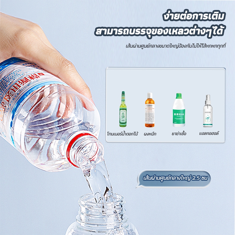 ... ะหยัดแรงในการกด รูปร่างของขวดมีขนาดพอดี หยิบจับสบายมือ สำหรับบรรจุของเหลว เช่น น้ำเปล่า แอลกอฮอล์ หรือน้ำยาฆ่าเชื้อโรคและอื่น ๆ ใช้ในการทำความสะอาดบ้าน ฆ่าเชื้อ ทำสวน เสริมสวยและวัตถุประสงค์ทั่วไป หมายเหตุ : ไม่แนะนำให้นำไปใช้ฉีดน้ำมัน ของเหลวที่มีความหนาแน่นสูง หรือของเหลวที่มีความหนืดและมีความข้นสูง