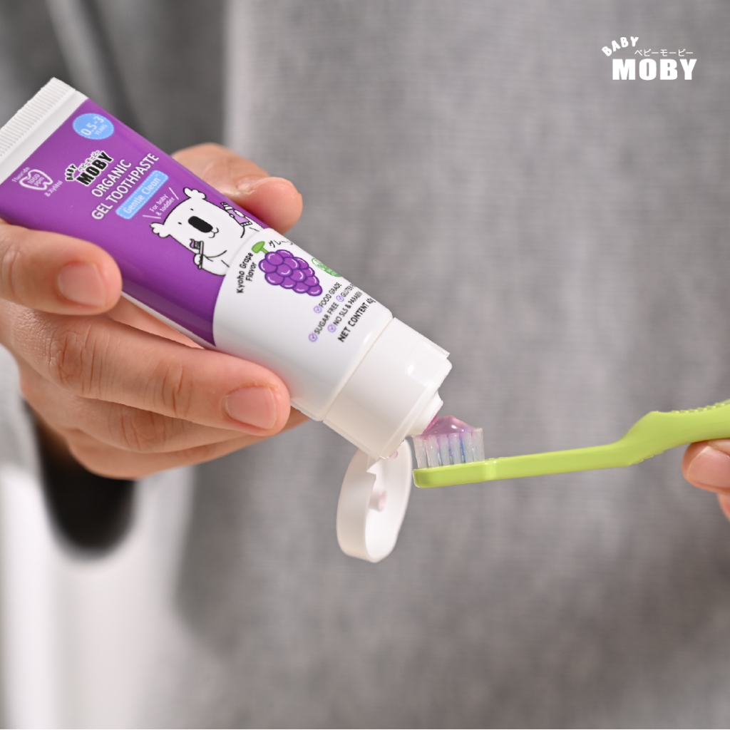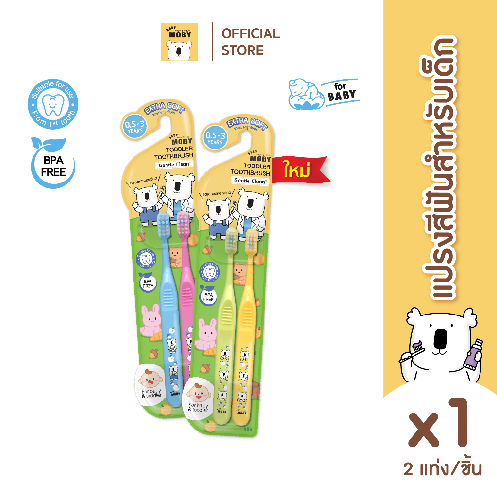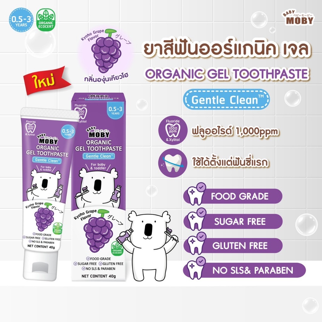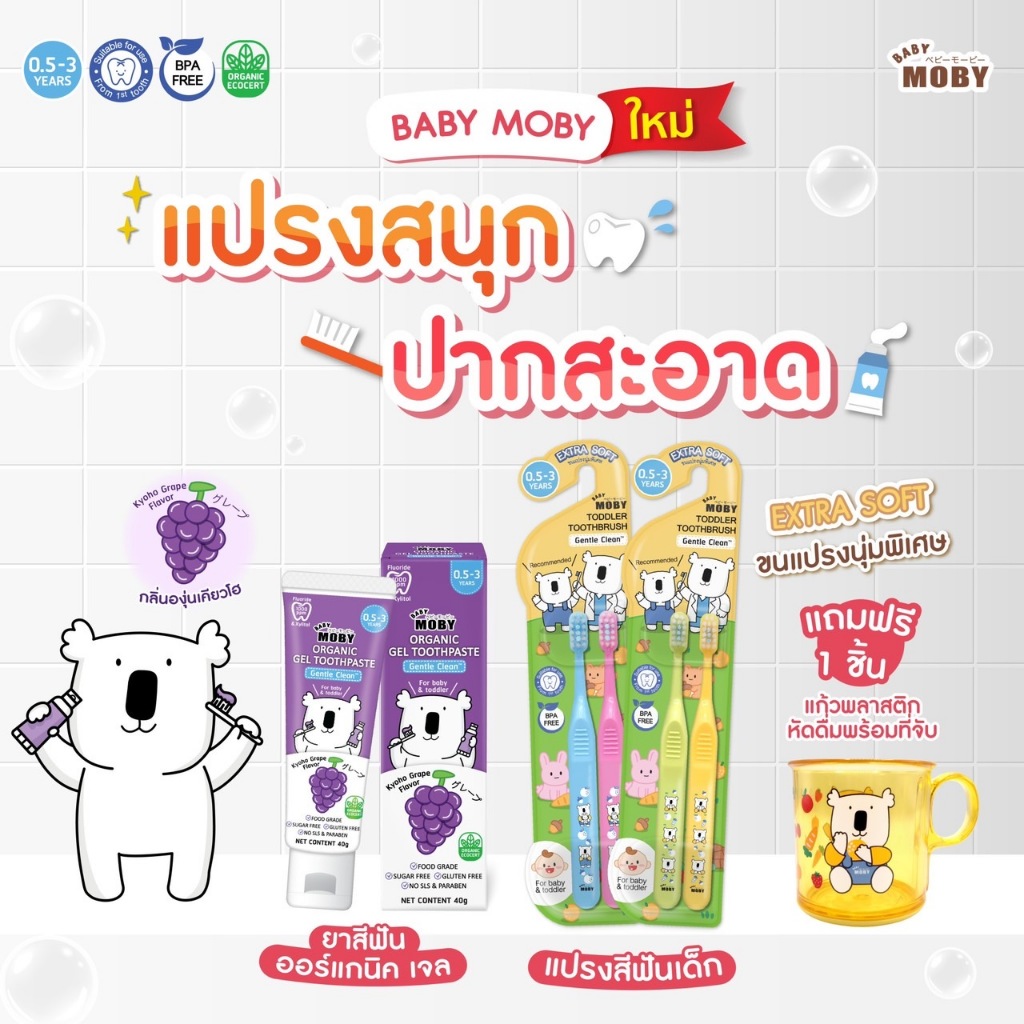 ... ซี่แรก -ควรเปลี่ยนแปรงทุก 3เดือน หรือเมื่อขนแปรงบาน -ขนแปรงของเด็กบานบ่อยเพราะ เด็กชอบกัดขนแปรง เค้าไม่อ้าปากค้างให้แปรง -เมื่อขนแปรงบ่านแล้วขนจะไม่สัมผัสผิวฟันเต็มที่ ทำให้ทำความสะอาดได้ไม่ดี วิธีใช้งาน -ใช้แปรงฟันอย่างน้อยวันละ 2 ครั้ง หรือหลังอาหารทุกมื้อ ข้อแนะนำ -ควรเปลี่ยนแปรงสีฟันใหม่ทุก 3 เดือน ล้างแปรงให้สะอาดหลังการใช้งาน และเก็บไว้ในที่แห้ง วัสดุ -ด้ามแปรงผลิตจากพลาสติกพีพี -ขนแปรงผลิตจากไนล่อน ขนแปรงนุ่มพิเศษ ปลายมน Baby Moby ยาสีฟันออร์แกนิค เจล กลิ่นองุ่นเคียวโฮ ขนาด 40 กรัม/หลอด -ยาสีฟันผสมฟลูออไรด์ผสานสารสกัดใบฝรั่งออร์แกนิคมาตฐาน ECOCERT และสารสกัดอะโลเวร่าเจล ช่วยคงความชุ่มชื้นในช่องปาก -เจลสูตร Gentle Clean -มีฟลูออไรด์ 1000ppm และ Calcium Lactate -ช่วยป้องกันฟันผุ -ใช้ Xylitol แทนน้ำตาล -ปราศจากกลูเตน พาราเบน และ SLS ที่อาจก่อให้เกิดการระคายเคือง -ใช่ได้ตั้งแต่ 5 เดือนขึ้นไป -0.5-3 ปี ใช้ยาสีฟันขนาดเท่าเม็ดข้าวสาร -3 ปีขึ้นไปใช้ยาสีฟันขนาดเท่าเม็ดถั่วเขียว วิธีใช้ -แปรงฟันอย่างน้อยวันละ 2 ครั้ง เช้าและก่อนนอนหรือหลังอาหารทุกเมื้อ -แปรงฟันแล้วไม่ต้องบัวนน้ำ จะช่วยให้ฟูลออไรค์เกาะติดผิวฟันได้นานขึ้น ใช้ผ้าก๊อซเช็ดฟองส่วนเกินออก คำเตือน -มีสาร Sodium Fluoride -เด็กอายุต่ำกว่า 6 ปี ควรใช้งานสีฟันปริมาณเท่าเมล็ดถั่วเขียว และมีผู้ใหญ่ดูแลขณะแปรงฟัน ในกรณที่เด็กได้รับสารฟลูออไรด์จากแหล่งอืนด้วย ให้ปรึกษาแพทย์หรือทันตแพทย์ Baby Moby, GENTLENESSTHATGROWSWITHYOURBAB