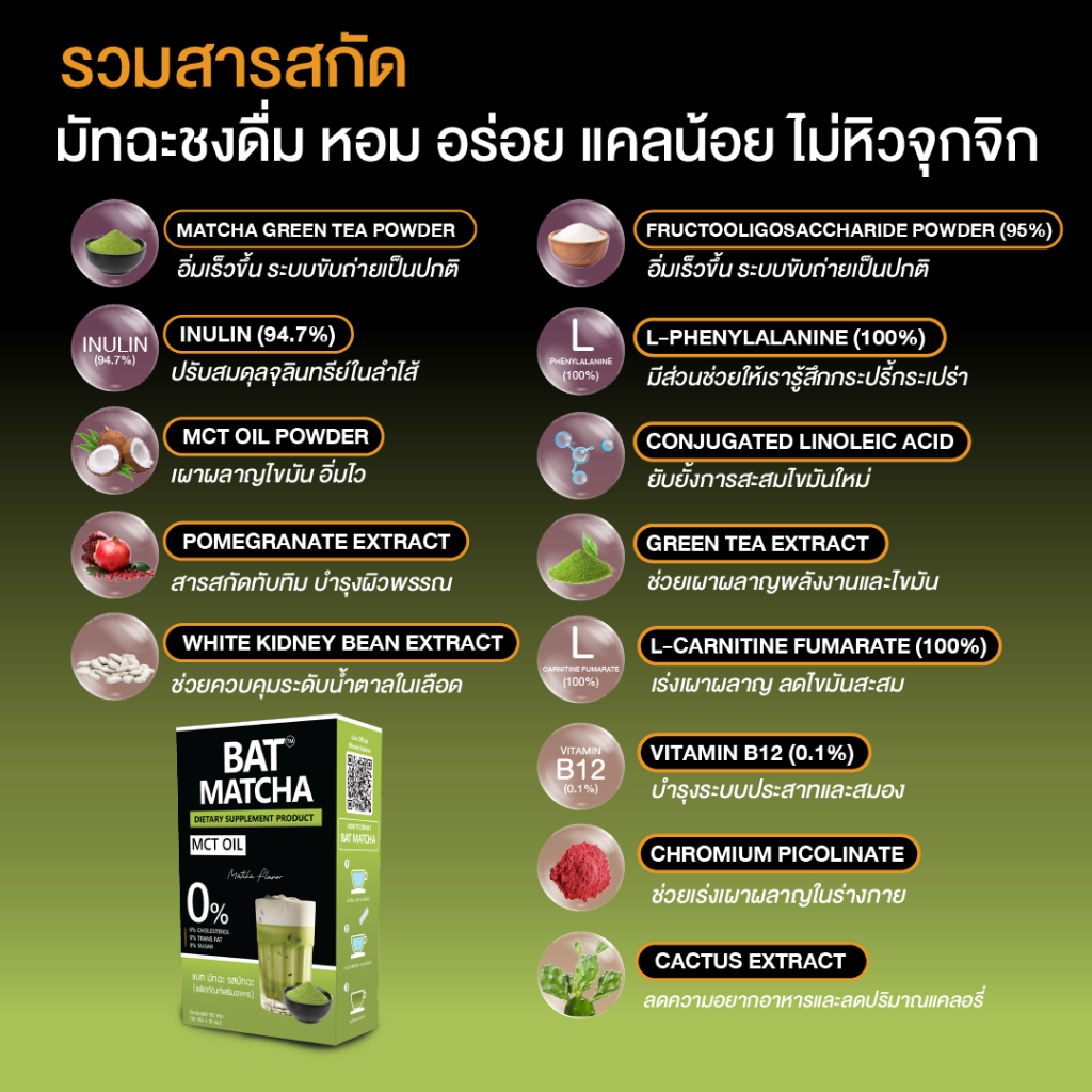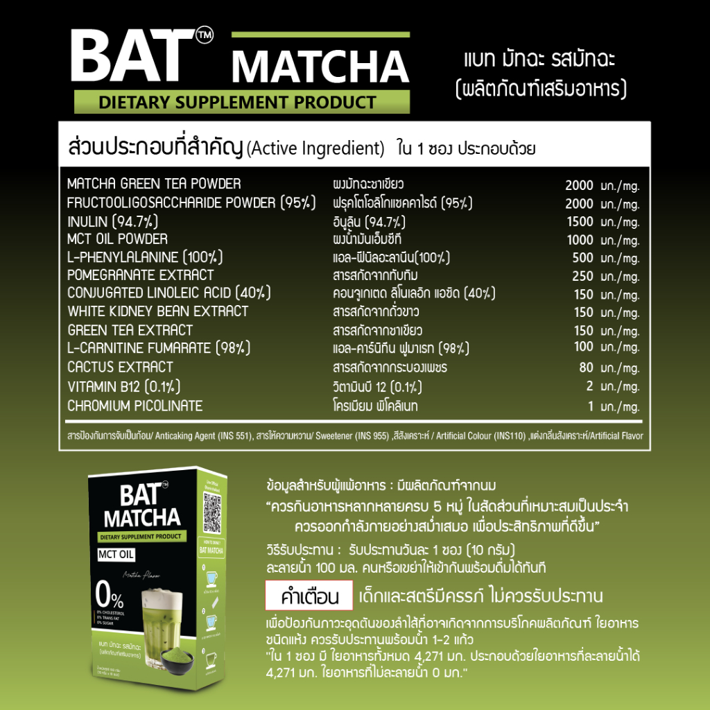 ... ่านั้น ✅ หากได้รับสินค้าไม่ครบ กรุณาส่งคลิปวีดีโอ ยืนยันทางเเชท ✅ หากไม่มีคลิปยืนยัน ร้านค้าขออนุญาตไม่รับผิดชอบทุกกรณี 🙏🏻🙏🏻 ขอบพระคุณลูกค้าทุกท่าน 🙏🏻🙏🏻 ------------------------------- BAT MATCHA FLAVOR (Dietary Supplement Product) แบท มัทฉะ รสมัทฉะ (ผลิตภัณฑ์เสริมอาหาร) เลข อย. จดแจ้ง 11-1-14859-5-0172 น้ำหนักสุทธิ : 100 กรัม (10 ซอง) แบท มัทฉะ ชาเขียวเข้มข้น ชงดื่ม คุมหิว อิ่มนาน ควบคุมน้ำหนัก อร่อย ไขมัน น้ำตาล 0% แคลต่ำ เหมาะสำหรับผู้ที่ชอบดื่มน้ำหวาน ดื่มแล้วไม่อ้วน ร่างไม่บวม ไม่บาน ให้คุณสุขภาพดี Healthy ได้ทุกวัน BAT MATCHA ชงอิ่ม ไร้น้ำตาล ชาเขียวมัทฉะกลิ่มหอม รสชาติกลมกล่อม อร๊อย อร่อย ที่สำคัญยังช่วยให้คุณสดชื่น ตื่นตัวระหว่างวัน ในชาเขียวมัทฉะ มีปริมาณสารต้านอนุมูลอิสระที่ช่วยเรื่องระบบเผาผลาญ ลดคอเลสเตอรอลได้ดี นอกจากนี้มีสารสกัด L-CARNITINE 98 % MCT OIL เร่งเผาผลาญ ลดไขมันสะสม ลดขนาดไขมัน ยับยั้งการสะสมไขมันใหม่ และ FRUCTOOLIGOSACCHARIDE (95%) ทำให้อิ่ม ขับถ่าย ช่วยกระชับสัดส่วนได้ดี หิวน้อย อิ่มนาน เร่งเผาผลาญ 0% No Sugar added ไม่มีไขมันทรานส์ ไม่มีคอลเลสเตอรอล แบท มัทฉะ ✅ช่วยคุมหิว อิ่มนาน ✅ช่วยลดการกินจุกจิกระหว่างวัน ✅ช่วยเร่งการเผาผลาญไขมัน ✅สลายไขมันส่วนเกิน ✅สดชื่น ดับกระหาย ไม่ง้อน้ำหวาน ✅อร่อยเข้มข้น ไม่มีน้ำตาล BAT MATCHA เหมาะกับใคร ✅ ผู้ที่ต้องการควบคุมน้ำหนัก ✅ ผู้ที่ต้องการคุมอาหาร ✅ ผู้ที่ไม่มีเวลาออกกำลังกาย ✅ผู้ที่ต้องการลดน้ำตาล ของหวาน ✅ต้องการความสดชื่นระหว่างวัน ✅Ingredients BAT MATCHA ⭐️MATCHA GREEN TEA POWDER ⭐️FRUCTOOLIGOSACCHARIDE POWDER (95%)/ ฟรุคโตโอลิโกแซคคาไรด์ (95%) ⭐️INULIN (94.7%) / อินูลิน (94.7%) ⭐️MCT OIL POWDER/ผงน้ำมันเอ็มซีที ⭐️L-PHENYLALANINE (100%) /แอล- ฟีนิลอะลานีน ⭐️POMEGRANATE EXTRACT / สารสกัดจากทับทิม ⭐️CONJUGATED LINOLEIC ACID (40%) /คอนจูเกเตด ลิโนเลอิก แอซิด (40%) ⭐️WHITE KIDNEY BEAN EXTRACT /สารสกัดจากถั่วขาว ⭐️GREEN TEA EXTRACT / สารสกัดจากชาเขียว ⭐️L-CARNITINE FUMARATE 100% / แอล-คาร์นิทีน ฟูมาเรท (100%) ⭐️CACTUS EXTRACT / สารสกัดจากกระบองเพชร ⭐️VITAMIN B12 /วิตามินบี 12 ⭐️CHROMIUM PICOLINATE (100%) / โคเมียม พิโคลิเนท (100%) ✅วิธีรับประทาน : ⭐️ สูตรอิ่มนาน ลดหิวจุกจิก 1 ซอง ช่วงเช้า หรือบ่าย ⭐️ สูตรลดแบบเร่งด่วน 2 ซอง ช่วงเช้า และ ช่วงบ่าย ชงได้ทั้งร้อนและเย็น รสชาติกลมกล่อม หอม อร่อย