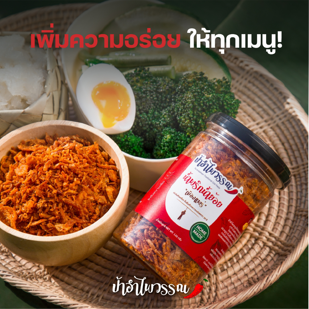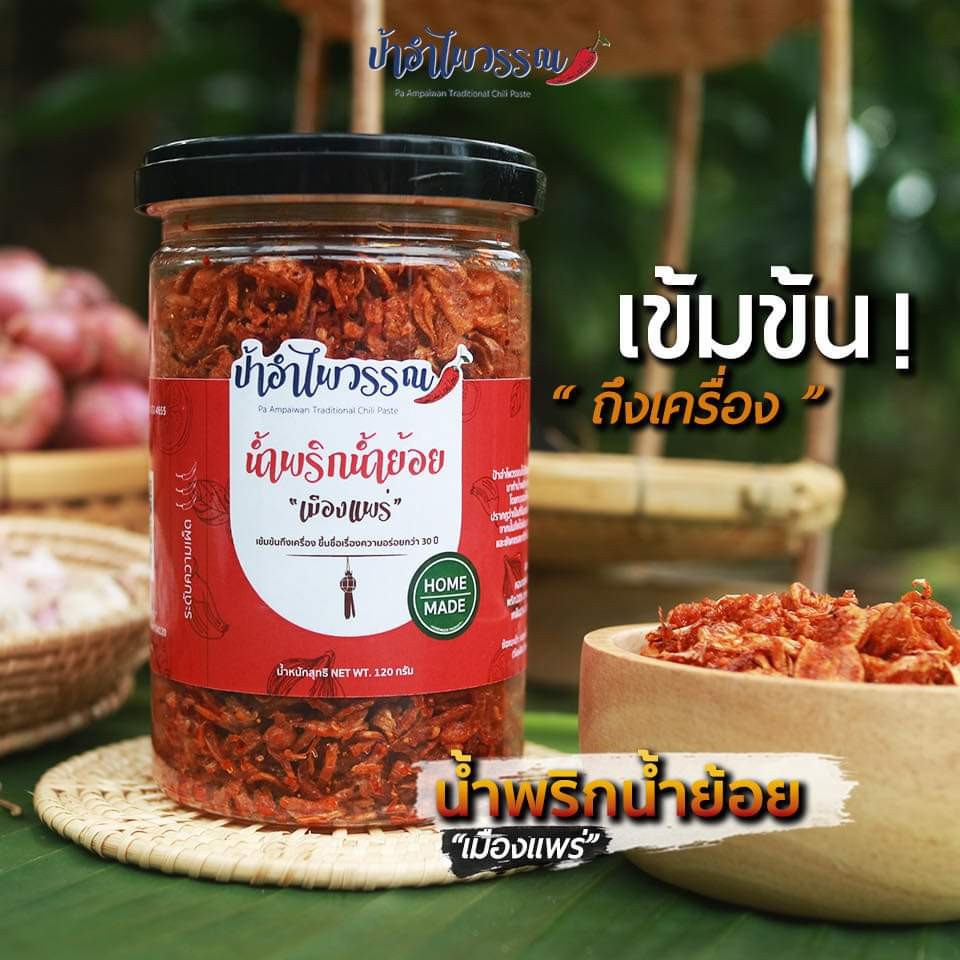 น้ำพริกน้ำย้อย "เมืองแพร่" ป้าอำไพวรรณ ใช้วัตถุดิบท้องถิ่นคุณภาพดี รสเด็ด เข้มข้นถึงเครื่อง รับประทานกับอะไรก็อร่อย! ข้าวสวยร้อนๆ ไข่เจียว หรือไข่ต้มก็อร่อยเหมือนกัน ส่วนประกอบ : หอมแดง กระเทียม พริก กากหมู ผงปรุงรส เกลือ และน้ำตาล ขนาดบรรจุ : 120 กรัม ข้อแนะนำ : ควรเก็บไว้ในที่แห้งและปิ