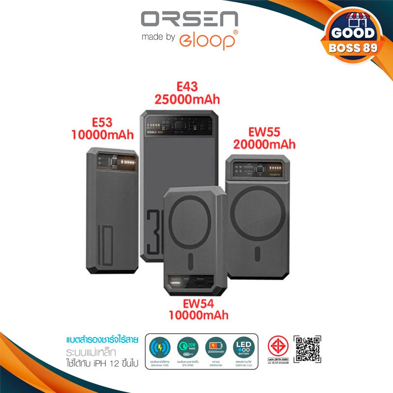 ・ Orsen by Eloop E43 ความจุ 25000mAh รองรับเทคโนโลยีชาร์จเร็ว QC 3.0 | PD 30W ・ Orsen by Eloop E53 ความจุ 10000mAh รองรับเทคโนโลยีชาร์จเร็ว QC 3.0 | PD 20W ・ Orsen by Eloop E59 ความจุ 20000mAh รองรับเทคโนโลยีชาร์จเร็ว QC 3.0 | PD 30W ・ Orsen by Eloop EW54 PD 20W ความจุ 10000mAh MagCharge Ma