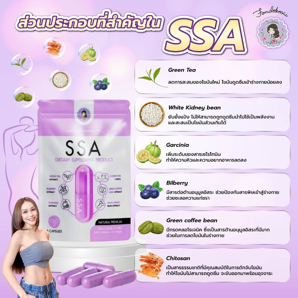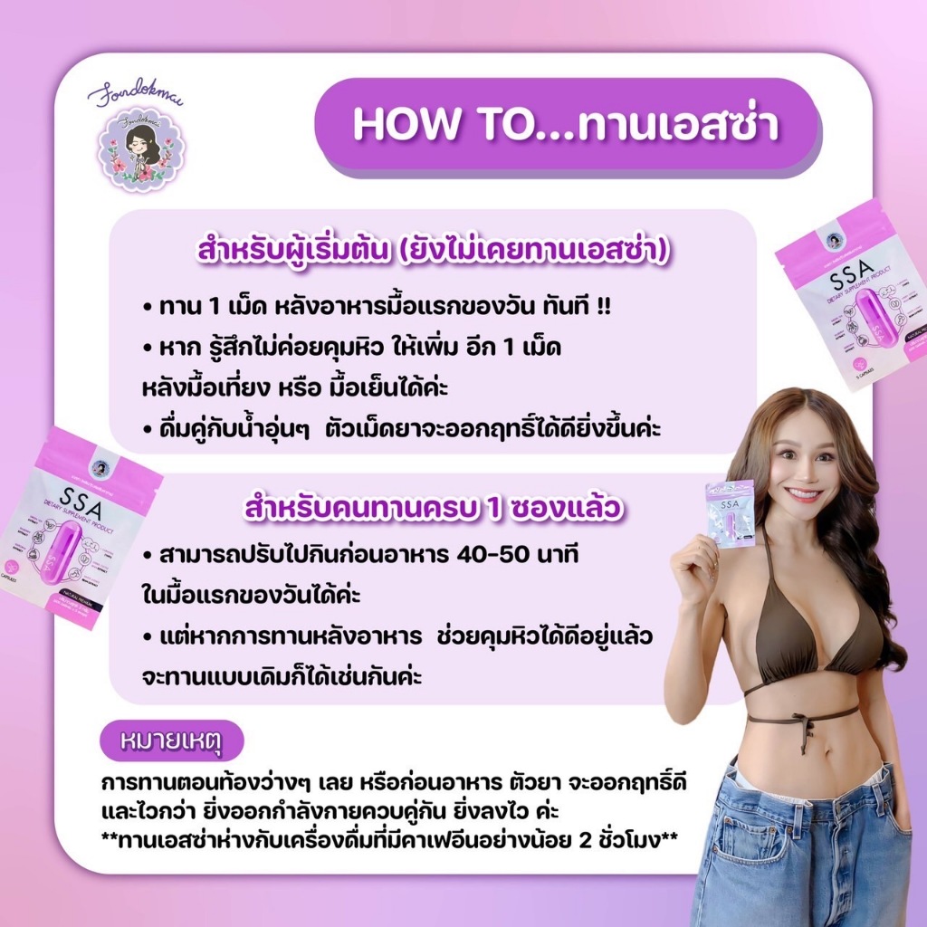 อาหารเสริมลดน้ำหนัก เอสซ่า ผลิตภัณฑ์ลดน้ำหนัก 1 ซองลดได้ 1-3 กิโลกรัม 1 ซอง มี 5 แคปซูล โปรนี้ได้ 3 ซองจร้า บุคคลที่ไม่แนะนำให้ทาน - ผู้ที่มีโรคประจำตัว - สตรีมีครรภ์ และ ผู้ที่ให้นมบุตร ทานวันละ 1 แคป หลังอาหาร มื้อแรกของวัน ก่อนทานแนะนำให้ทานดีท็อกก่อน 7 วันนะคะ
