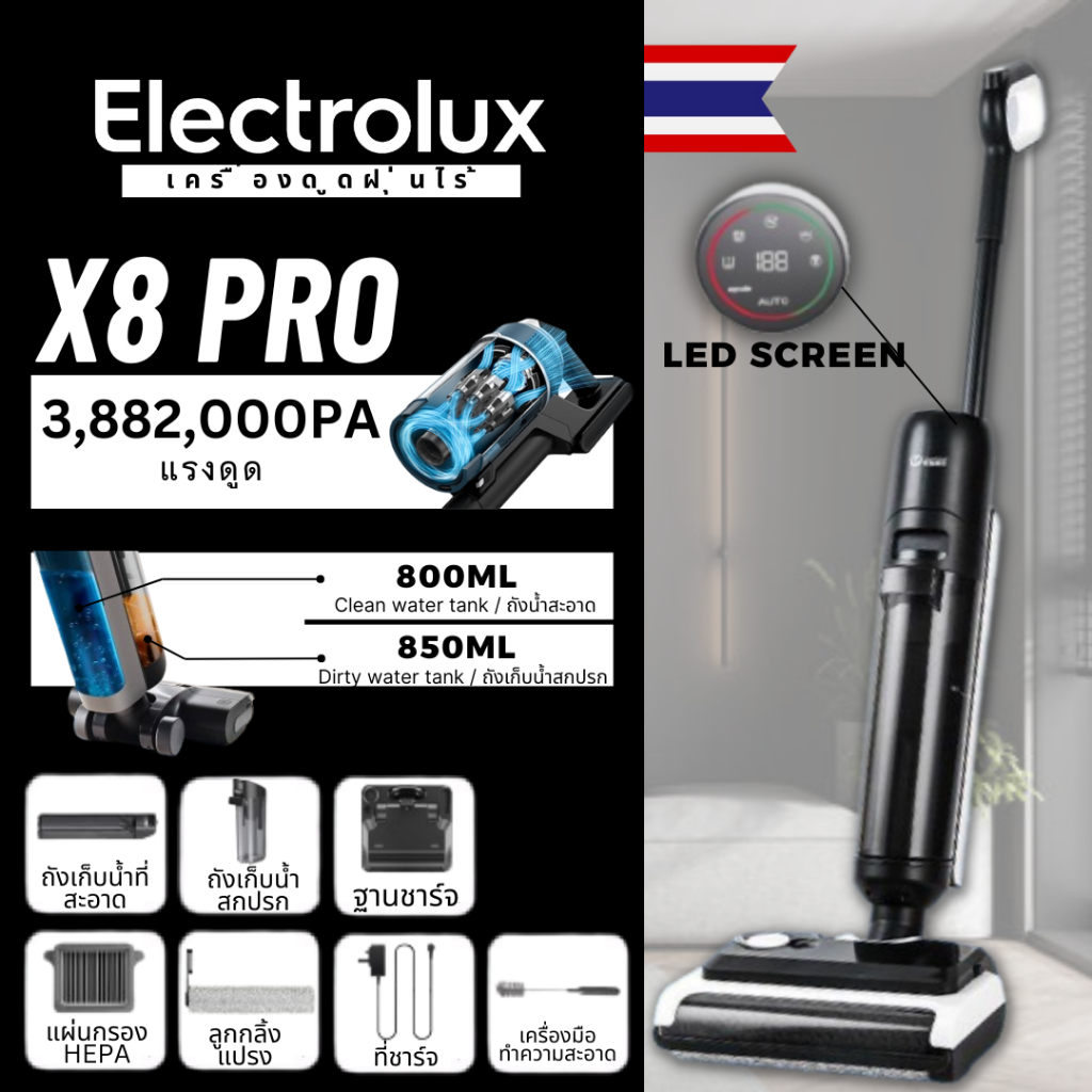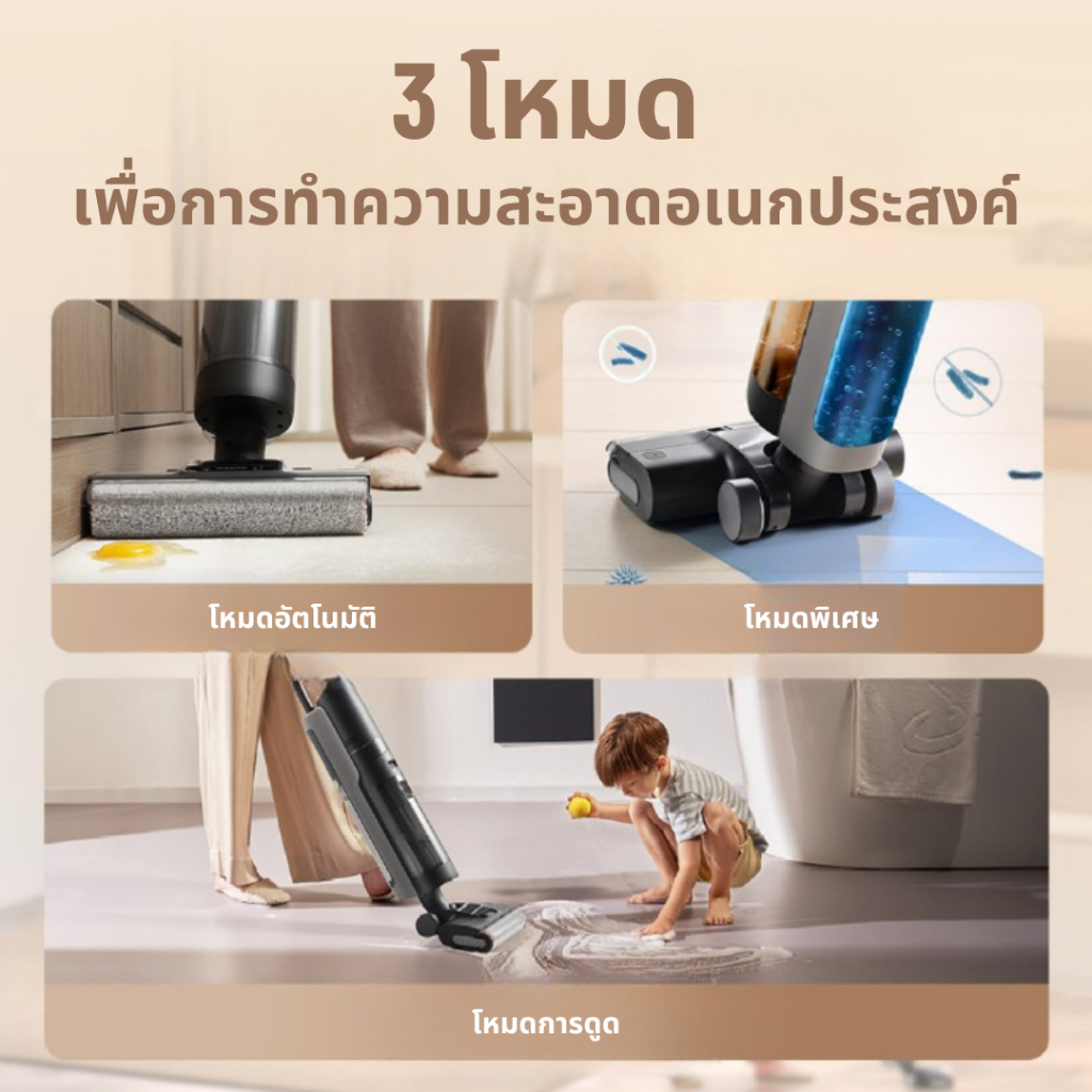 ... ลิตภัณฑ์ใด ๆ พร้อมการรับประกัน 7 ปี 🛒 ขอบคุณที่อุดหนุนนะคะ 📦มีอะไรอยู่ในกล่อง •ตัวเครื่องหลัก x1 •ที่จับ x1 •ตัวกรองสำรอง x1 •แปรงทำความสะอาด x1 •ฐานชาร์จ x1 •ลูกกลิ้งแปรงสำรอง x1 •น้ำยาทำความสะอาด x1 X8 Pro Cordless wet & dry mop Vacuum (X8 Pro)เครื่องดูดฝุ่นถูพื้นเปียกและแห้งไร้สาย ✅️แรงดูดทรงพลัง สูงถึง 3,882,000 PA ปรับโหมดแรงดูดได้ 2 ระดับ : Low Mode / High Mode ✅️ประหยัดเวลา ไม่เปลืองแรง การันตีความสะอาด ปราศจากฝุ่นและคราบสกปรกอย่างแน่นอน ✅️มาพร้อมฟังก์ชั่น Self Cleaning กดปุ่มเดียวล้างทำความสะอาดตัวเครื่องได้เองเสร็จสรรพ ✅️ไม่ต้อออกแรงให้เหนื่อยด้วย Self Driving System ช่วยในการขับเคลื่อนไปด้านหน้า แค่ประคองเครื่องไปในทิศทางที่ต้องการ ประหยัดแรงได้อีกเยอะ ✅️ดูดฝุ่น – ล้าง – ขัดถู ไปพร้อมๆกัน ไม่ว่าจะฝุ่นละออง เศษอาหาร คราบสกปรก ก็ทำความสะอาดได้ในขั้นตอนเดียว ✅️แท๊งค์น้ำดีความจุ 700ml. แท๊งค์น้ำเสียความจุ 900ml. ✅️Micro Fiber Rolling Brush ม๊อบถูพื้นทรงแยมโรล สำหรับดูดซับของแหลวและสิ่งสกปรกออกจากพื้น จะหมุนด้วยความเร็วถึง 70,000 rpm. ช่วยเพิ่มประสิทธิภาพให้สะอาดหมดจดยิ่งกว่าเดิม ✅️Digital Display หน้าจอดิจิตอล คอยบอกสถานะ ขณะเครื่องกำลังทำงาน ✅️Li-Ion Battery 4,000 mAh ใช้งานได้นานจุใจ ✅️Charging Base มีแท่นชาร์จที่ทำให้สามารถจัดเก็บตัวเครื่องและอุปกรณ์อื่นๆ ได้อย่างเป็นระเบียบเรียบร้อย หลังจากใช้งานเสร็จแล้วเพียงวางกลับเข้าแท่นชาร์จ และเสียบสายชาร์จก็เป็นอันเสร็จสิ้นขั้นตอนการชาร์จแบตเตอรี่ ✅️Hepa Filter กรองฝุ่นได้ละเอียดแม้ไรฝุ่นก็ไม่เล็ดลอด ✅️รับประกันมอเตอร์ 5 ปี 📣 Self Cleaning System ฟังก์ชั่นล้างทำความสะอาดตัวเครื่องอัตโนมัติ เพียงกดปุ่ม Self-Cleaning ค้าไว้ 3 วินาที เครื่องก็จะเข้าสู่โหมดล้างทำความสะอาดตัวเอง โดยการฉีดน้ำล้างแปรงและช่องดูดสิ่งสกปรก จากนั้นจะเพิ่มความเร็วในการหมุนหัวแปรง เพื่อปั่นให้หัวแปรงและผ้าถูแห้งหมาด 📣 Self Driving System ระบบแรงขับเคลื่อนไปด้านหน้า ที่จะช่วยให้เราไม่ต้องแบกรับน้ำหนักของตัวเครื่อง เพียงแค่เราประคองที่ด้ามจับแล้วบังคับไปในทิศทางที่ต้องการทำความสะอาด ออกแบบมาเพื่อรองรับการใช้งานให้ครอบคลุมสำหรับทุกเพศ ทุกวัย -️ เงื่อนไขการรับประกัน 1.สินค้าของแท้ 100% รับประกันศูนย์ไทย 5ปี เงื่อนไขการรับประกัน บางกรณีอาจมีค่าใช้จ่ายเพิ่มเติมค่ะ 2.กรณีสั่งสินค้าผิดรุ่น ผิดสี ทางร้านขอสงวนสิทธิ์ไม่รับเปลี่ยนหรือคืนสินค้า รบกวนตรวจสอบให้ถี่ถ้วนก่อนกดสั่งนะคะ 3..กรณีเครื่องมี รอยตำหนิ / หน้าจอแตก / ตัวเครื่องมีรอยบุบ / แตก ต้องแจ้งภายใน 24 ชม. ** พร้อมภาพถ่าย วิดีโอตอนแกะกล่องสินค้า ** หากไม่มีหลักฐาน ข้อมูลตามที่ทางร้า