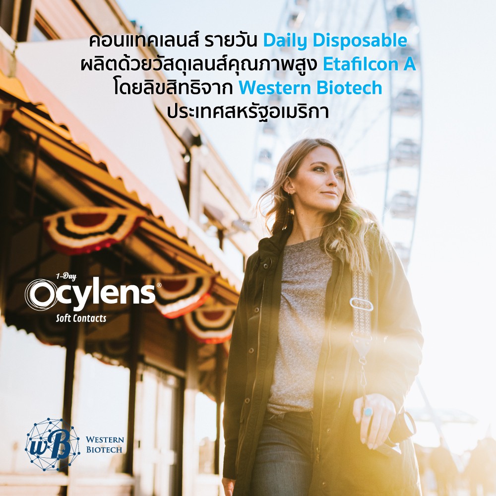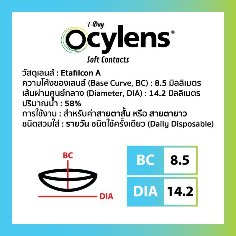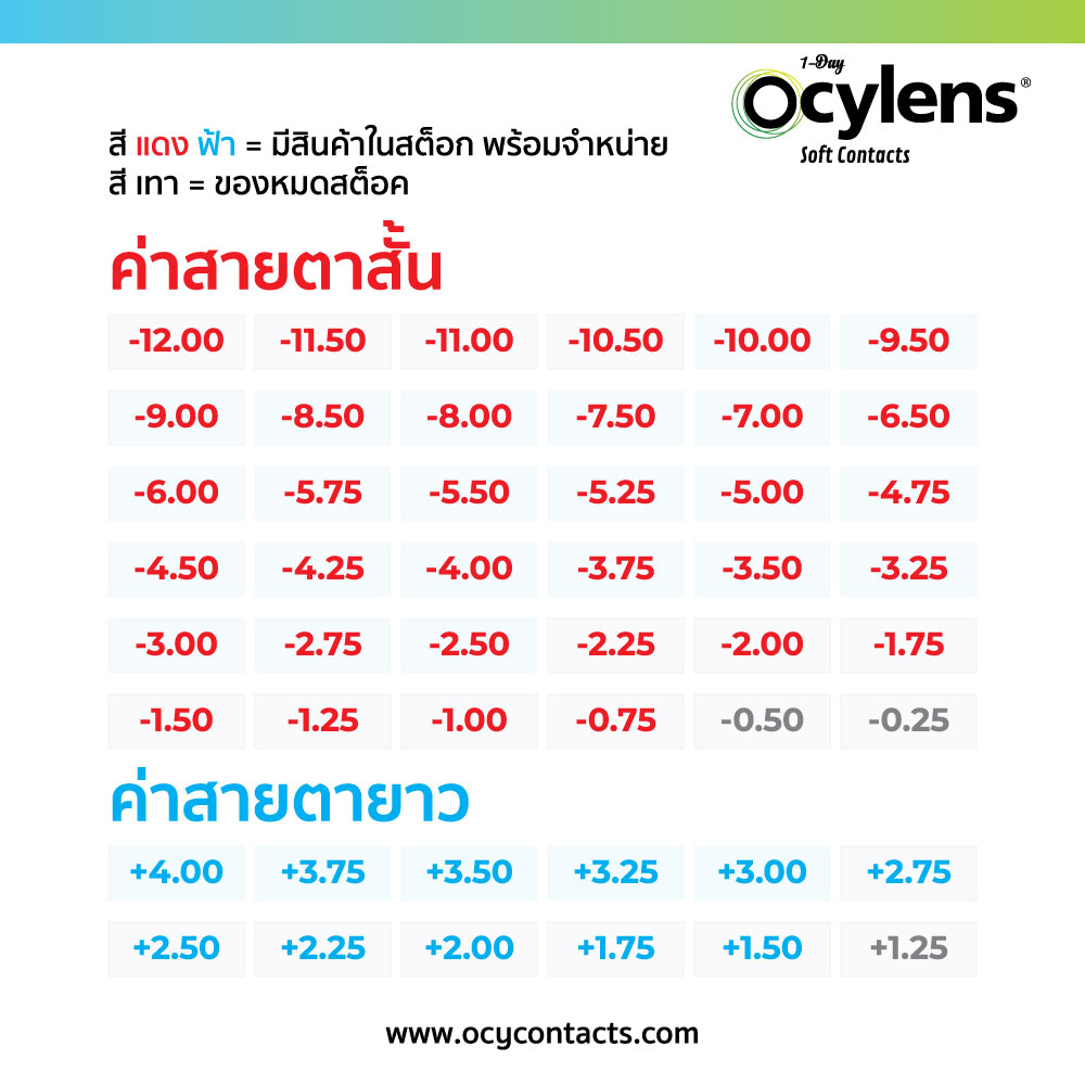 ... สมาชิกกับเราได้ (ค่าธรรมเนียมสมาชิกปีแรกฟรี) * Ocylens กล่องใหญ่ 30 เลนส์ (15 คู่ ใช้ได้ 15 วัน) ราคาปกติกล่องละ 840 บาท * สมาชิก Ocy จะได้รับสิทธิ ซื้อ 1 แถม 1 ดังนั้น จ่ายเพียง 840 บาท สมาชิกจะได้รับ Ocylens กล่องใหญ่รวมจำนวนทั้งสิ้น 2 กล่อง * สินค้านี้ มีค่าจัดส่ง (สำหรับยอดเงินค่าจัดส่ง โปรดสอบถาม Shopee) * สินค้านี้ ซื้อแล้วไม่รับคืนและไม่รับเปลี่ยนค่าสายตา ในทุกกรณี (โปรดตรวจทานตัวเลขค่าสายตาของท่าน ก่อนชำระเงิน) * สามารถคละค่าสายตาได้ โดยระบุค่าสายตาที่ต้องการในกล่องฝากข้อความหรือแชตก่อนกดชำระเงิน เลนส์สัมผัส โอซีเลนส์ (เอตาฟิลคอน เอ) เดลี่ ดิสโพสซิเบิล ซอฟท์ (ไฮโดรฟิลิก) Ocylens (Etafilcon A) Daily Disposable Soft (Hydrophilic) Contact Lenses คอนแทคเลนส์ รายวัน ชนิดใช้ครั้งเดียว สำหรับค่าสายตาสั้น ตั้งแต่ -0.75 จนถึง -12.00 หรือค่าสายตายาว ตั้งแต่ +1.00 ถึง +4.00 ขนาดบรรจุกล่อง 30 เลนส์ วัสดุเลนส์ etafilcon A ชนิดใส (Tint Blue) ปริมาณน้ำ 58% ค่าความโค้ง (Base Curve หรือ BC) เท่ากับ 8.5 มม. เส้นผ่านศูนย์กลาง (Diameter หรือ DIA) เท่ากับ 14.2 มม. ป้องกันรังสียูวี เท่ากับ UVA blocking < 50% และ UVB blocking < 5% เลนส์สัมผัส โอซีเลนส์ (เอตาฟิลคอน เอ) เดลี่ ดิสโพสซิเบิล ซอฟท์ (ไฮโดรฟิลิก) Ocylens (Etafilcon A) Daily Disposable Soft (Hydrophilic) Contact Lenses อ่านคำเตือนในฉลากและเอกสารกำกับเครื่องมือแพทย์ก่อนใช้ คำแนะนำ การใช้เลนส์สัมผัสควรได้รับการสั่งใช้และตรวจติดตามทุกปีโดยจักษุแพทย์ หรือผู้ประกอบโรคศิลปะ โดยอาศัยทัศนมาตรศาสตร์เท่านั้น คำเตือน การใช้เลนส์สัมผัสโดยเฉพาะอย่างยิ่งการใช้ที่ผิดวิธี มีความเสี่ยงต่อการอักเสบ หรือการติดเชื้อของดวงตา อาจรุนแรงถึงขั้นสูญเสียตาอย่างถาวรได้ ข้อห้ามใช้ 1. ห้ามใส่เลนส์สัมผัสนานเกินระยะเวลาที่กำหนด 2. ห้ามใส่เลนส์สัมผัสร่วมกับบุคคลอื่น 3. ห้ามใส่เลนส์สัมผัสทุกชนิดเวลานอน ถึงแม้ว่าจะเป็นชนิดใส่นอนได้ก็ตาม ควรถอดล้างทำความสะอาดทุกวัน ข้อควรระวัง 1. ผู้ที่มีสภาวะของดวงตาผิดปกติ เช่น ต้อเนื้อ ต้อลม ตาแดง กระจกตาไวต่อความรู้สึกลดลง ตาแห้ง กระพริบตาไม่เต็มที่ ไม่ควรใส่เลนส์สัมผัส 2. ควรเปลี่ยนตลับใส่เลนส์สัมผัสทุกสามเดือน 3. ไม่ควรใส่เลนส์สัมผัสขณะว่ายน้ำ เพราะอาจทำให้เกิดการติดเชื้อที่ตาได้ 4. ล้างมือ ฟอกสบู่ ให้สะอาดทุกครั้ง ก่อนสัมผัสเลนส์ 5. หากเกิดอาการผิดปกติ เช่น เจ็บหรือปวดตาเป็นอย่างมาก ร่วมกับอาการแพ้แสง ตามัว น้ำตาไหลมาก หรือตาแดง ให้หยุดใช้เลนส์สัมผัสทันที และรีบพบจักษุแพทย์โดยเร็ว 6. ห้ามใช้เลนส์สัมผัสถ้าภาชนะบรรจุอยู่ในสภาพชำรุดหรือถูกเปิดก่อนใช้งาน ใบอนุญาตนำเข้าเครื่องมือแพทย์ เลขที่ น.12/2562 และใบอนุญาตโฆษณาเครื่องมือแพทย์ เลขที่ ฆพ.1796/2562