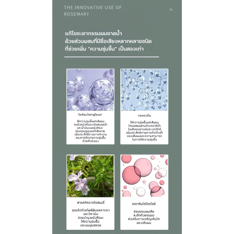 ... วนเกินและสิ่งสกปรกบนเส้นผมและหนังศีรษะได้หลังการสระผมผมจึงสะอาด สดชื่น และมีกลิ่นหอม แชมพู - ขจัดรังแค ขจัดความมัน ขจัดความคัน ปรับสมดุลน้ำมันในผม ทำให้หนังศีรษะแข็งแรง ยกโคนผม ลดผมร่วง ครีมนวด - แก้ผมฟู ผมไม่มีน้ำหนัก ให้ความชุ่มชื้นอย่างล้ำลึกด้วยมอยเจอร์ไรเซอร์ ผมลื่น อ่อนโยน คนเป็นสิว/คนท้องใช้ได้ 480 ml. ใช้ได้ประมาณ 1 เดือน 750 ml. ใช้ได้ประมาณ 3 เดือน แก้ไขชะตากรรมผมขาดน้ำ ด้วยส่วนผสมที่มีชื่อเสียงหลากหลายชนิด ที่ช่วยเพิ่ม "ความชุ่มชื้น" เป็นสองเท่า 【โซเดียมไฮยาลูโรเนต】 ให้ความชุ่มชื้นแก่เส้นผม จนถึงหนังศีรษะปรับสมดุลน้ำ และนํ้ามันบนหนังศีรษะ ซ่อมแซมรูขุมขนที่เสียหาย เพิ่มประสิทธิภาพการทํางาน ของการรักษาความชุ่มชื้น ด้วยตัวมันเอง 【กรดอะมิโน】 ให้ความชุ่มชื้นแก่เส้นผม โดยผสมผสานกับเคราติน้ำ ในเส้นผมผ่านพันระเปปไทด์ เพิ่มประสิทธิภาพการกักเก็บนํ้า ของเส้นผมและความสามารถ ในการให้ความชุ่มชื้น 【สารสกัดจากโรสแมรี่】 อุดมไปด้วยโพลีฟีนอลจากชา และวิตามิน ช่วยบำรุงหนังศีรษะ ให้ความชุ่มชื้น และผมนุ่มสลวย 【เคราตินไฮโดรไลซ์】 ซ่อมแซมผมเสีย ลงลึกถึงแกนผม ส่งเสริมการเจริญเติบโต ของเส้นผม กฎและขั้นตอนการเคลมและคืนสินค้า💕✨ 🩷1.รบกวนถ่ายวีดีโอตอนแกะสินค้าเพื่อใช้ยื่นเคลม ❤️2.หลังจากได้รับสินค้ามีเวลา14วันในการขอคืนสินค้าและคืนเงินเต็มจำนวน ในกรณีที่ 🧡2.1 ทดลองใช้สินค้าครั้งแรกโดย(ตัวTester)ที่แถมไปให้ แล้วไม่พอใจหรือพบอาการแพ้ สามารถขอคืนเงินได้เต็มจำนวนภายในระยะเวลาที่กำหนด หมายเหตุ : สินค้าจริงยังไม่ถูกแกะกล่องหรือจากห่อซีลเท่านั้น 💛3.กรณีที่สินค้าเสียหายจากการขนส่งรบกวนถ่ายวิดีโอตอนแกะเพื่อยื่นเคลมสินค้า 💚4.แคปหมายเลขคำสั่งซื้อหรือหมายเลขออเดอร์ตอนยื่นเคลม 🩵5.จะได้รับเงินตามจำนวนการสั่งซื้อสินค้าที่ต้องการจะเคลม หลังจากตรวจสอบหรือสินค้าถึงมือร้านค้าแล้วเท่านั้น 💙6.ในกรณีที่สินค้าไม่ตรงตามออเดอร์ ผิดไซส์ ส่งผิด รบกวนลูกค้าส่งคืนร้านค้า และร้านค้าจะทำการโอนค่าขนส่งให้หลังจากส่งบิลและแจ้งเลขพัสดุ 💜7.กรุณาทดสอบอาการแพ้ด้วยตัวTesterที่แถมไปให้เช็คอาการแพ้ก่อนใช้สินค้าจริง หากมีการเปิดใช้สินค้าตัวจริงแล้วมีอาการแพ้ต้องการจะเคลมสินค้าคืนเงินทางร้านไม่รับผิดชอบกรณีใดๆทั้งสิ้น